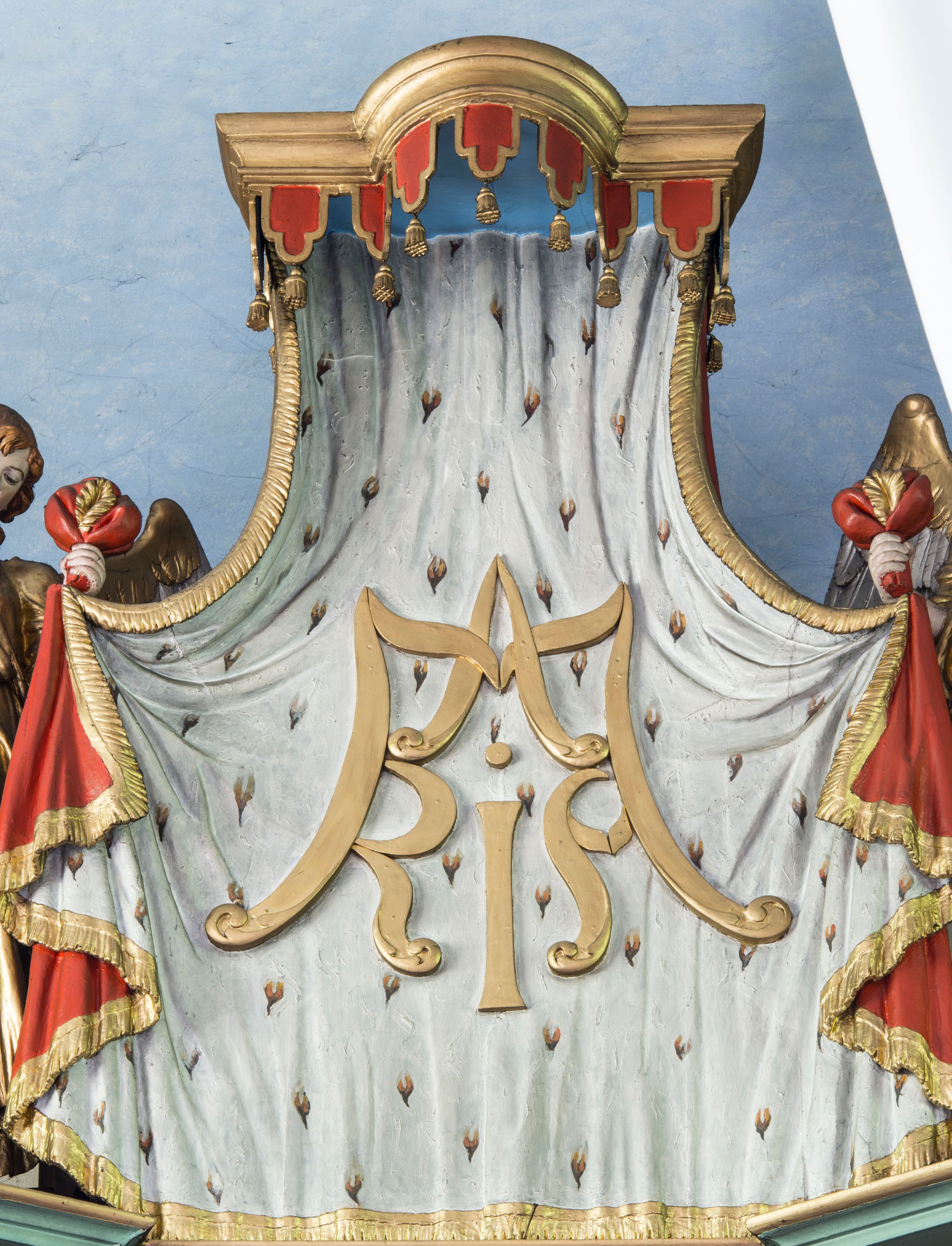The angel from the finial of the high altar in Harbutowice was depicted in a typical iconographic convention as a young man in a long robe, with wings formed of bird feathers. It was carved in 1828 together with the altar erected for the newly built church.