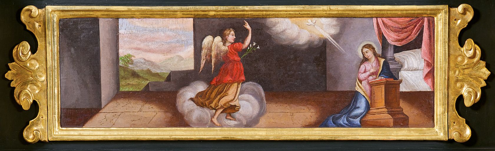 The painting is a work of undetermined authorship. It was probably created in 1636. Although the inscription placed on the painting depicting the Adoration of the Shepherds in the altar of Saint Anne might have been added later, it seems likely that the work in question was done in the second half of the 1630s. The picture shows the scene of the Annunciation, in which Mary is visited by Gabriel the Archangel, announcing her that she was chosen to be Mother of Jesus. The scene is arranged in a manner typical of Western art – Mary kneeling in front of the lectern, on which there is an open book, is visited by Gabriel holding a symbol of chastity in his hand – a lily. The messenger points with his finger at the dove of the Holy Spirit hovering in the upper part of the composition.
