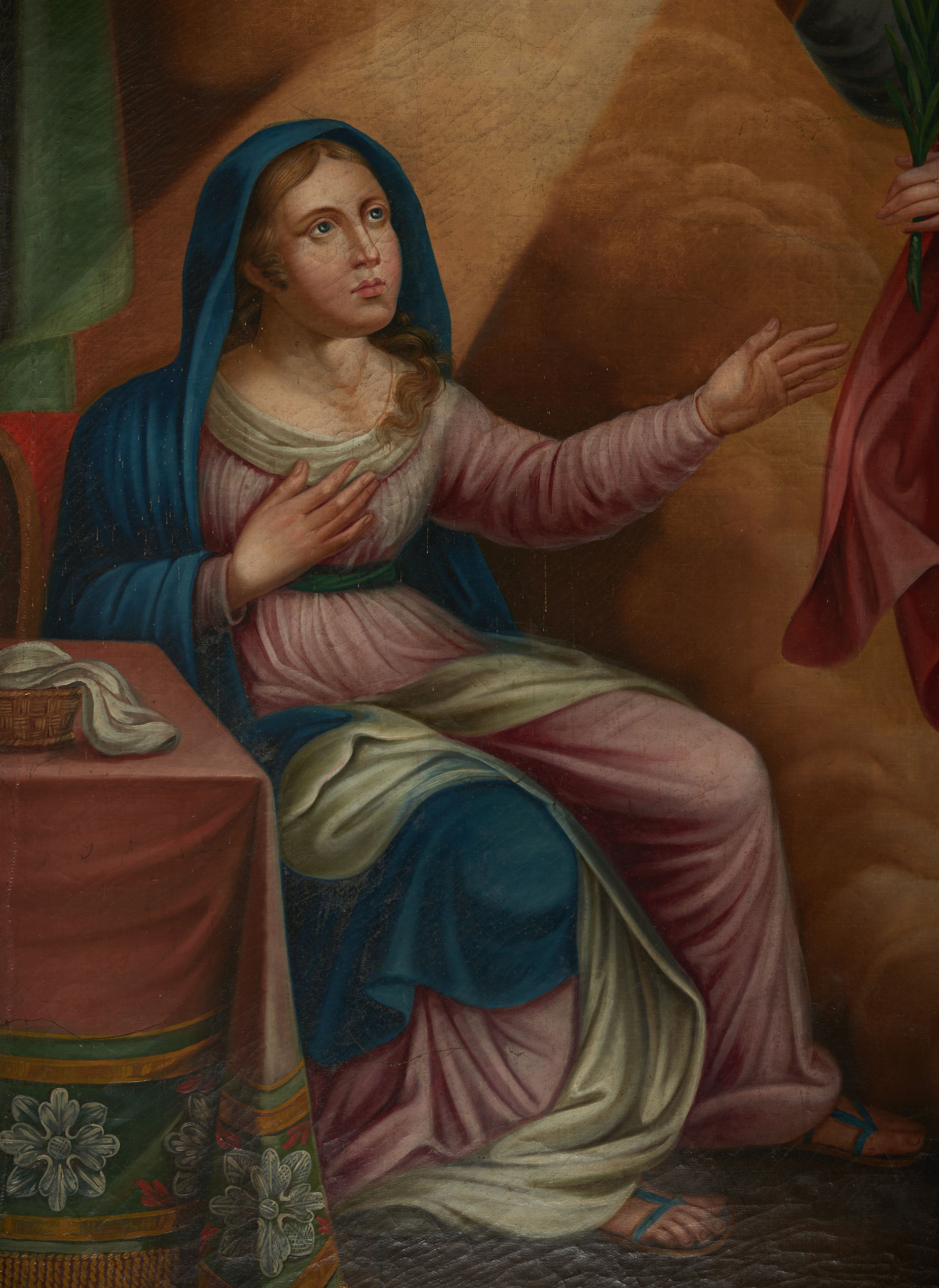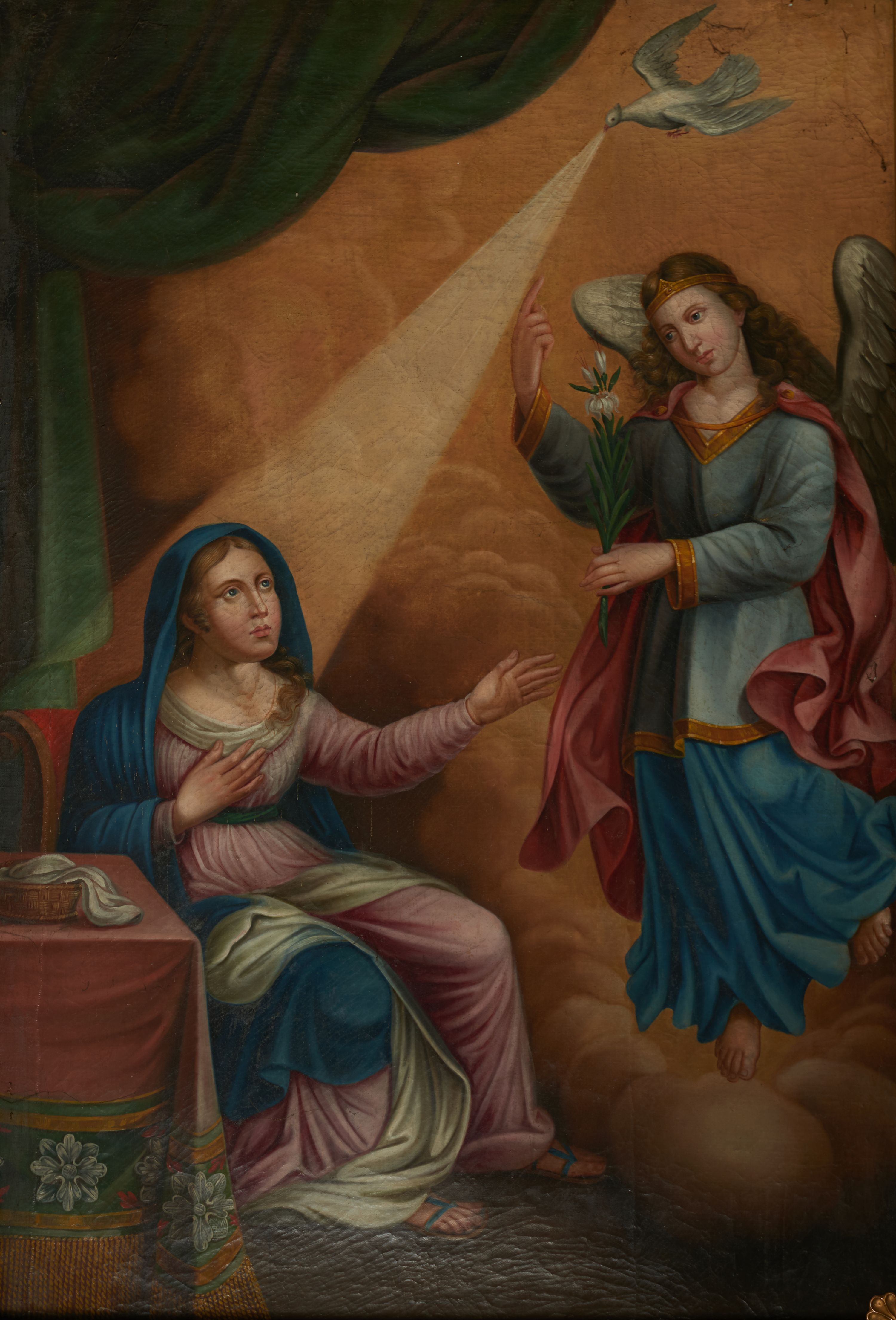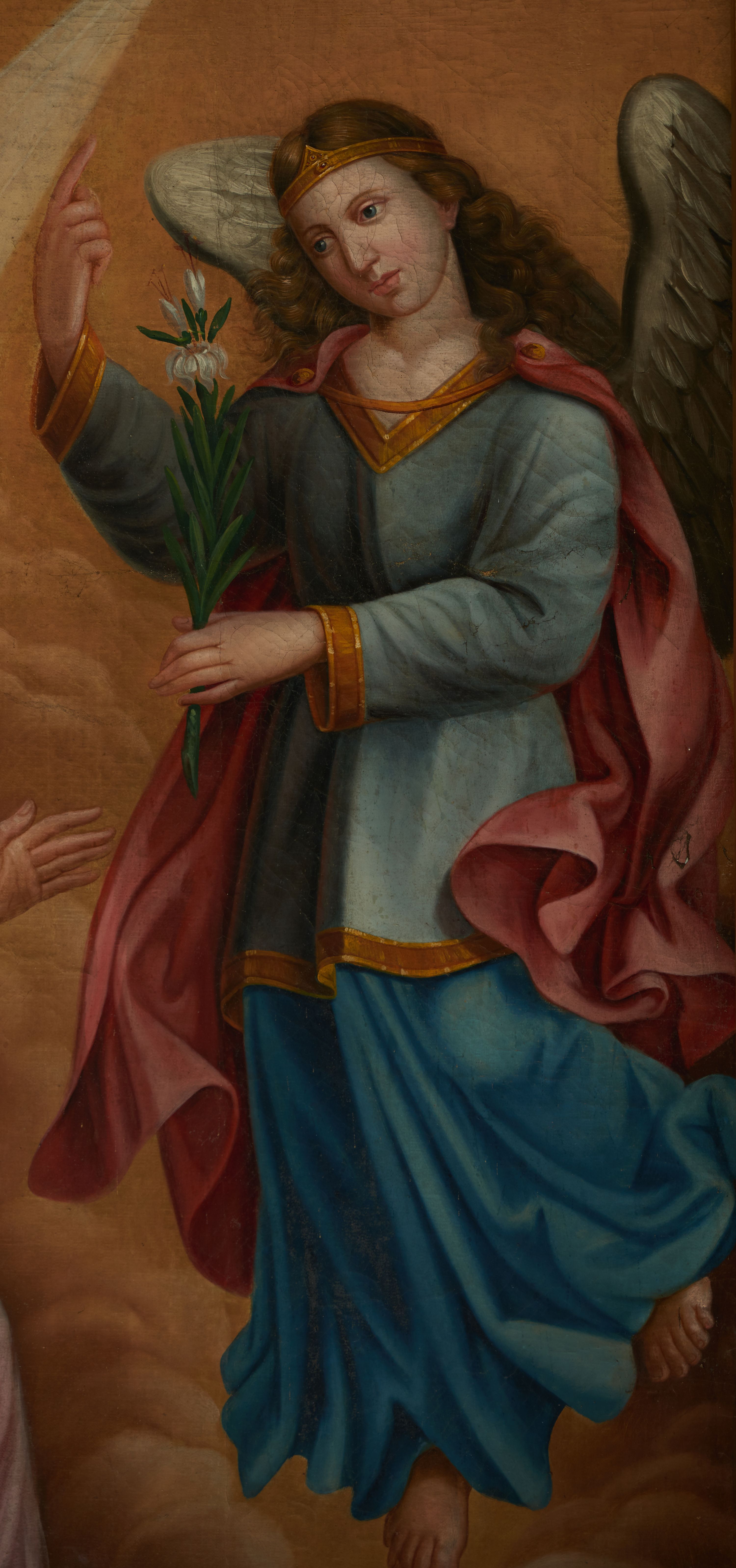 The painting showing the Annunciation may have been created in the fourth quarter of the 18th century or in the first quarter of the 19th century, probably for a Marian altar in the chapel of the church in Biskupice. The Annunciation was a moment when the Incarnation was complete. Thus, it is not only an episode of Mary's life, but one of the most important moments when the God's saving plan was commenced. In visual arts, the illustration of the Annunciation was based on the description of St. Luke the Evangelist (Luke, 1, 26-38).