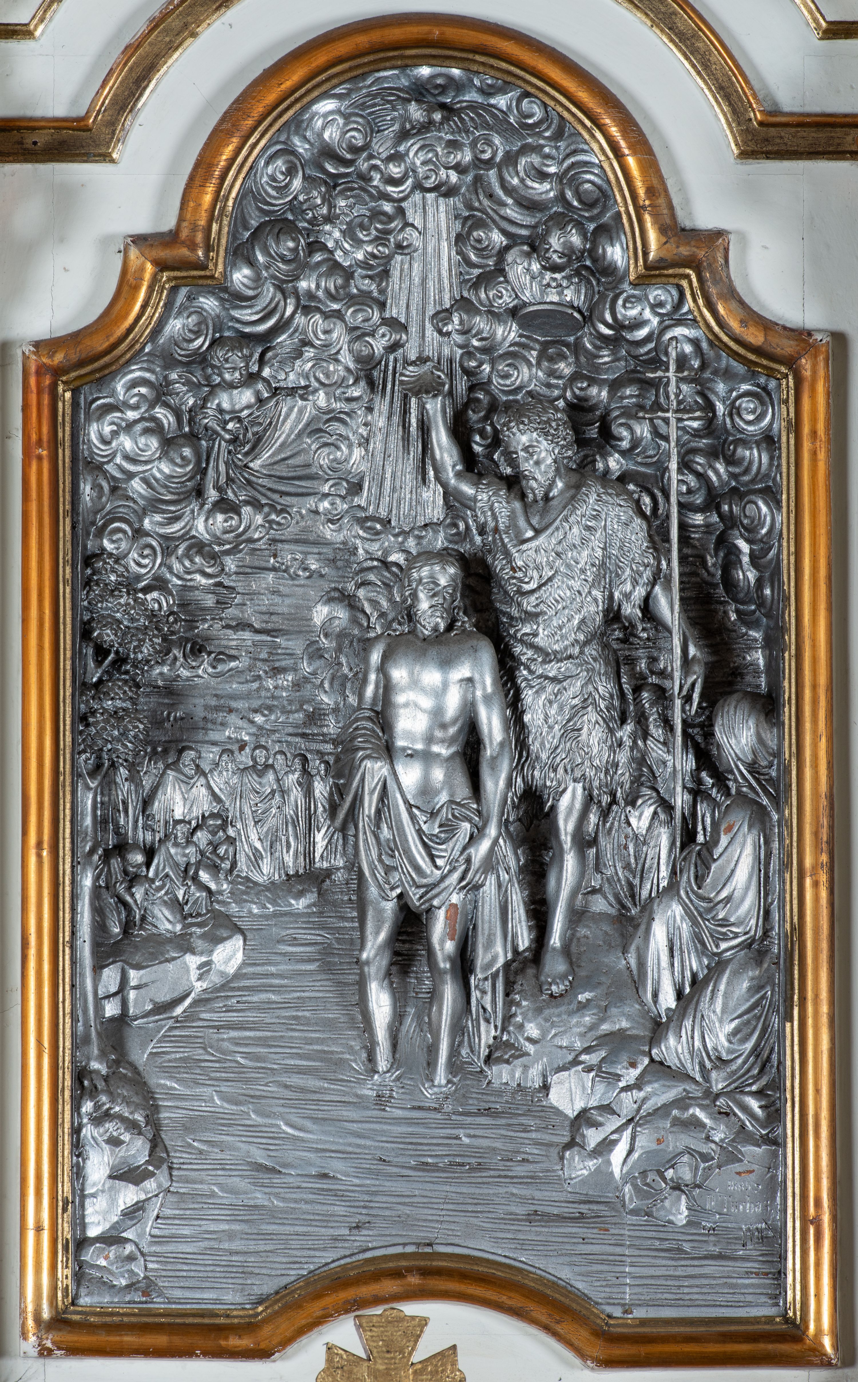 The architectural form of baptismal font was made by Paweł Turbas in 1885. During the last restoration work, the original colour scheme of the work was restored. In the visible picture, the architectural form is white, and after the restoration work from 2017 it is grained with gold-plated profiling and ornamentation. In the main area there is a relief depicting the Baptism of Christ, as well as a carved, half-length angel on the top.