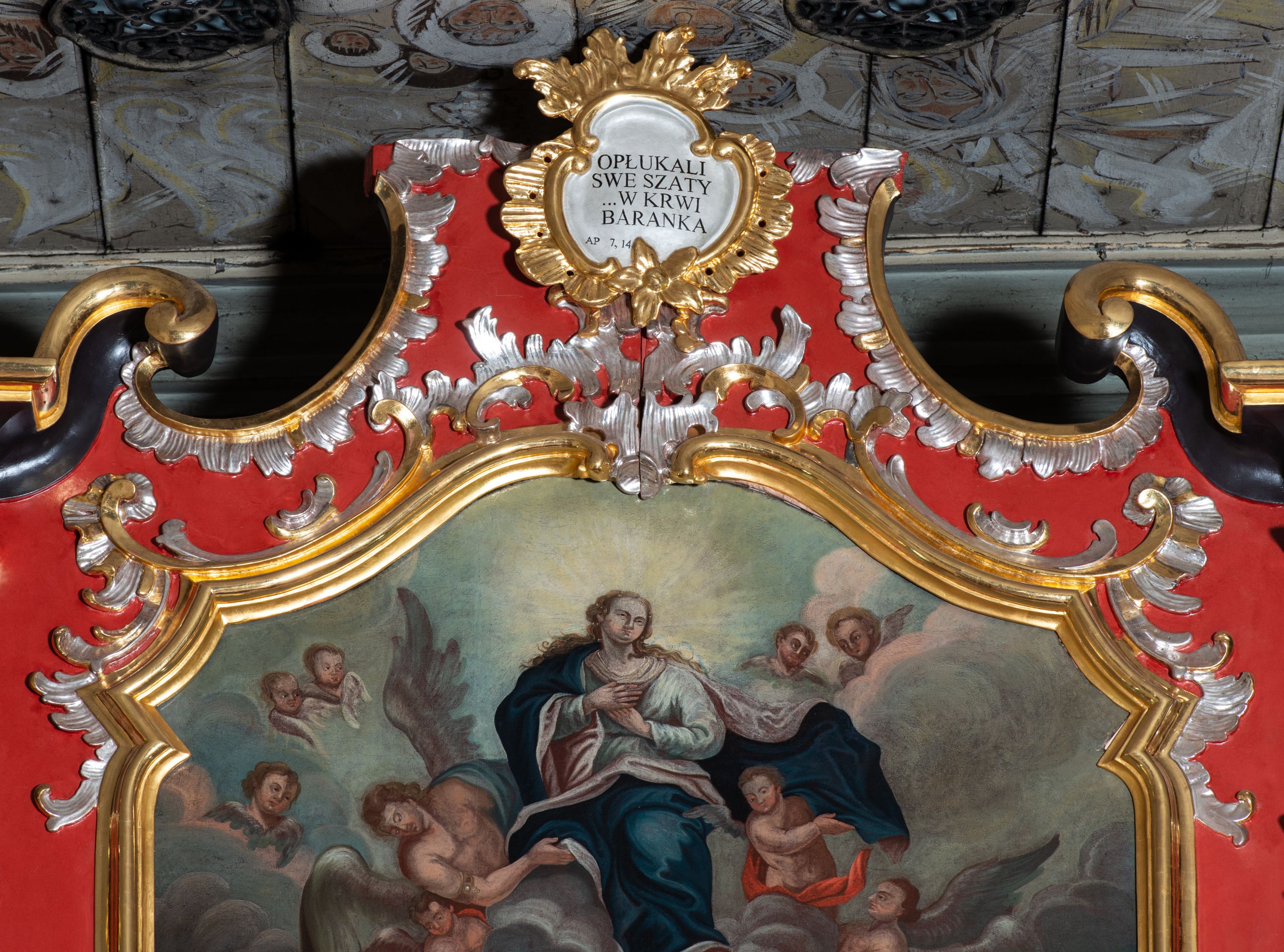 The painting was created in 1775 by an unknown artist to crown the high altar. The painting shows the Assumption of the Blessed Virgin Mary, a privilege given by God to Mary, under which she was taken to heaven with soul and body after the end of her earthly life. The dogma of the Assumption was not announced until 1 November 1950 by Pope Pius XII in the apostolic constitution "Munificentissimus Deus", but testimony about the end of Mary's life already appeared in patristic testimonies, e.g. in "Panarion" by Epiphanius (4th century). The painting presents a typical way of showing this topic in a two-zone art composition in which Mary is lifted up to heaven by angels in the upper part, and the apostles accompany her in the lower part by an empty stone sarcophagus.