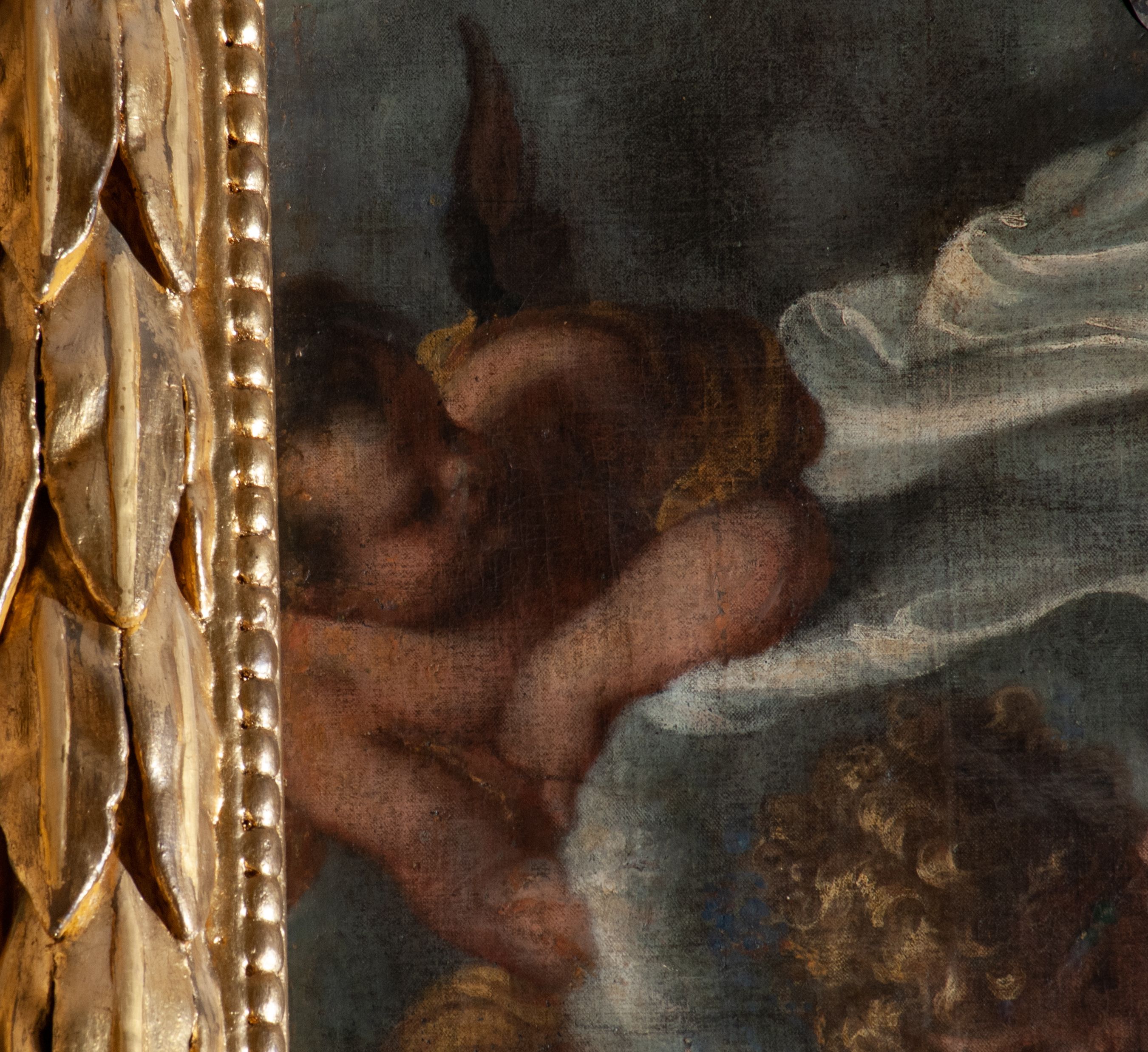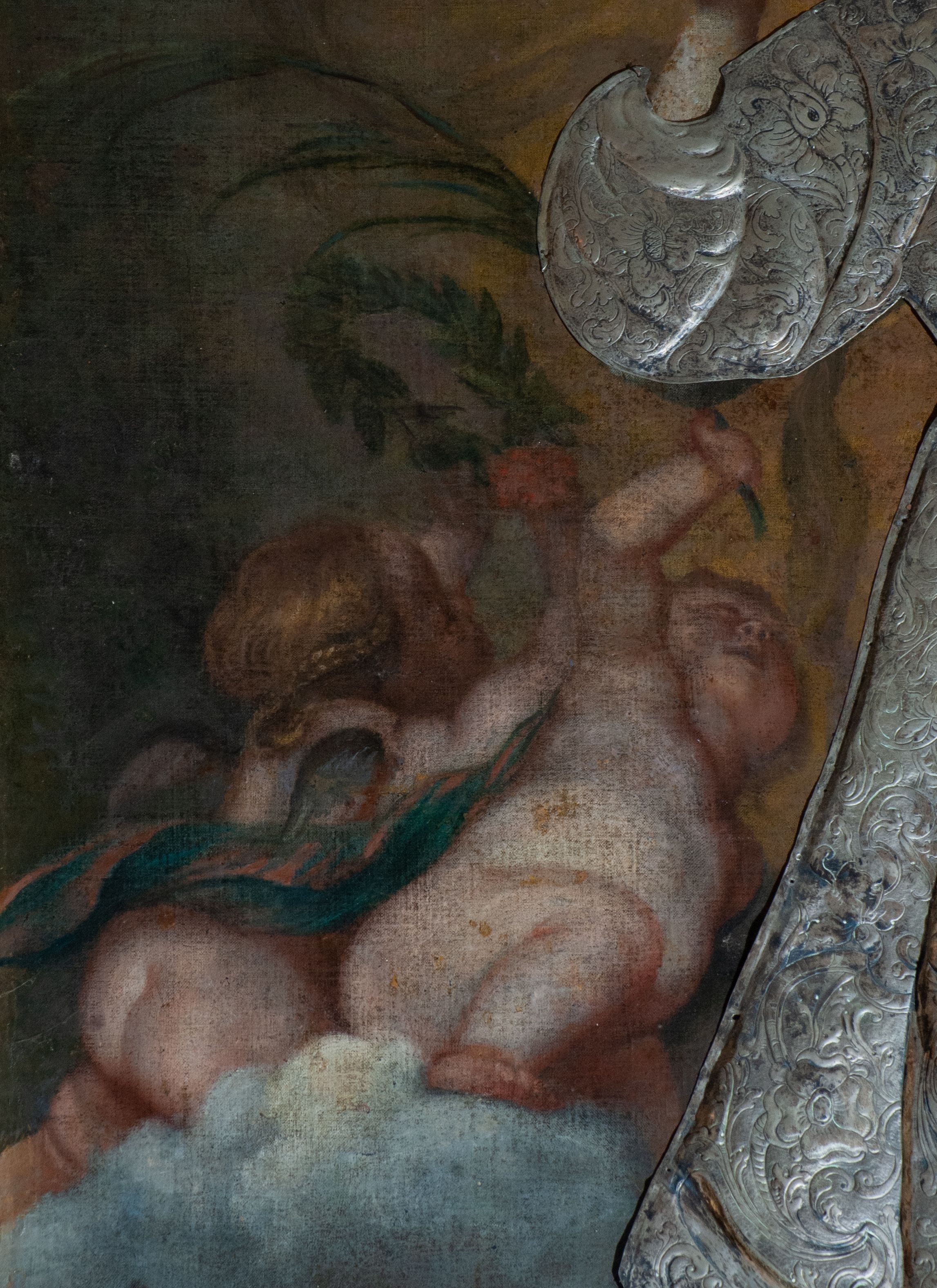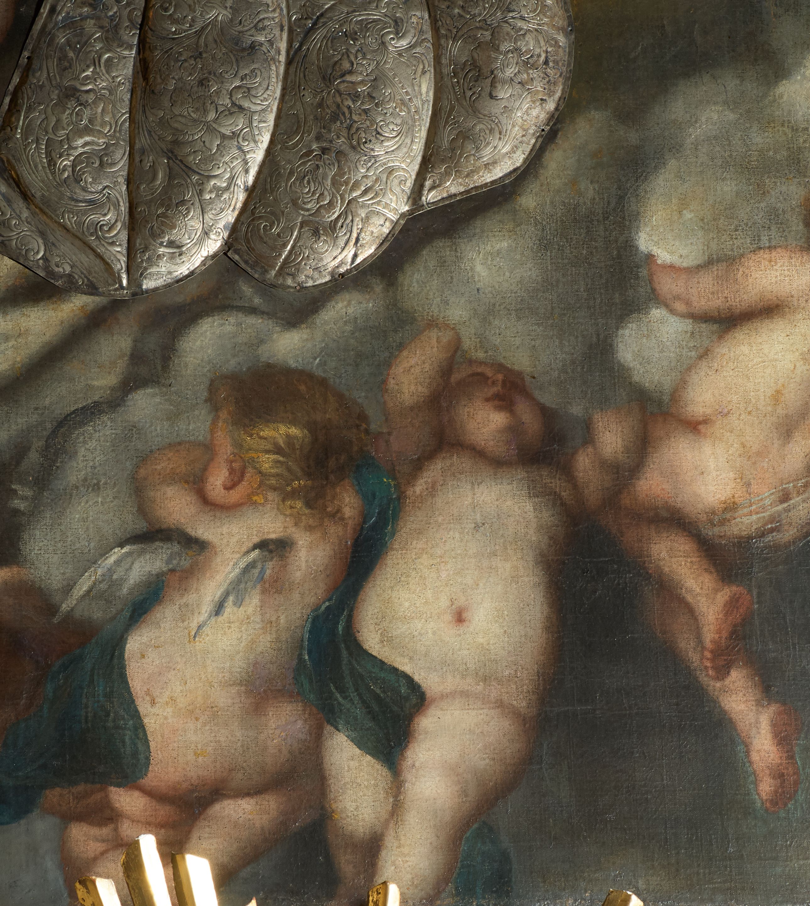 The painting was probably created in the first half of the 18th century. Unfortunately, archival sources do not reveal the author of the work. The closest borrowing of the composition seems to originate from the painting (1611-1614, currently located at the Kunsthistorisches Museum in Vienna) of the Flemish painter Peter Paul Rubens, including a pair of angels holding a wreath and a palm, which constitutes a mirror image and is depicted on the other side of the painting of Biórków.