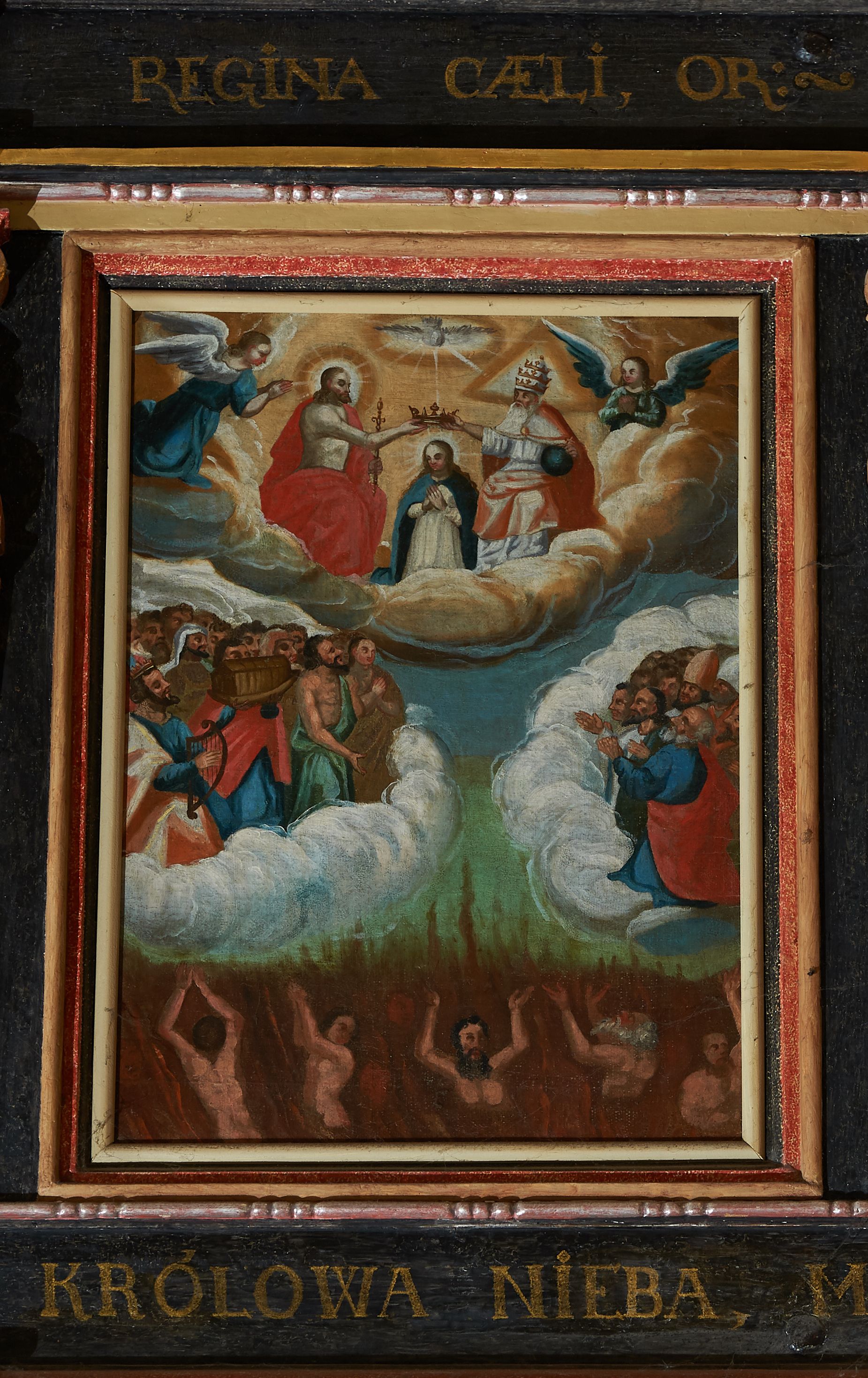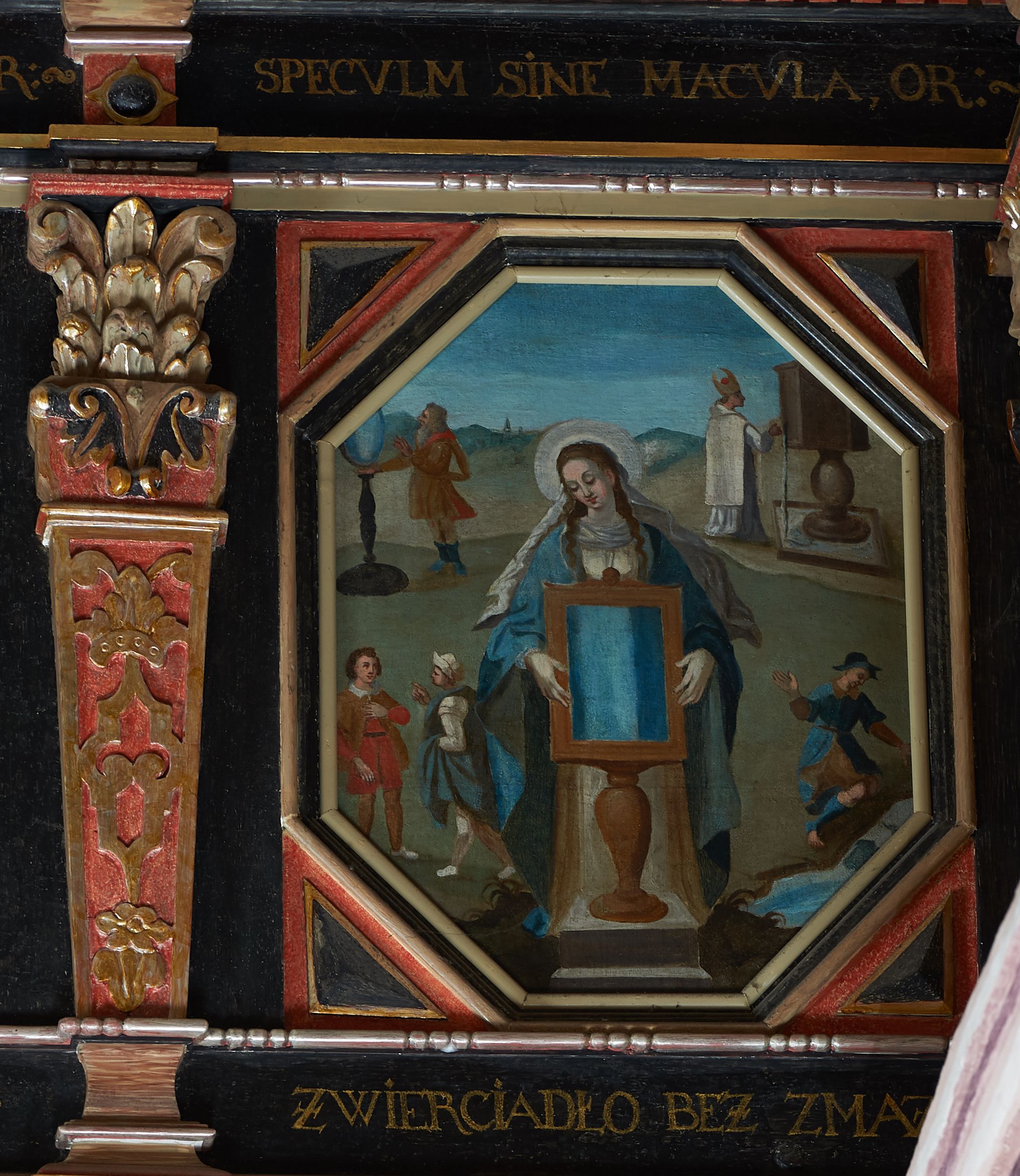A porch with a balustrade decorated with scenes from the Litany of the Blessed Virgin Mary was made in Mannerist style in the 17th century. In total, 37 scenes depicting invocations from this litany were portrayed on the balustrade in the church in Brody.