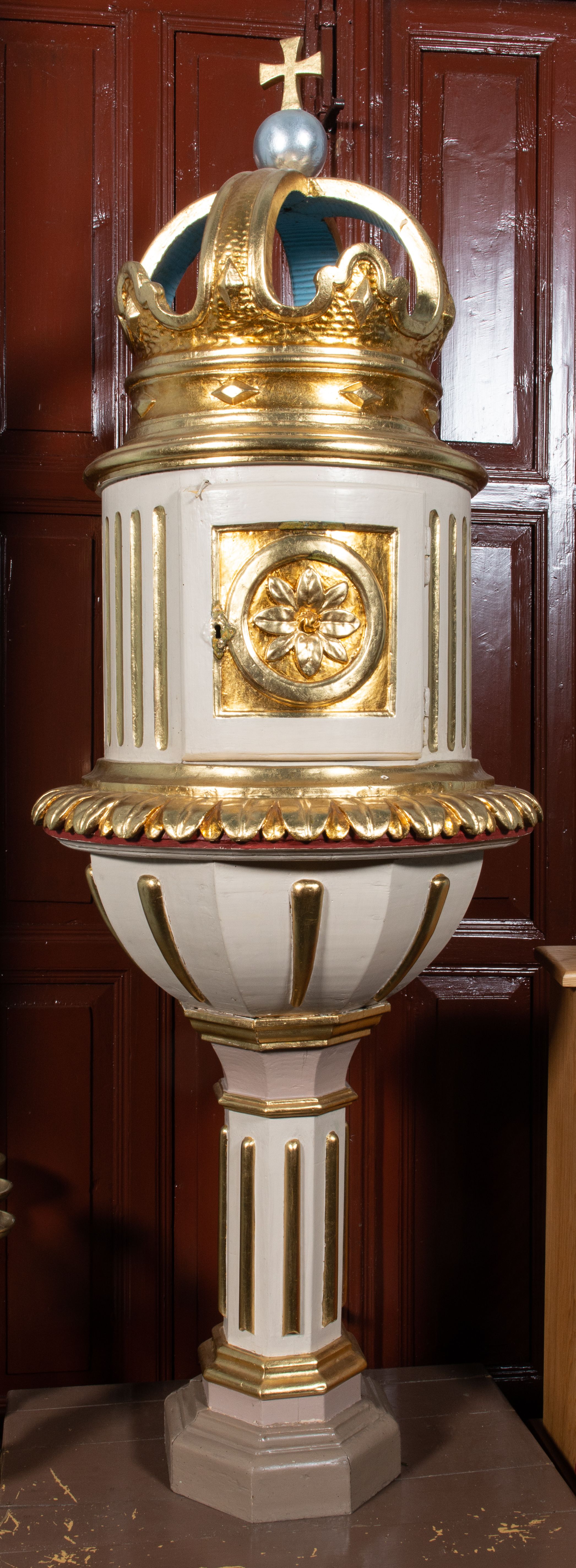 The baptismal font was created in the first quarter of the 20th century. It belongs to the typical works representing this branch of artistic craft. It was made in the baroque tradition, but with strongly changed proportions and overly stylized elements.
