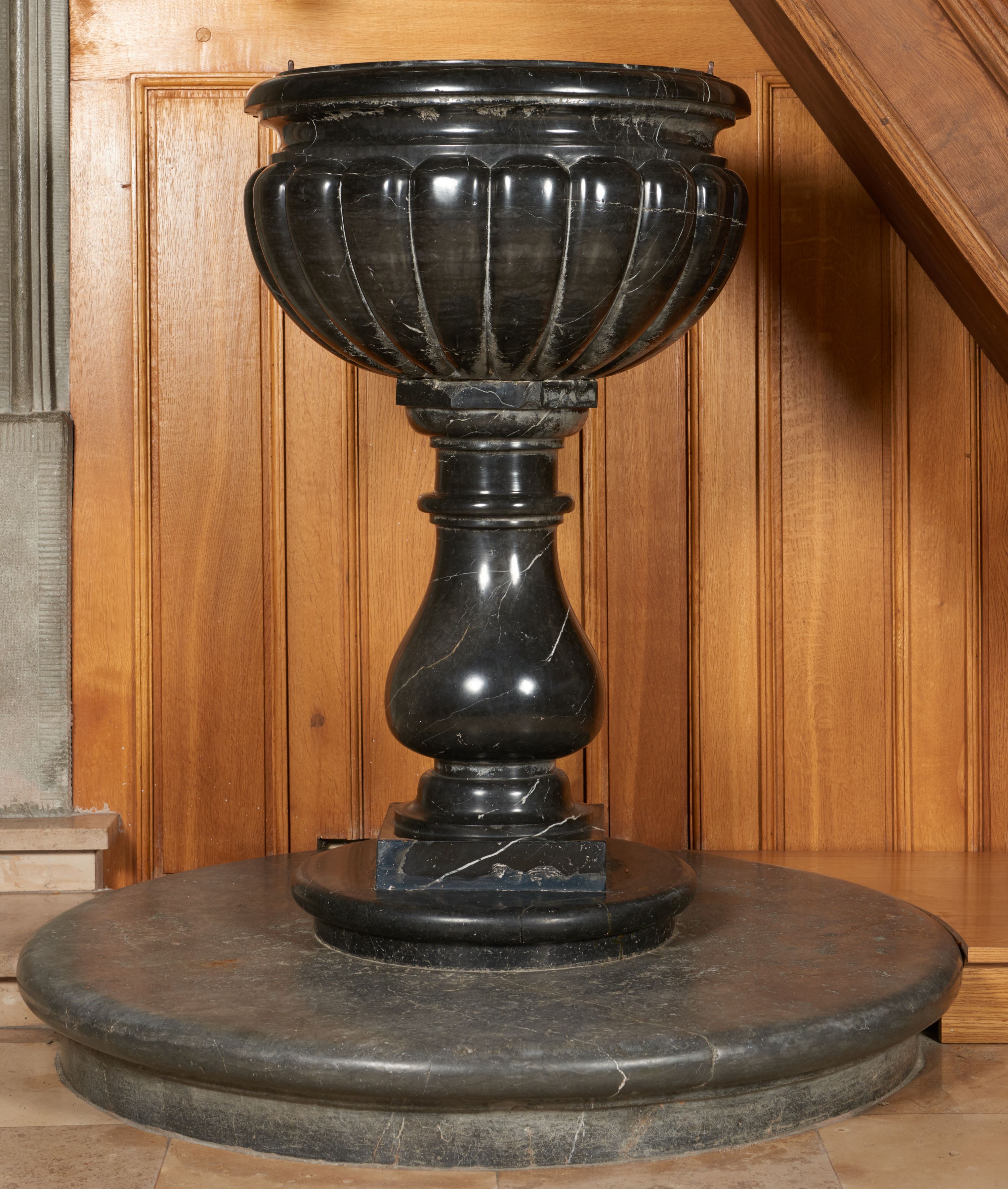Baptismal font, made of black Dębnik marble in the second half of the 17th century (with a wooden cover from 1934), is a typical product of the stonemasonry centre in Dębik near Krzeszowice, whose quarries were the property of Discalced Carmelites in Czerna.