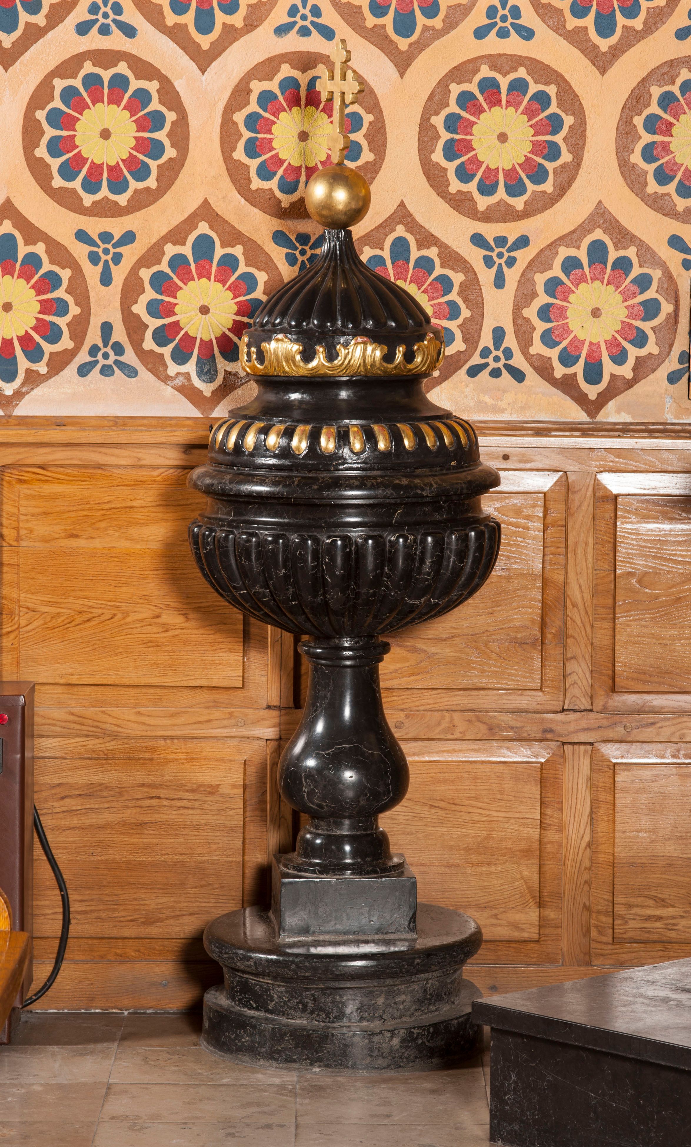 The baptismal font, made of black Dębnik marble, probably at the turn of the 17th and 18th centuries, belongs to the typical products of the stonemasonry centre in Dębnik near Krzeszowice, whose quarries were the property of Discalced Caramelites in Czerna.
