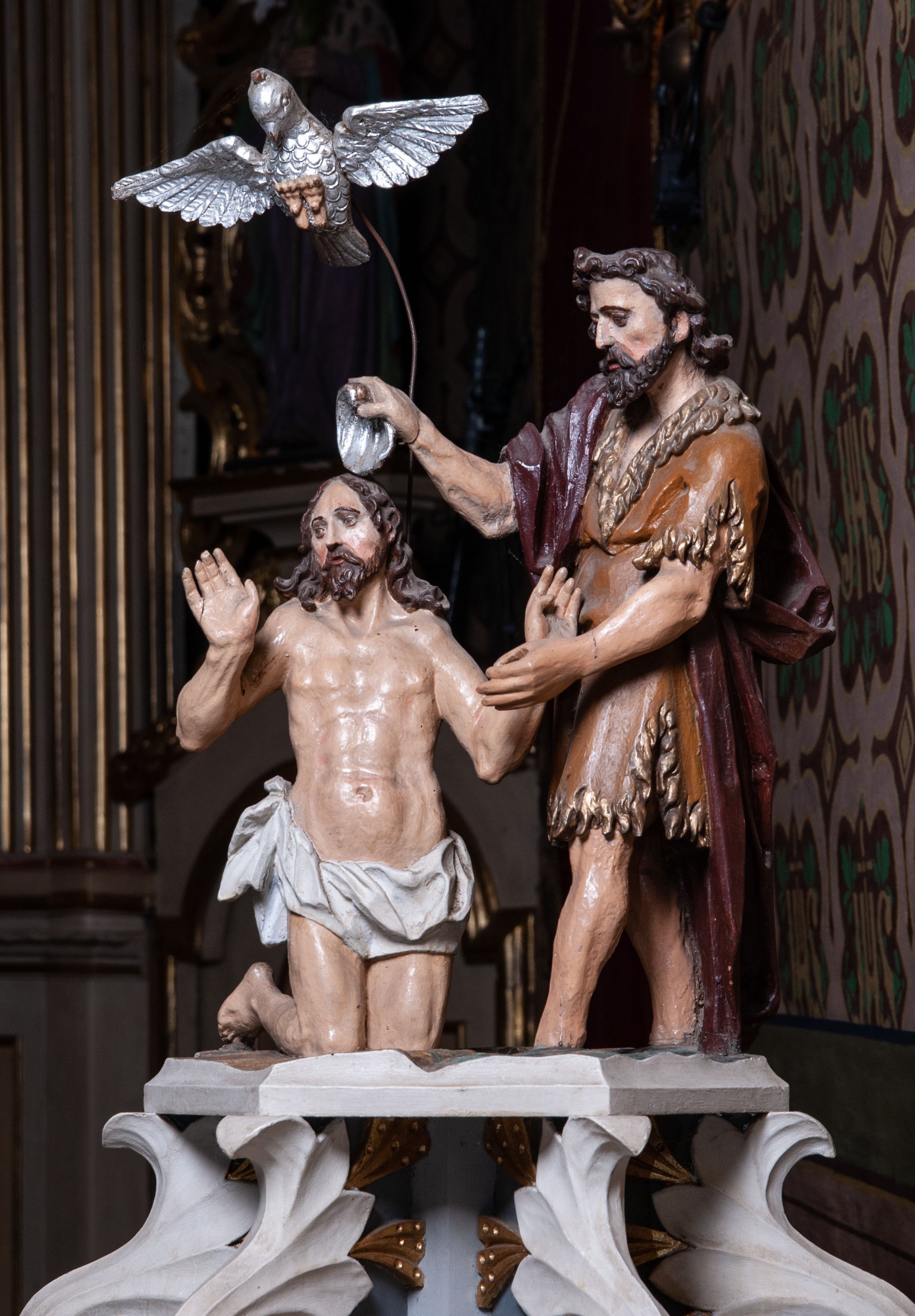 The baptismal font cover is decorated with a sculptural group depicting the Baptism of Christ, imagined according to the description of St. Matthew's Gospel. Unfortunately, archival sources do not reveal the author of the sculpture. The baptismal font was funded by father Walenty Bańkowski, the parish priest of the parish in 1777-1801. It was mentioned in the records of the episcopal visitation in 1783, which shows that it was created between 1777 and 1783.