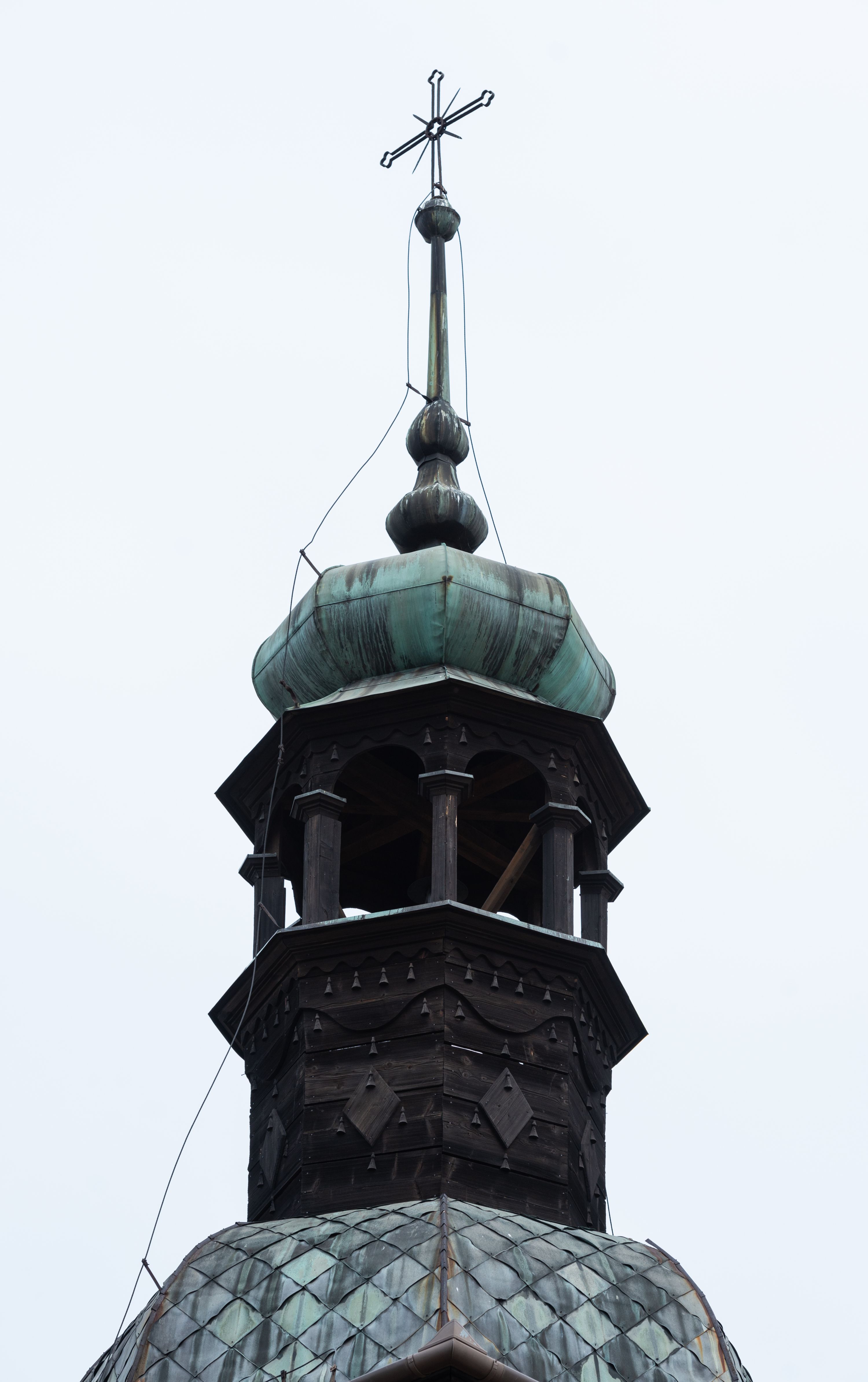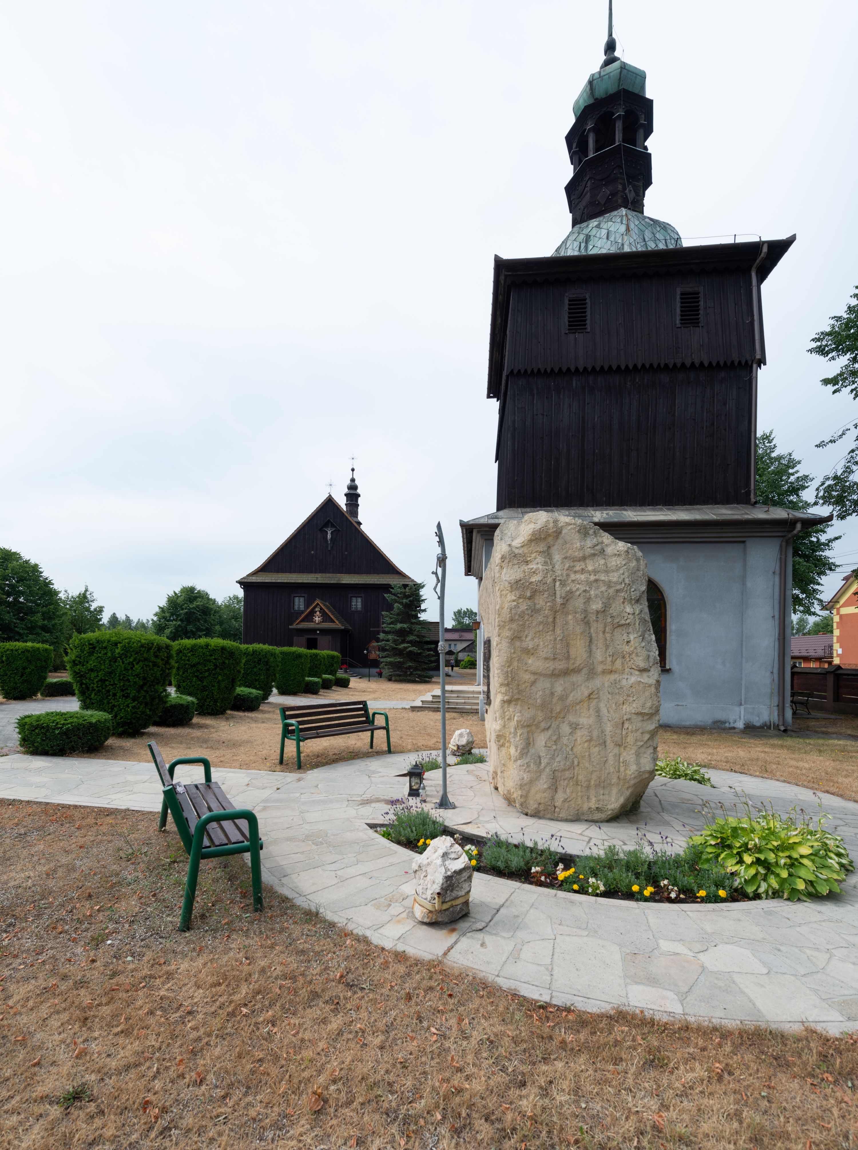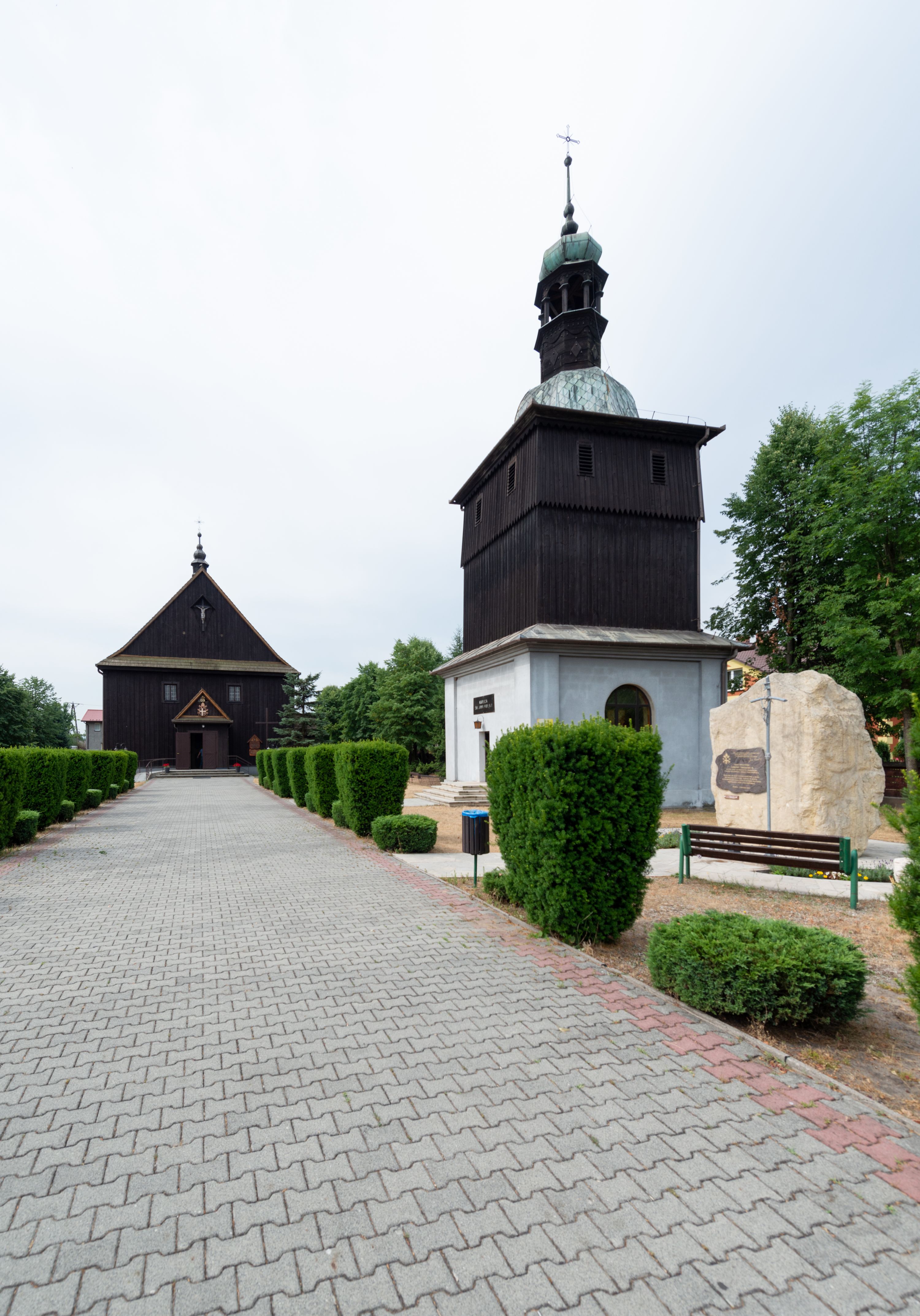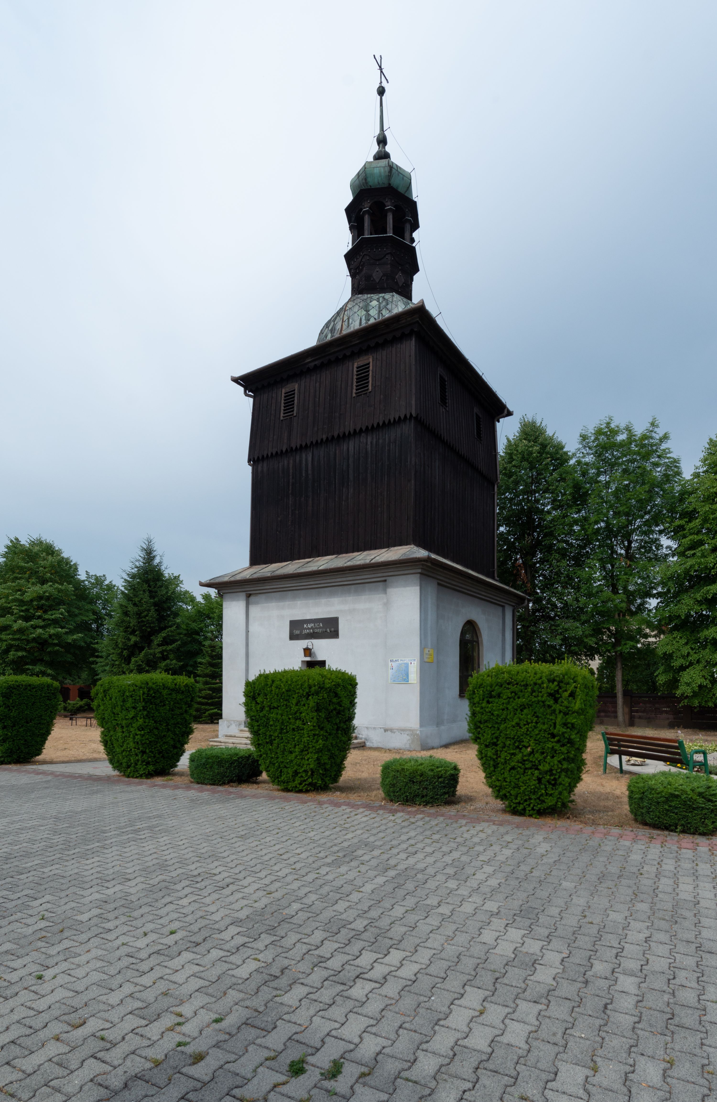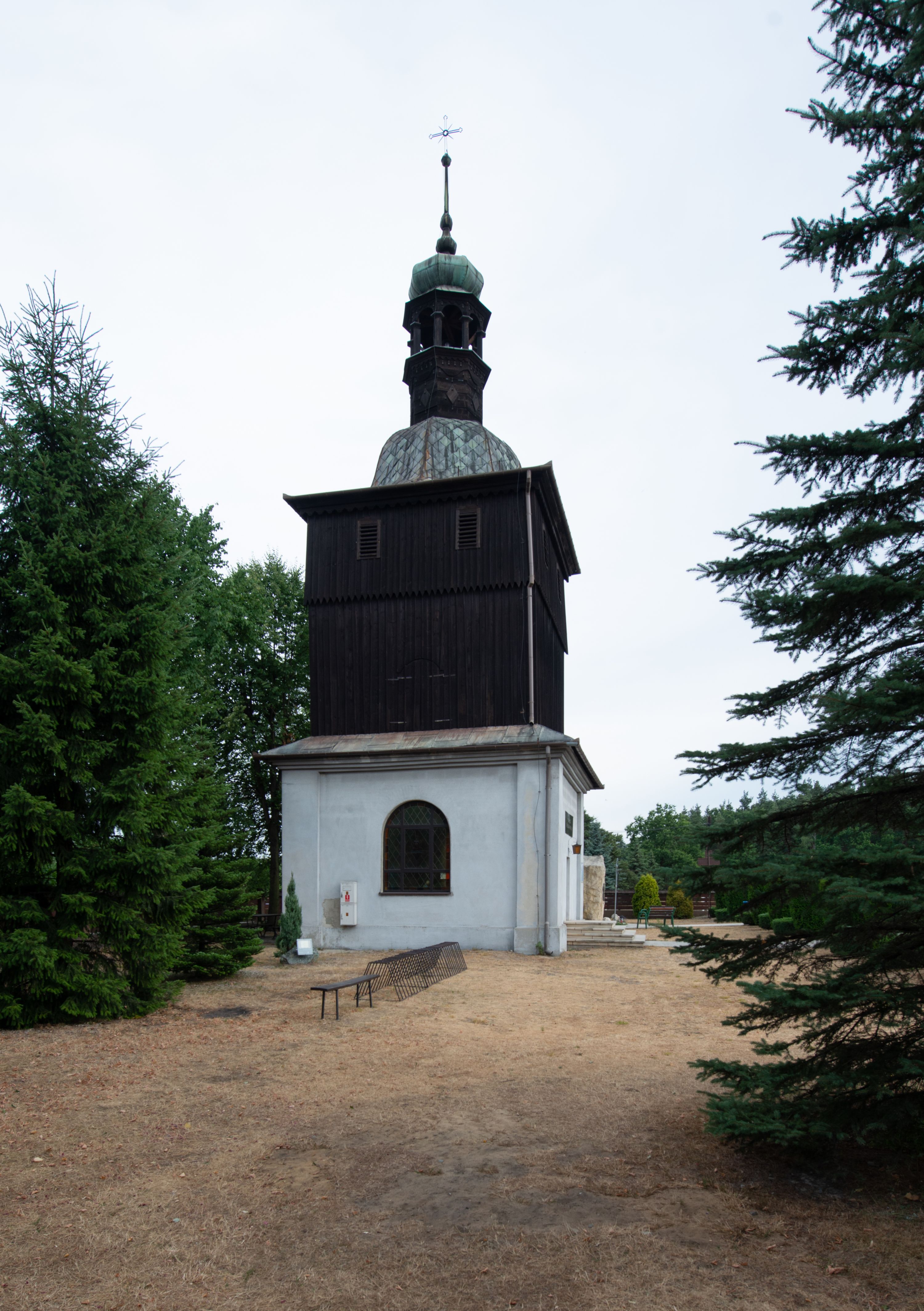 A free-standing chapel in Mętkowo was built by highlanders from Spiš between 1972 and 1974. The chapel is a square building. It is bricked to the half of its height and then wooden, topped with a tented roof with a lantern. It is modelled on a similar building in Niegowić. After moving the church from this village, as it had no tower, it was decided to build a free-standing bell tower repeating the form of the bell tower in Niegowić. Its lower tier constitutes a chapel while in the upper tier bells were hung.