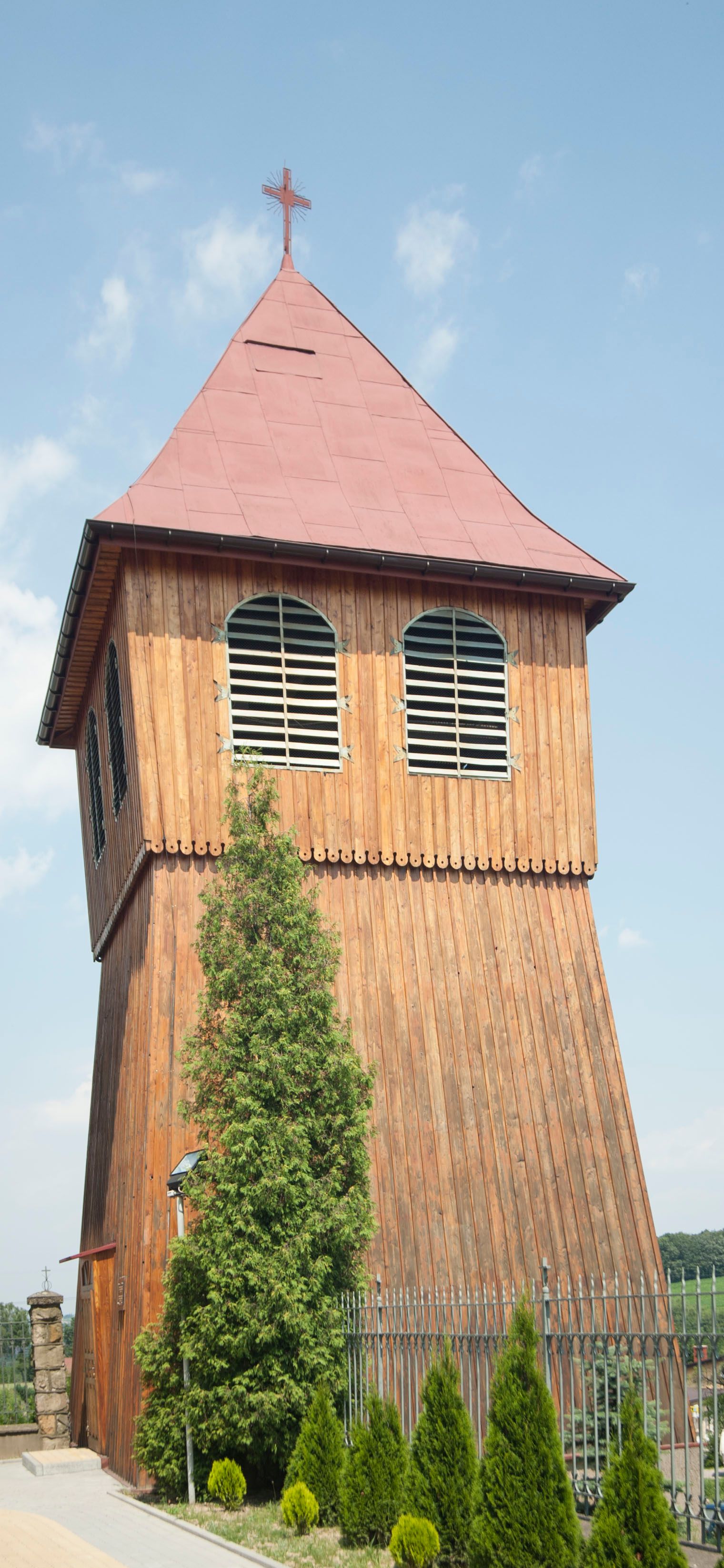The bell tower was created in 1958. The building in its appearance refers to the 17th century bell towers (older examples are not known). The towers were built as square buildings, with sloping walls, with overhung starling, bell attic which made them look like medieval, fortified forms. Thanks to that their character was determined as gothic. It was also highlighted by the tent-like or pyramid spire, which was also reconstructed in the belfry in Gorzków.
