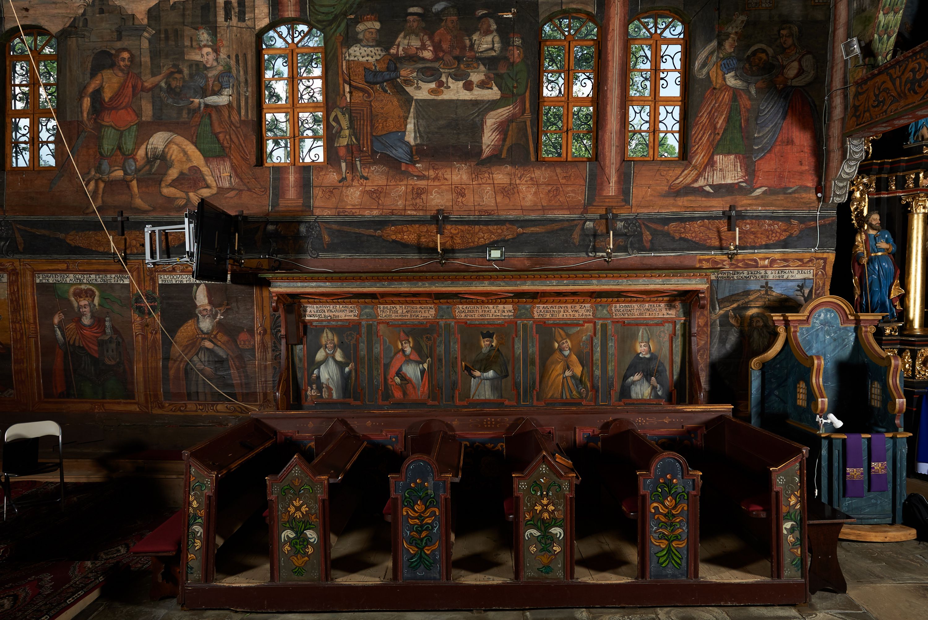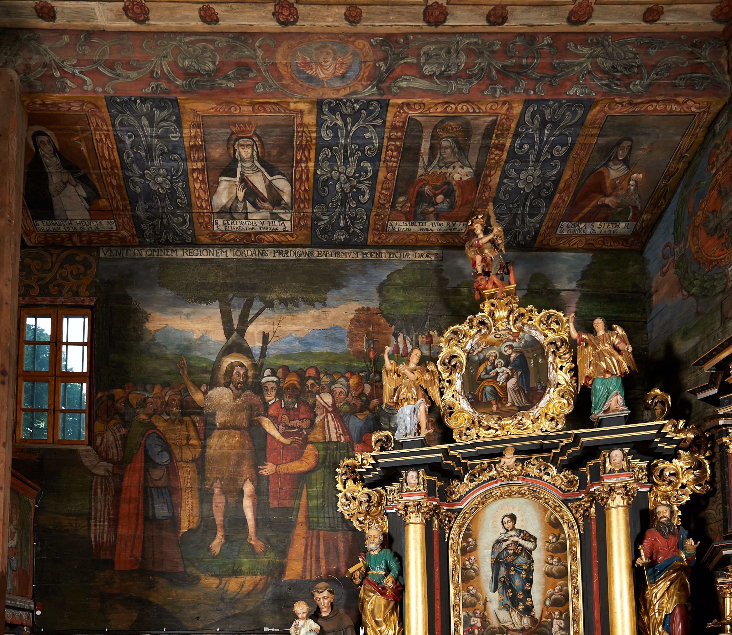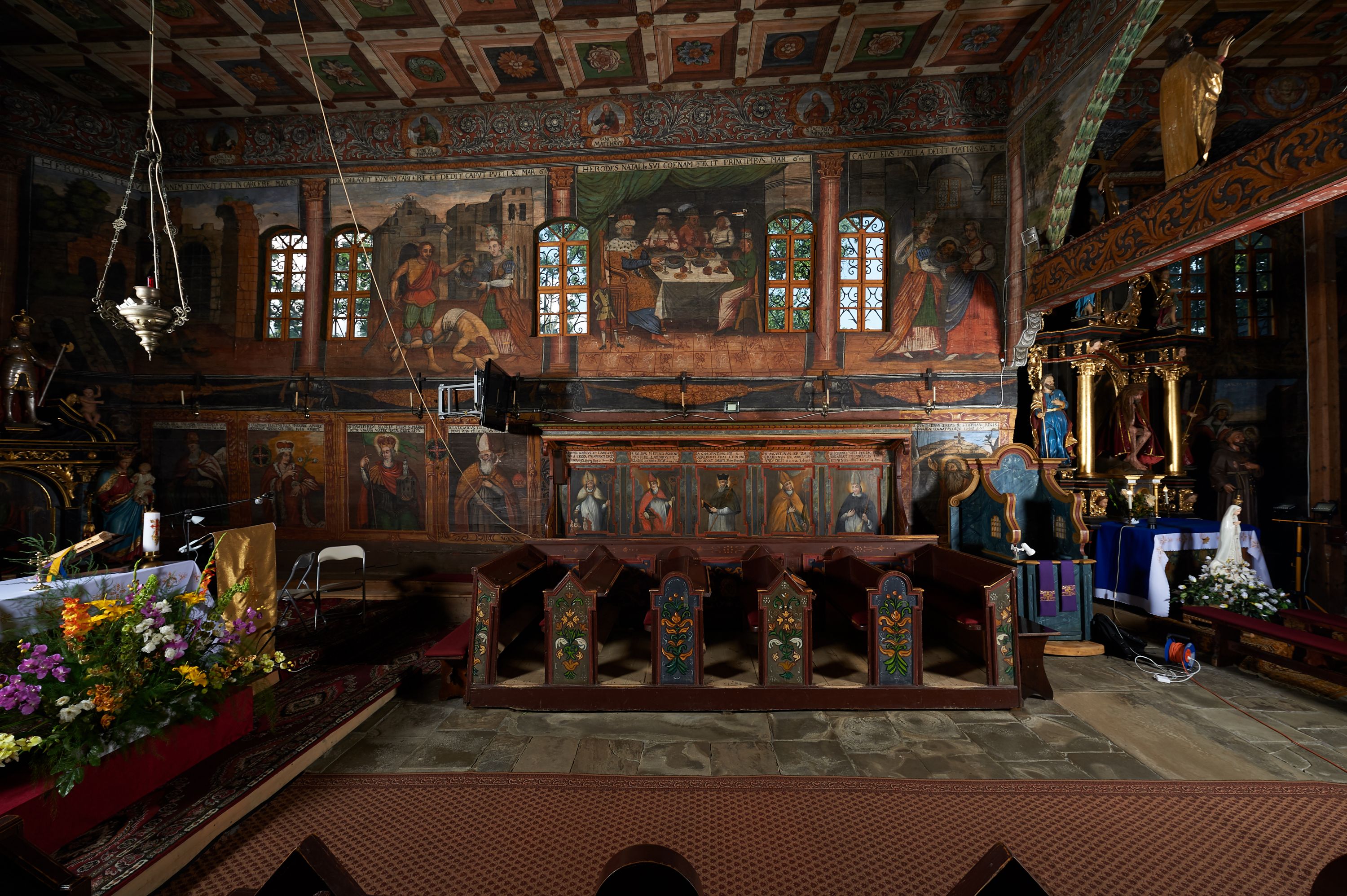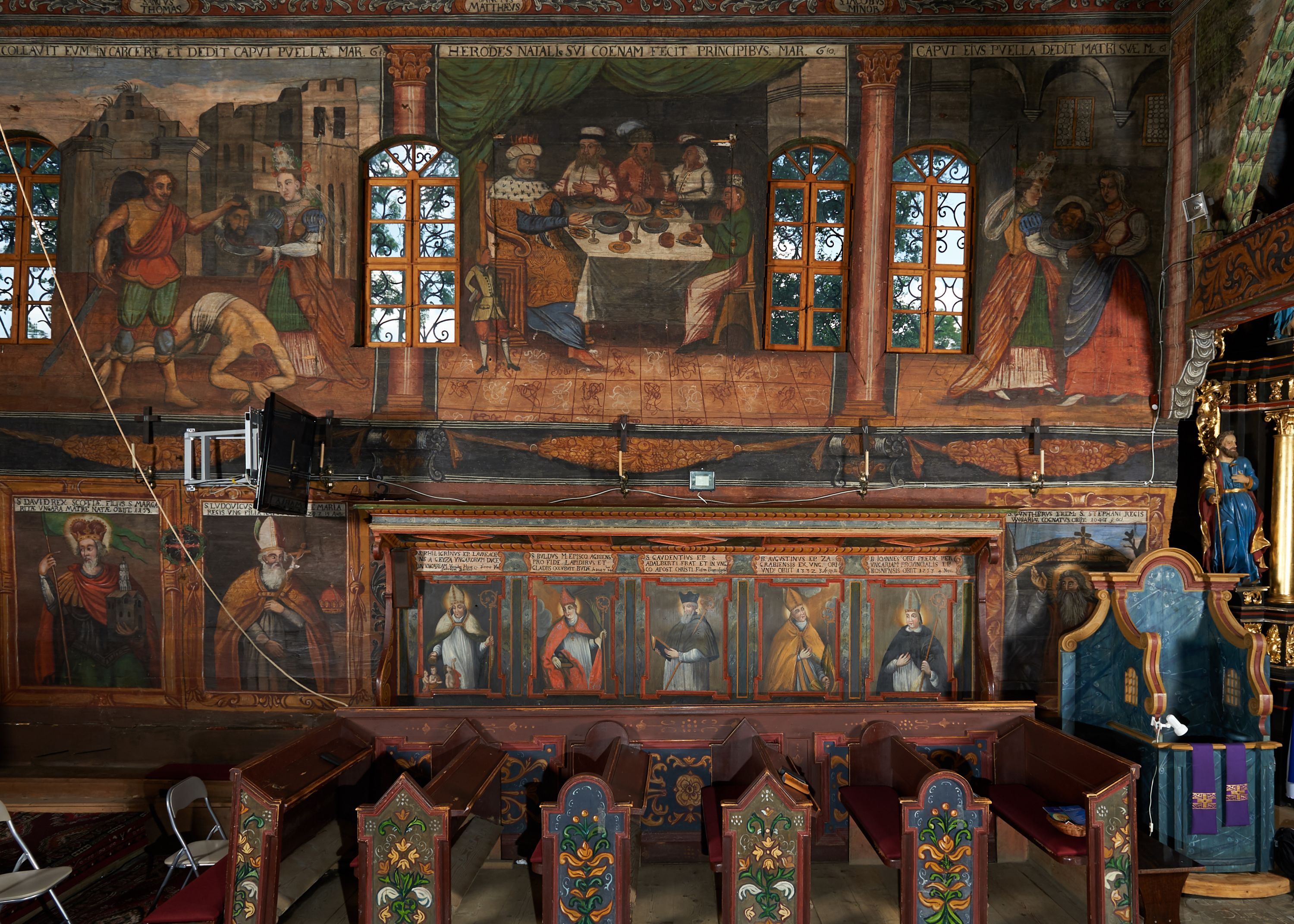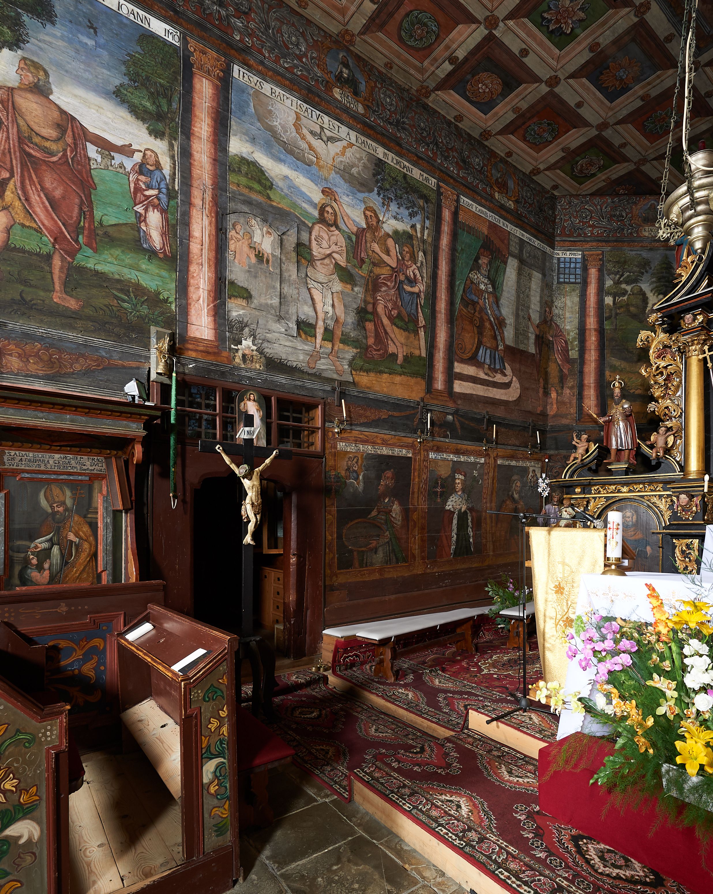 The wall polychrome of the church was created by anonymous painters in several stages. It is assumed that in the years 1656 to 1711. The most important paintings include 14 paintings depicting scenes in Saint John the Baptist's life. The second series of polychromes includes 49 images of saints and blessed people connected with the history of Christianity in Hungary: 4 kings, 2 princes next to the altar, 11 bishops and St. Gunther at the bottom of the chancel's walls, another 15 saints and blessed people (conventuals, martyrs and hermits) under the organ front in the nave on the northern wall and on choir on the western wall. There are also 16 women on the roof truss in the nave, under the ceiling. This part of the polychrome was probably made in 1711, as this date can be seen on the rood beam. The subsequent series of polychromes is the Ten Commandments, painted on the choir front. It depicts keeping or breaking the commandments. These are pictures in lives of peasants, burghers, petty nobility and manor houses in the 17th/18th centuries. Polychrome is all the more valuable as it is the first presentation of a national costume of Orava. The devil was also imagined in six scenes.