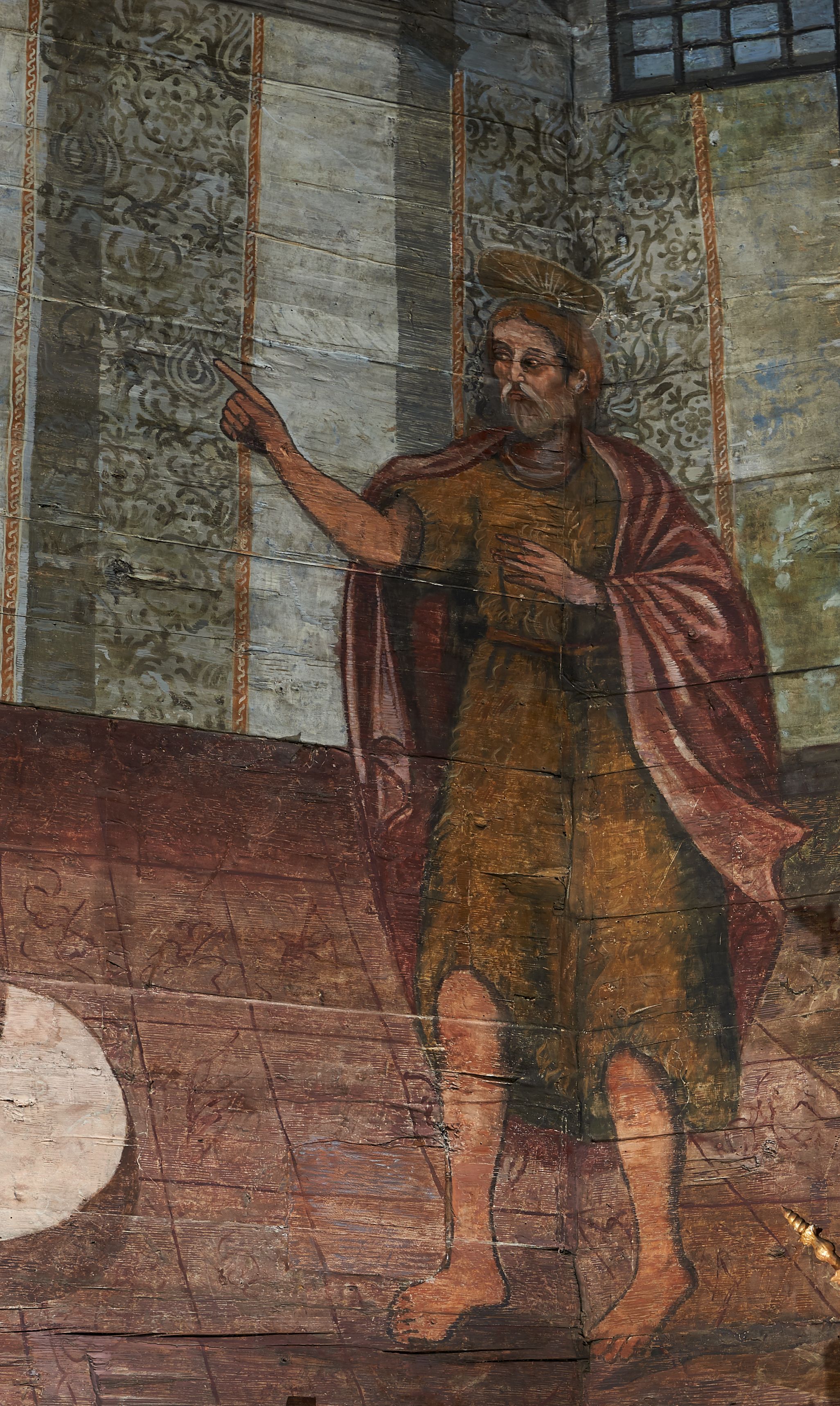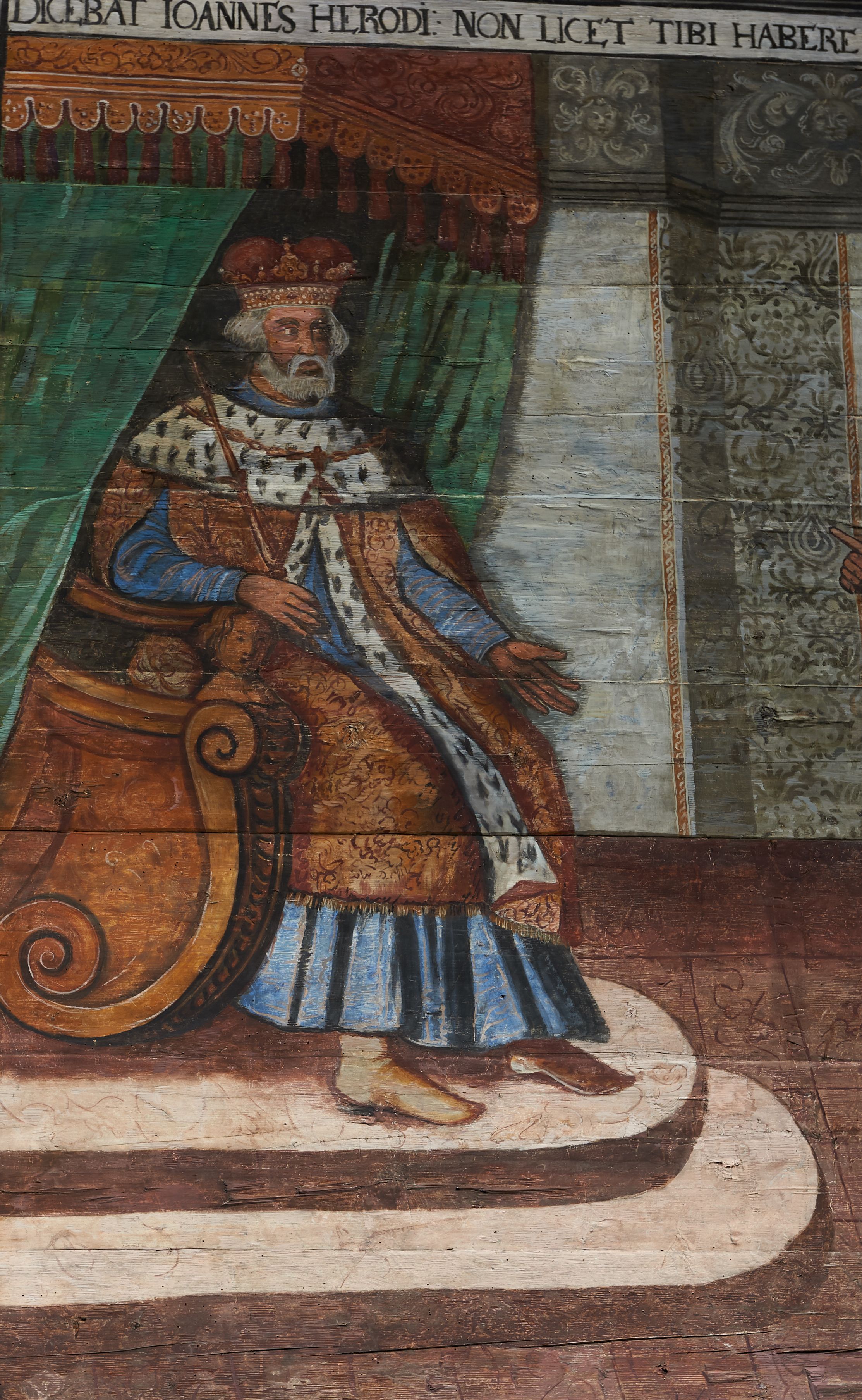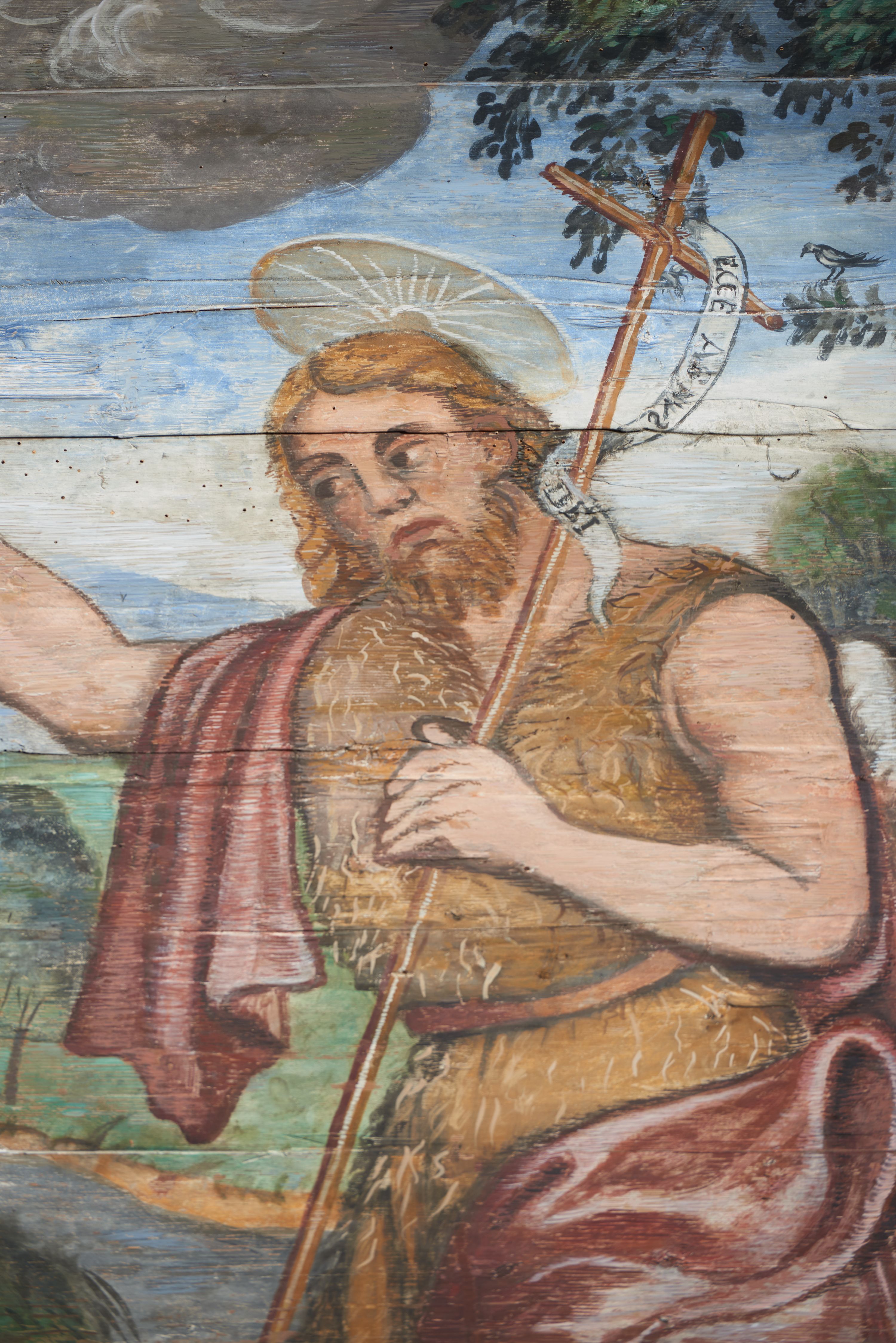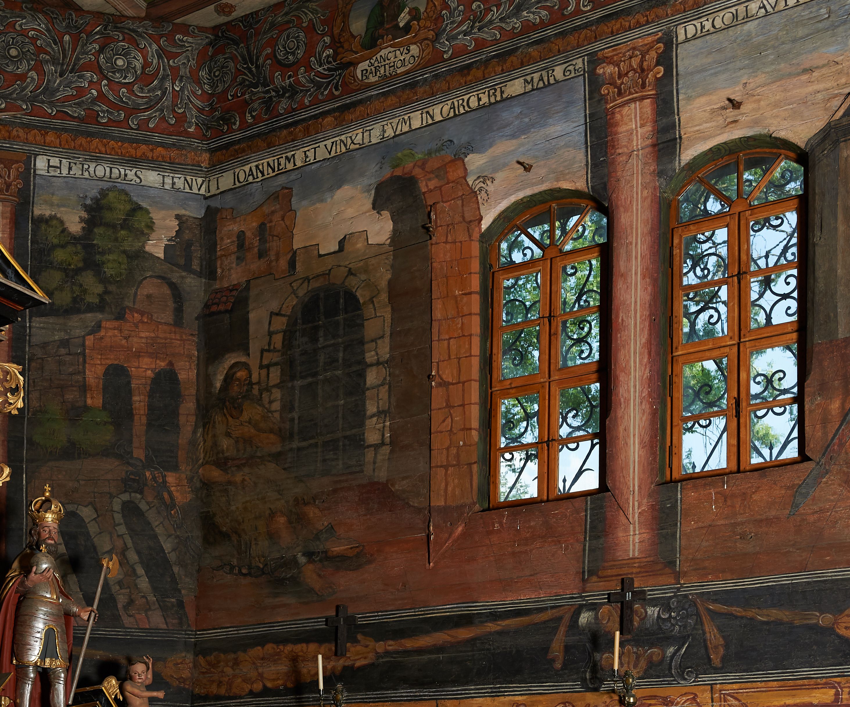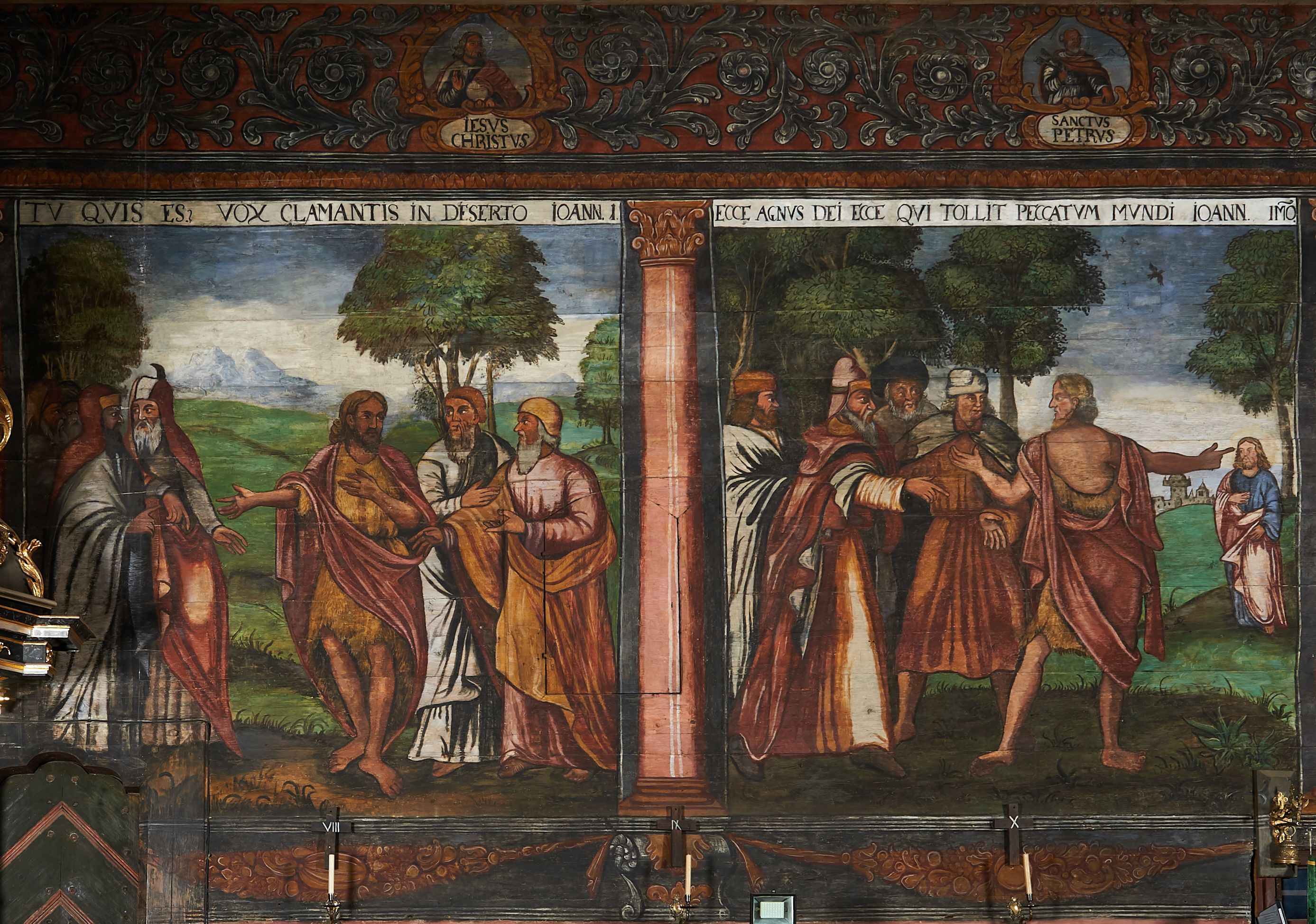 The wall polychrome of the church was created by anonymous painters in several stages. It is assumed that in the years 1656 to 1711. The most important paintings include 14 paintings depicting scenes in Saint John the Baptist's life. The second series of polychromes includes 49 images of saints and blessed people connected with the history of Christianity in Hungary: 4 kings, 2 princes next to the altar, 11 bishops and St. Gunther at the bottom of the chancel's walls, another 15 saints and blessed people (conventuals, martyrs and hermits) under the organ front in the nave on the northern wall and on choir on the western wall. There are also 16 women on the roof truss in the nave, under the ceiling. This part of the polychrome was probably made in 1711, as this date can be seen on the rood beam. The subsequent series of polychromes is the Ten Commandments, painted on the choir front. It depicts keeping or breaking the commandments. These are pictures in lives of peasants, burghers, petty nobility and manor houses in the 17th/18th centuries. Polychrome is all the more valuable as it is the first presentation of a national costume of Orava. The devil was also imagined in six scenes.