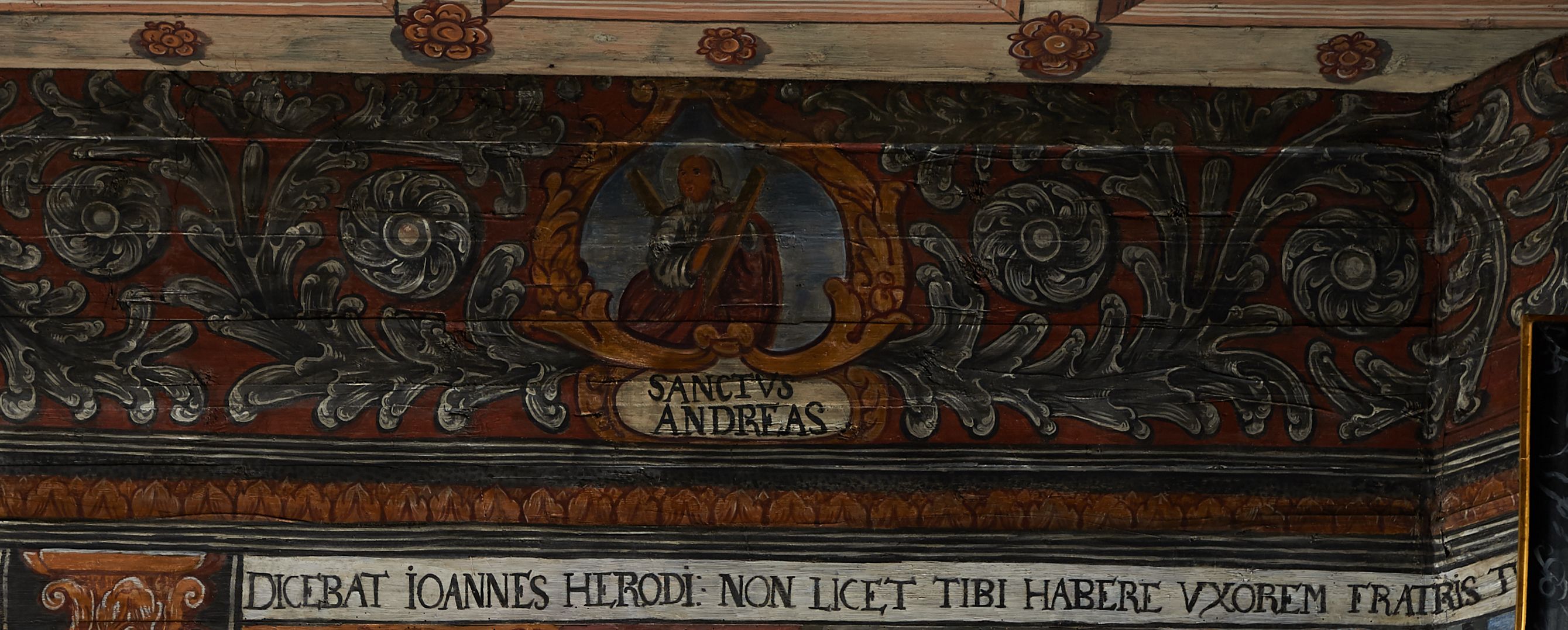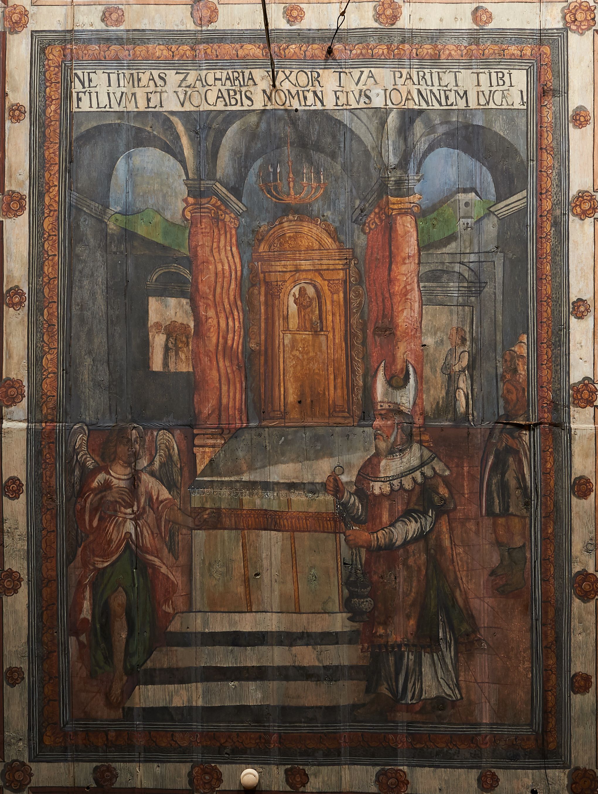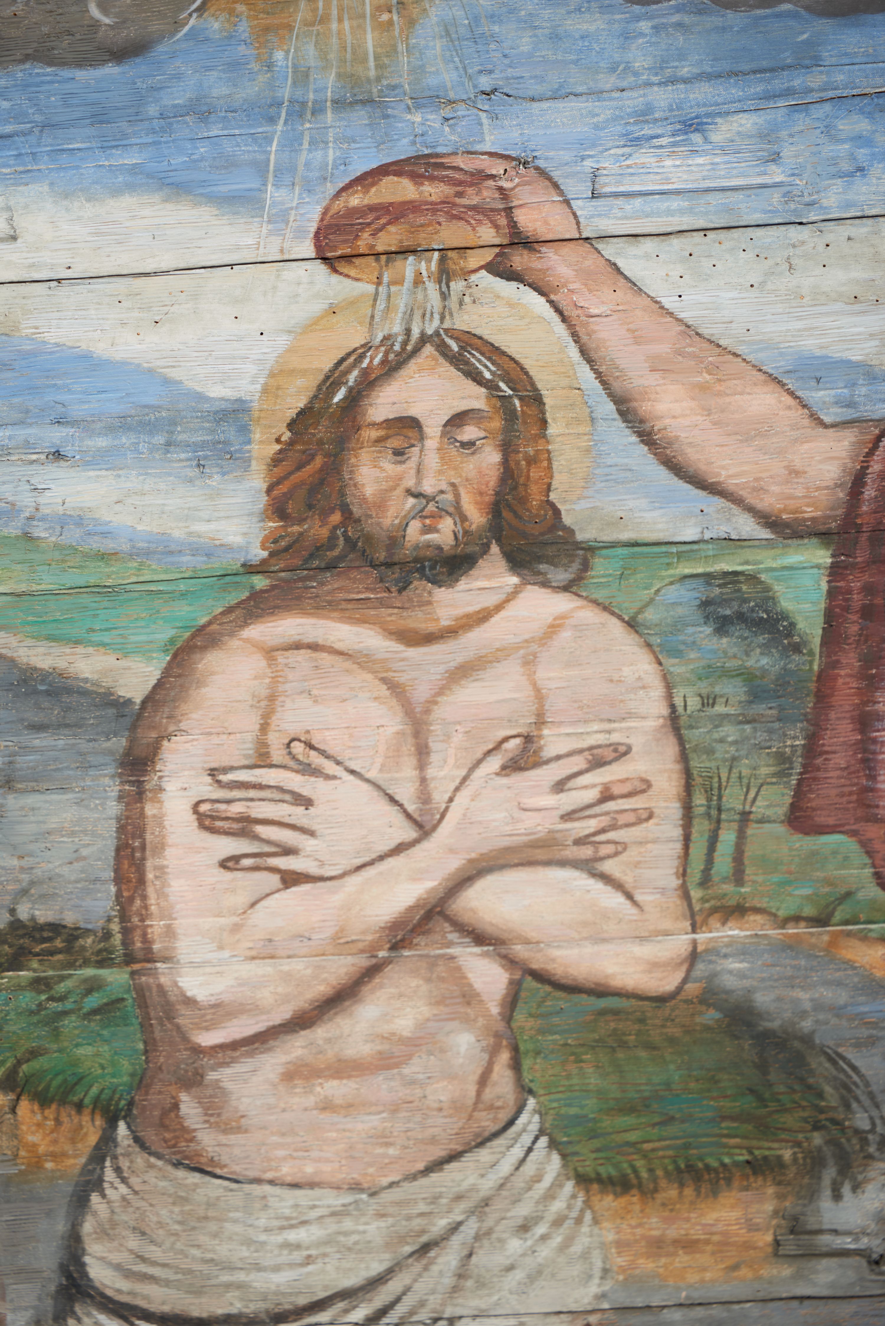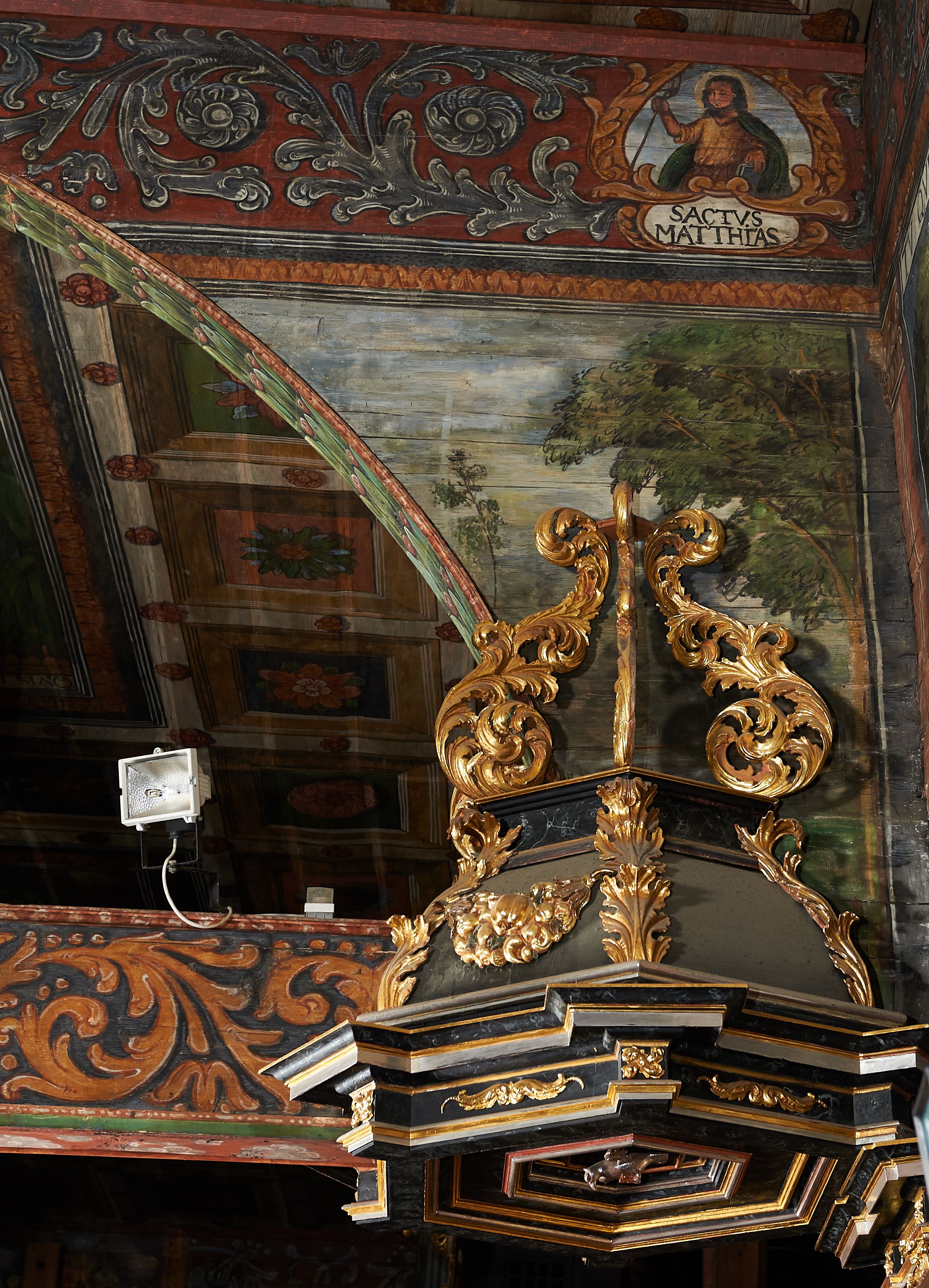 The wall polychrome of the church was created by anonymous painters in several stages. It is assumed that in the years 1656 to 1711. The most important paintings include 14 paintings depicting scenes in Saint John the Baptist's life. The second series of polychromes includes 49 images of saints and blessed people connected with the history of Christianity in Hungary: 4 kings, 2 princes next to the altar, 11 bishops and St. Gunther at the bottom of the chancel's walls, another 15 saints and blessed people (conventuals, martyrs and hermits) under the organ front in the nave on the northern wall and on choir on the western wall. There are also 16 women on the roof truss in the nave, under the ceiling. This part of the polychrome was probably made in 1711, as this date can be seen on the rood beam. The subsequent series of polychromes is the Ten Commandments, painted on the choir front. It depicts keeping or breaking the commandments. These are pictures in lives of peasants, burghers, petty nobility and manor houses in the 17th/18th centuries. Polychrome is all the more valuable as it is the first presentation of a national costume of Orava. The devil was also imagined in six scenes.