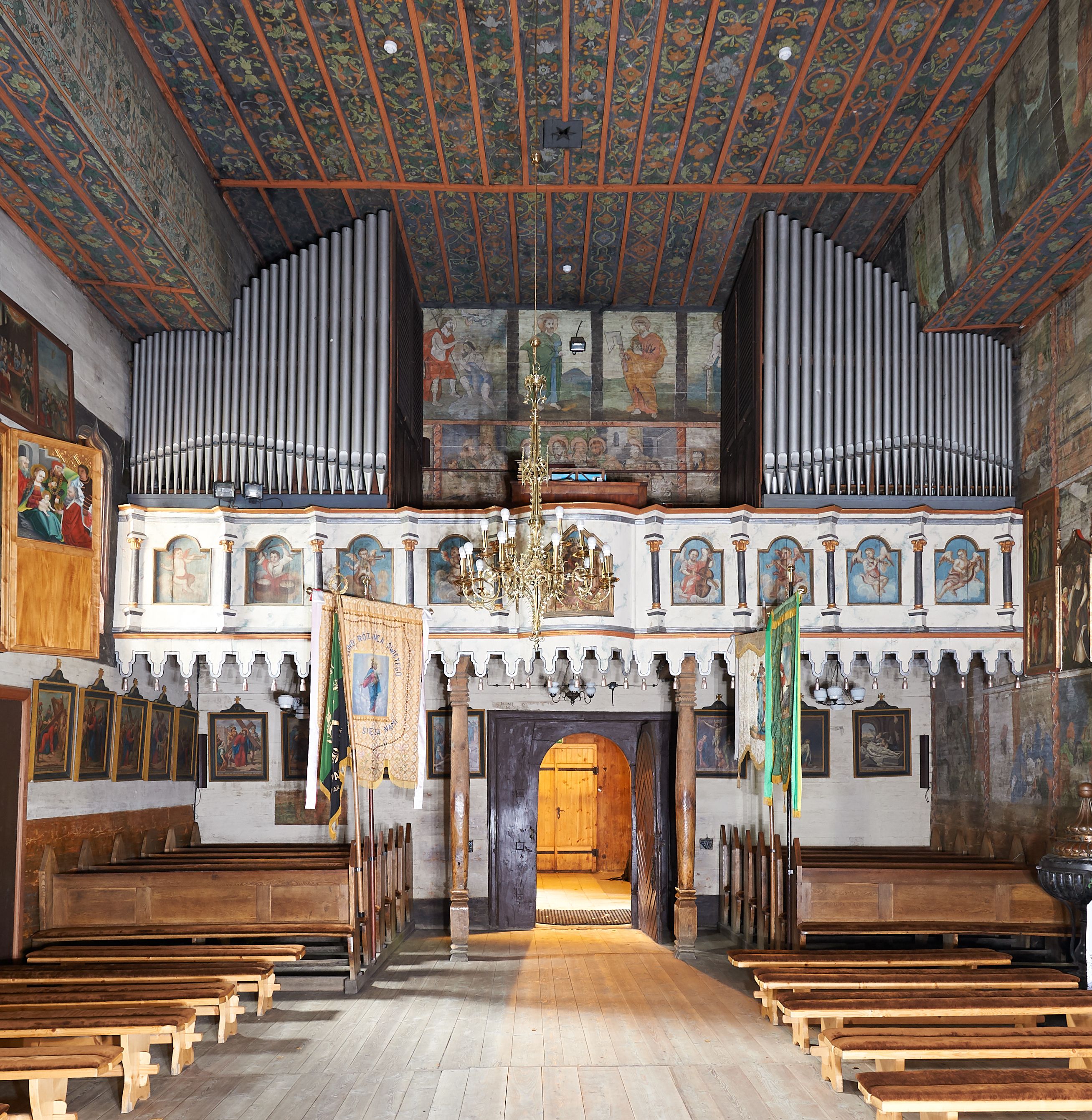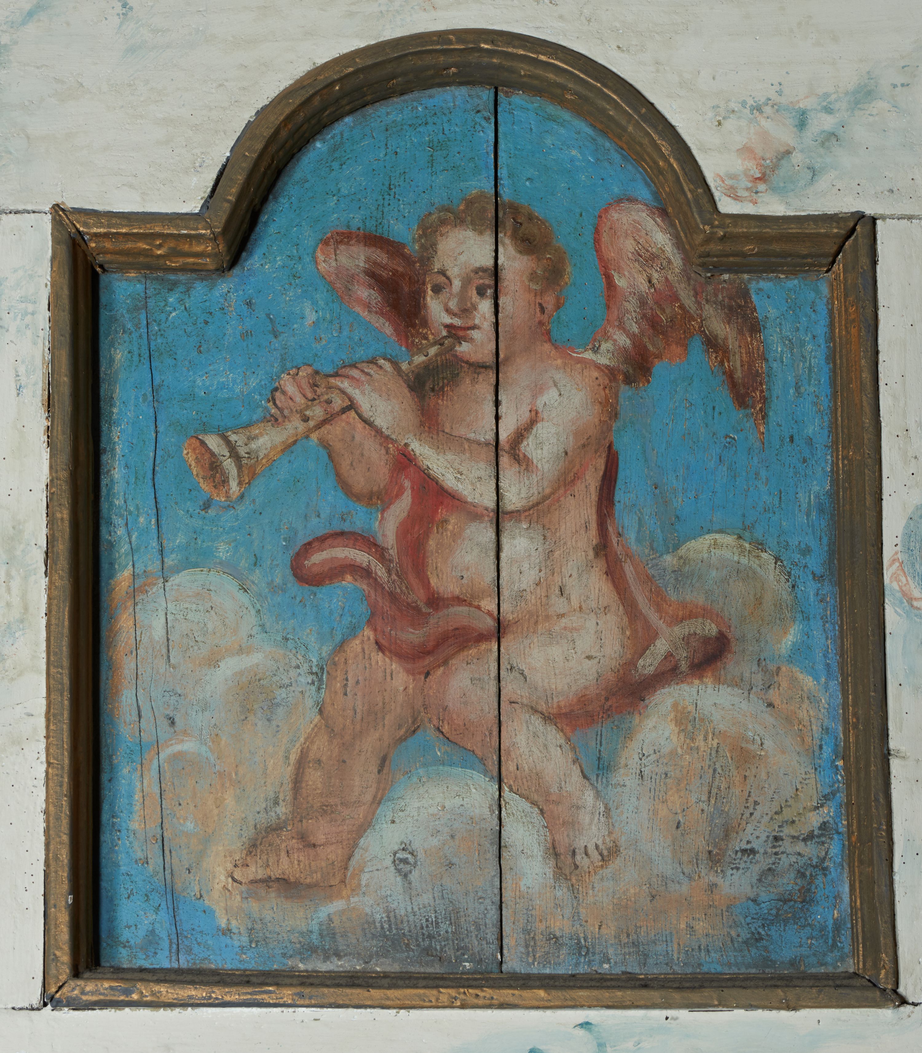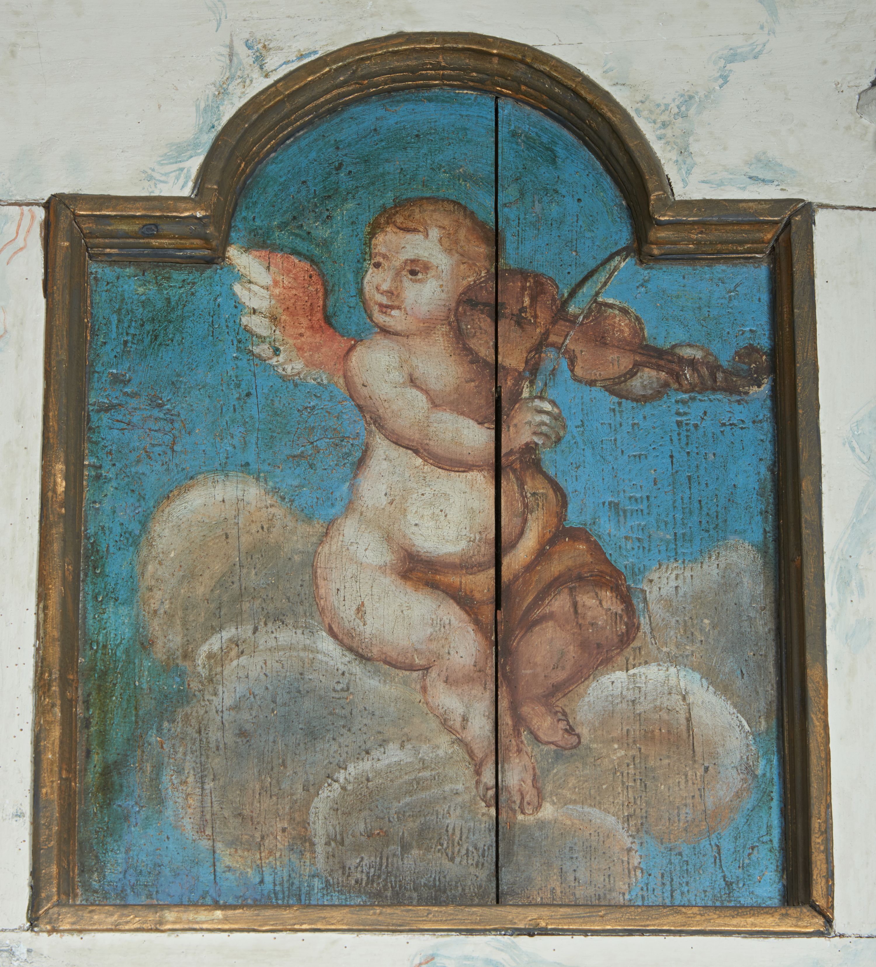 The choir balustrade was made at the turn of the 18th century. It depicts an angelic concert and King David playing the harp.