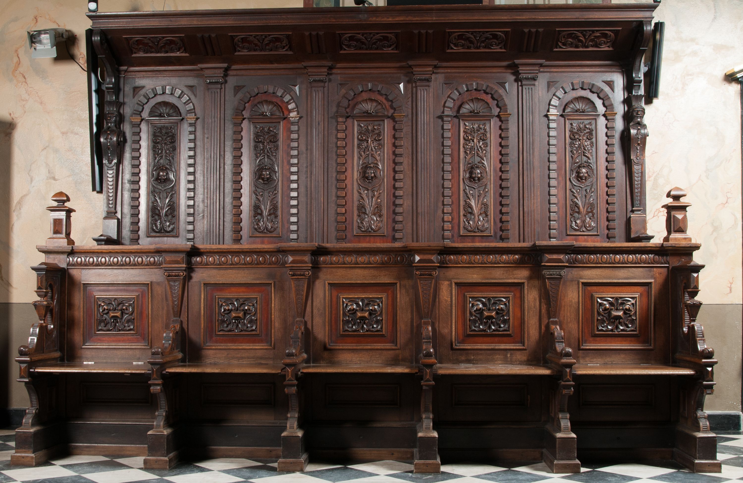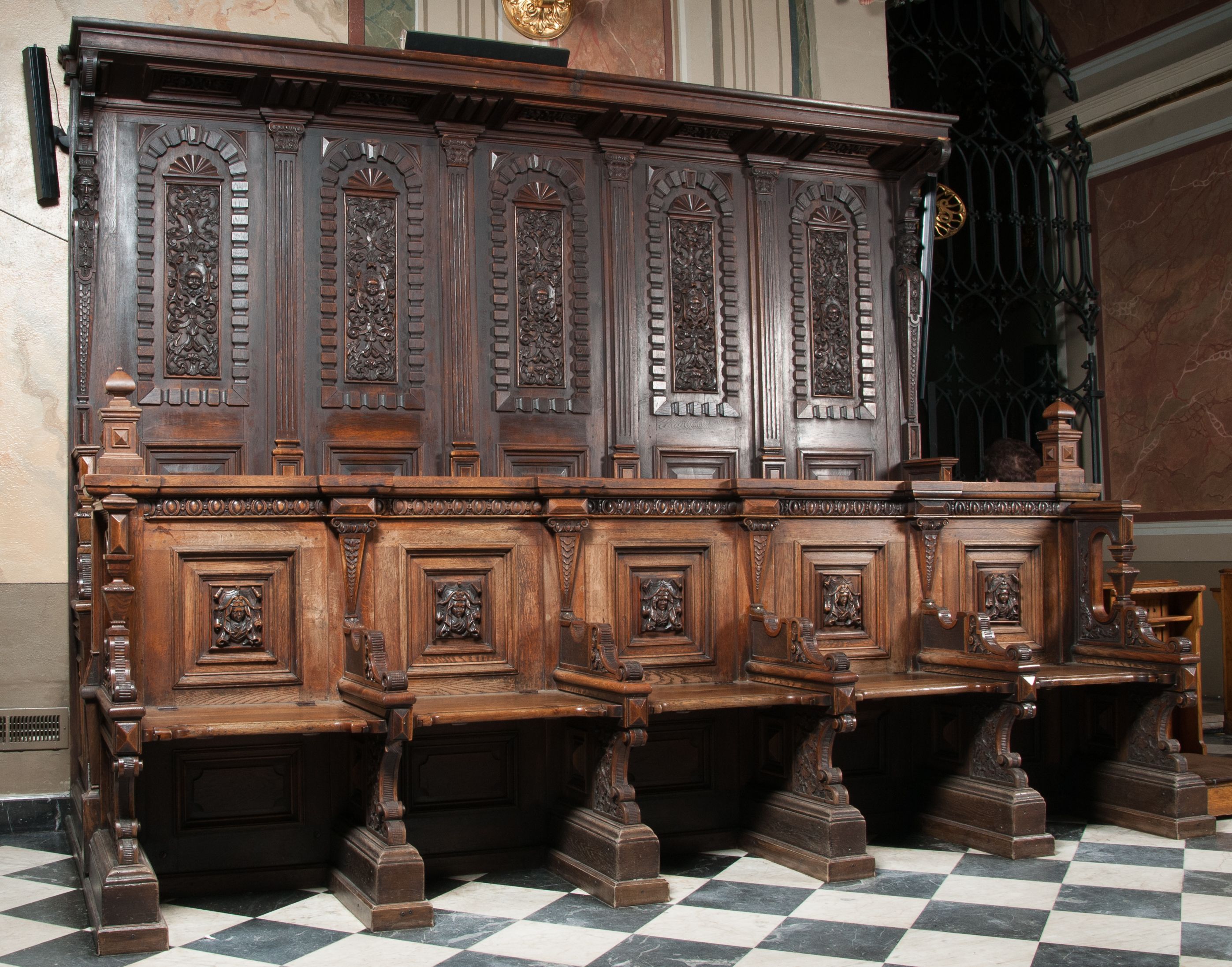 Choir-stalls opposite to each other are located in the chancel of the St. Clement's Church. The benches at the southern wall were created before 1885 thanks to the foundation of the Wieliczka commune, the opposite choir-stalls were funded by Bolesław Szczerbiński between 1898 and 1919. Choir-stalls decoration uses renaissance and mannerist motifs, combining them in the style defined in the 19th century pattern books as "Flemish".