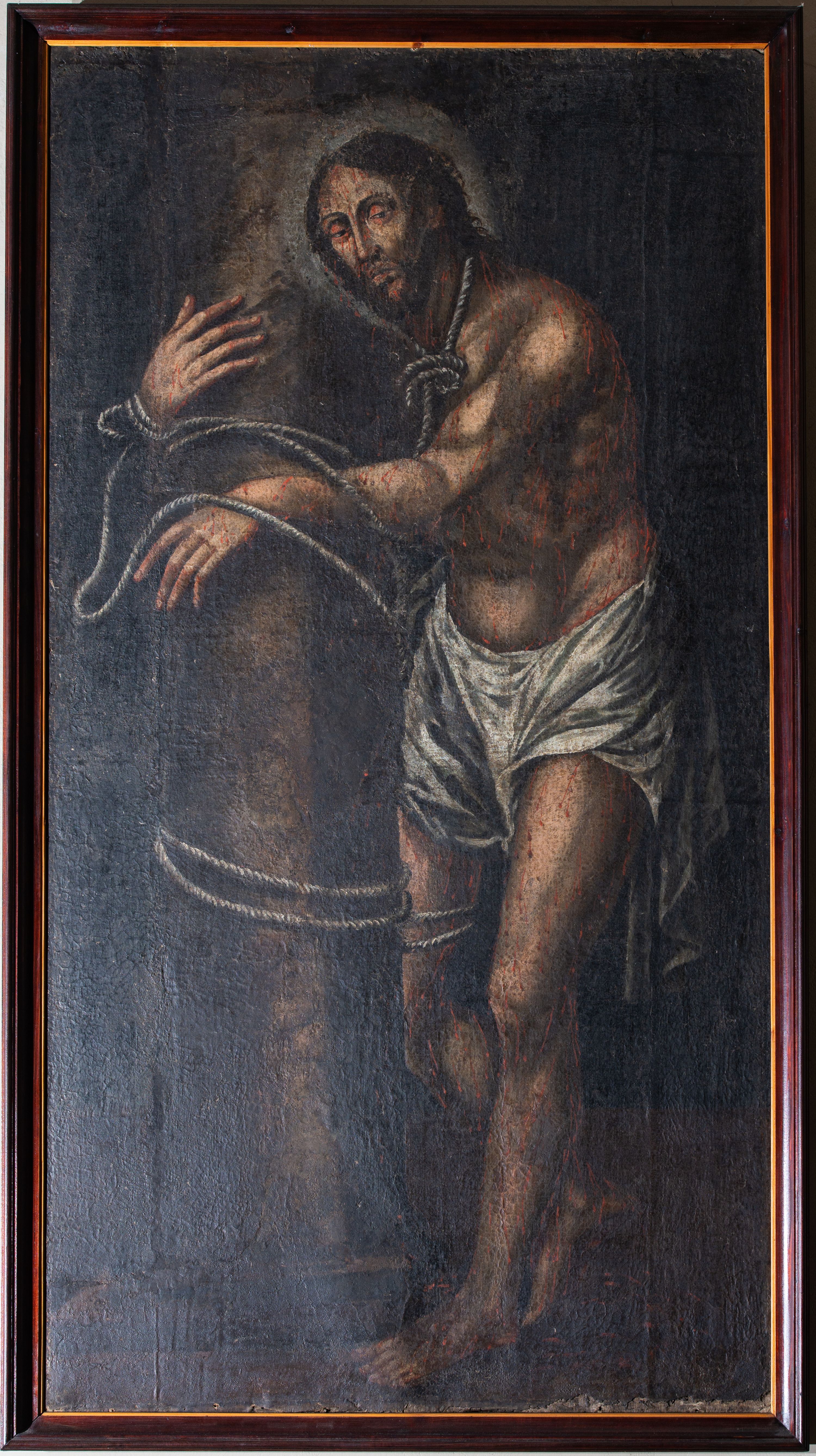 The picture of Christ at the pillar was probably made in the first half of the 17th century. It comes from the furnishings of the former wooden church of the Holy Trinity. After 1912 it was moved to a new temple in Jordanów. The Flagellation, as a Passion theme is one of the stages of the Passion of the Christ and one of the stations of the Stations of the Cross. Showing the Flagellation of Christ by torturers influenced the distinguishing the image of Christ at the Pillar Himself.