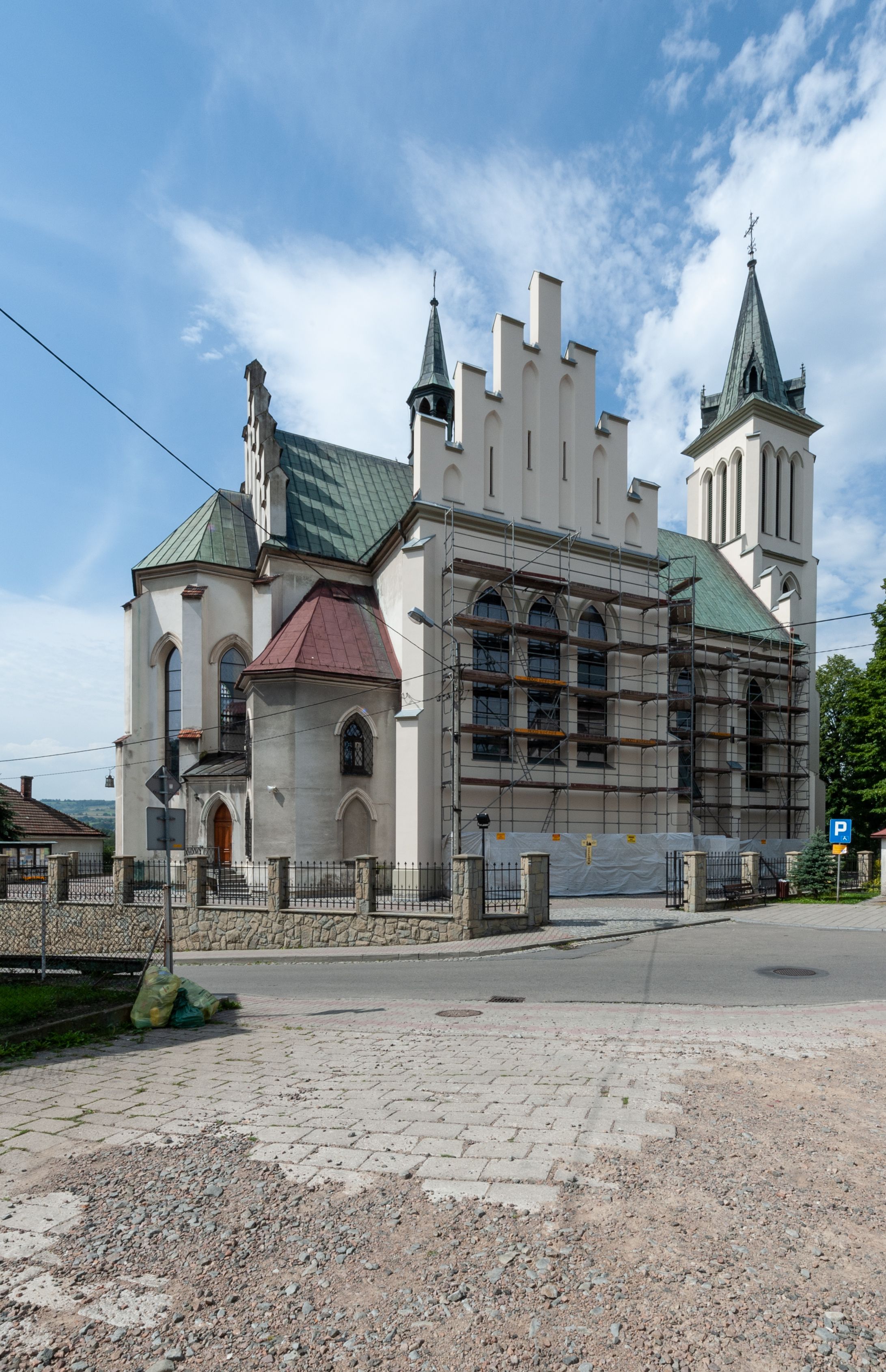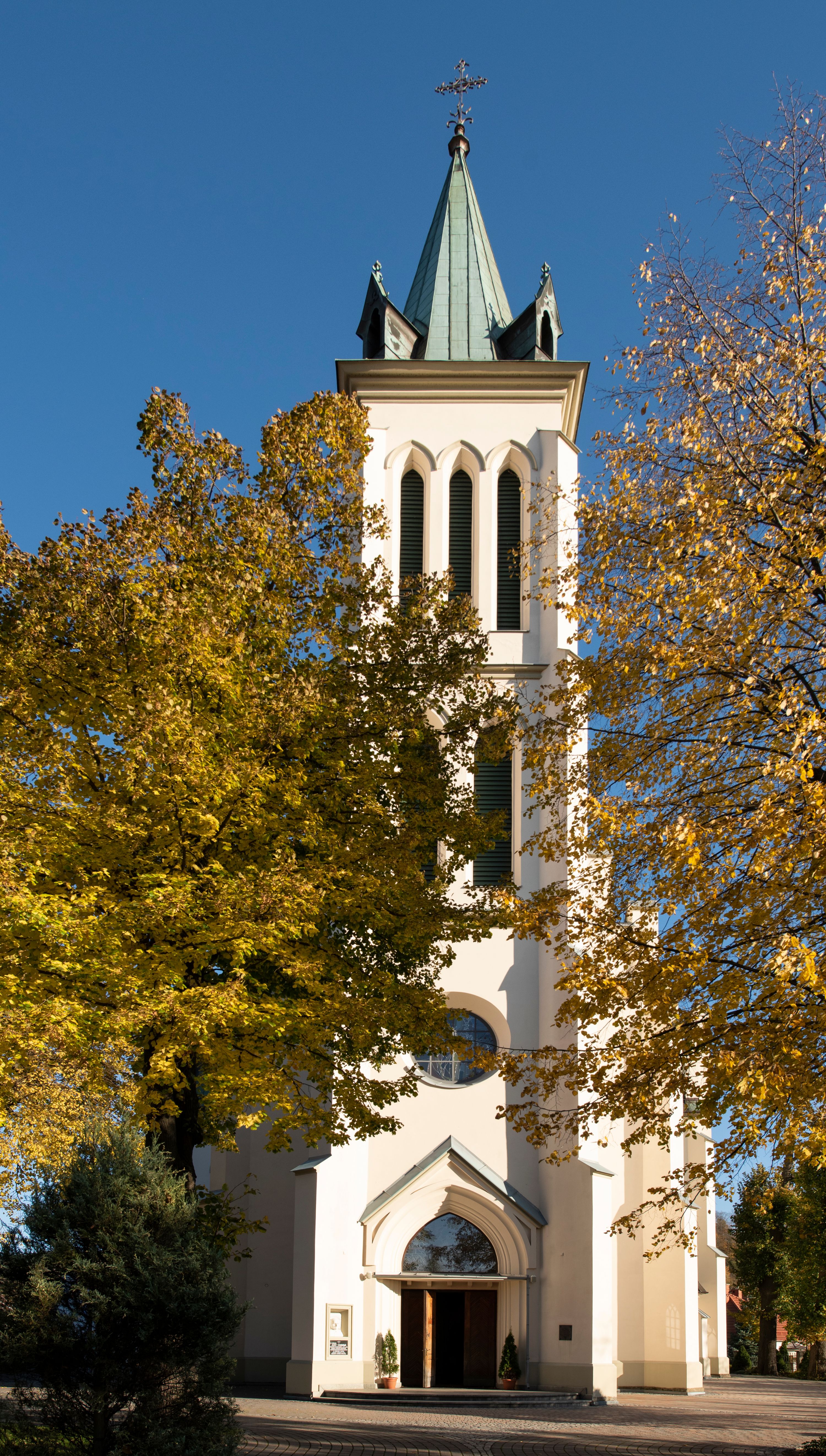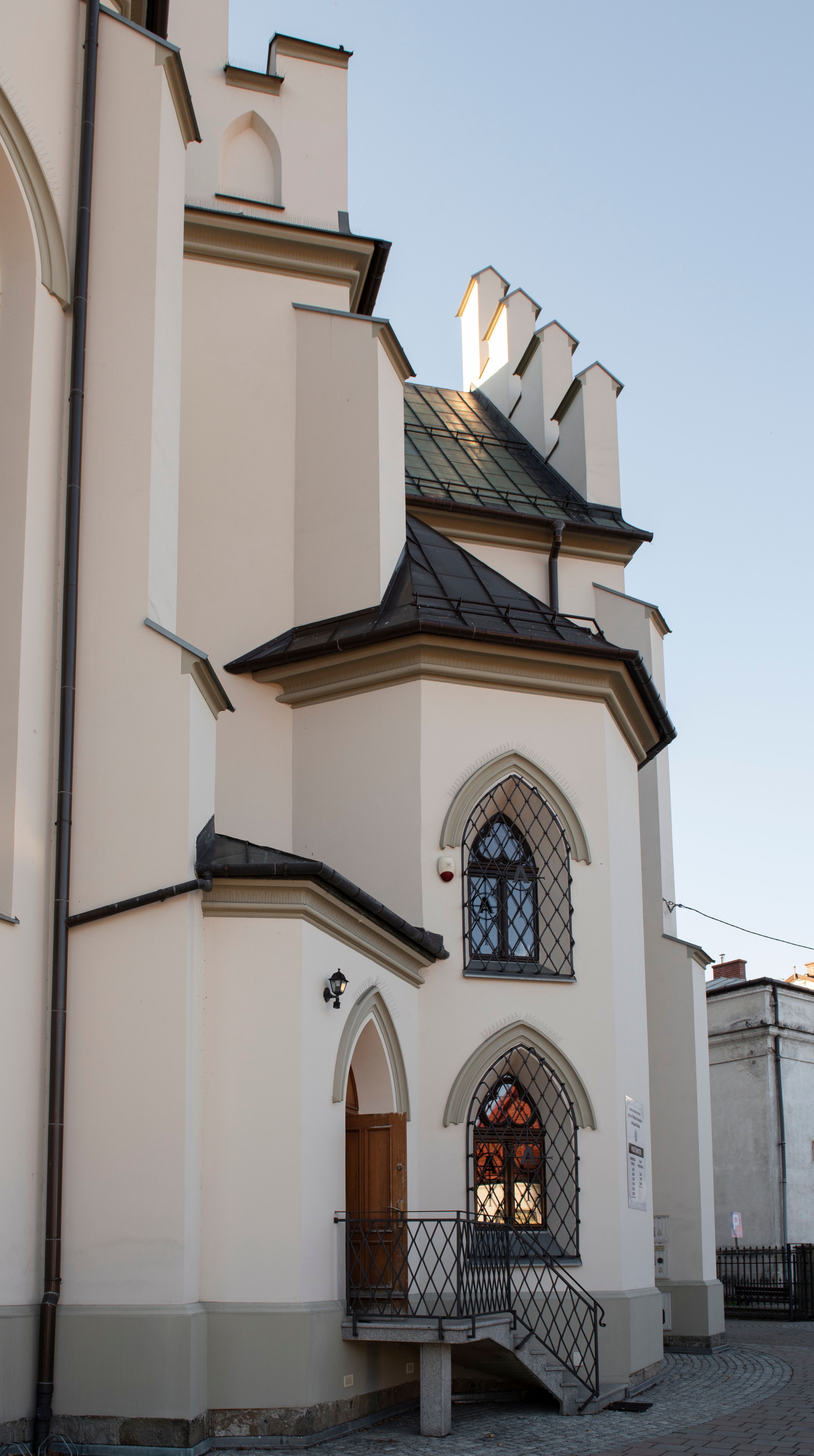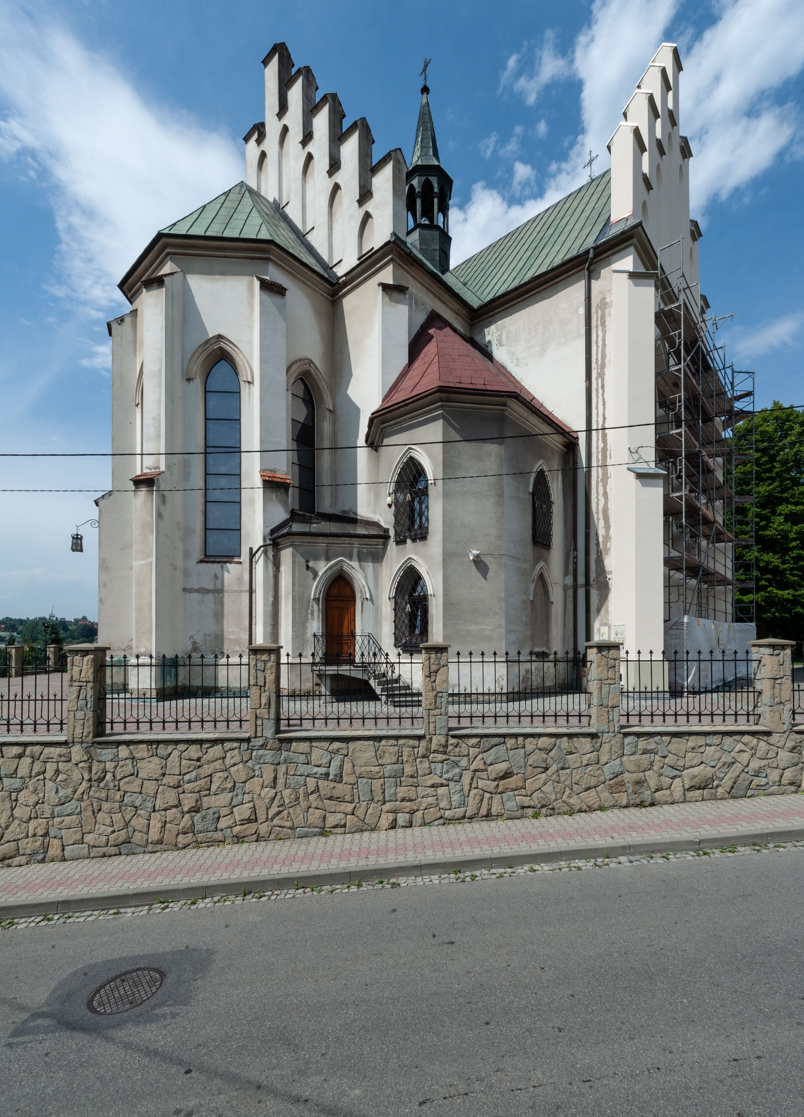 Church of Michael the Archangel in Mszana Dolna was built in 1891-1901 in the Neo-Gothic style. The temple was designed by Wincenty Wdowiszewski. In the church, the architect designed high, narrow windows that are divided into columns with pointed arch with closed top. These windows are stained glass ones and deserve special attention. The first of them was commissioned by Franciszek Mączyński (on the advice of then parish priest Józef Stabrawa) and was created by Juliusz Makarewicz in 1917. The stained-glass windows were made in the Stained Glass Workshop S. G. Żeleński in Cracow. The concept of the composition is a holistic project of church decoration, in which the main elements were wall paintings and stained glass windows. Another six stained glass windows were made in 1919 by the same artist group. Makarewicz's last work for the church in Mszana was a stained glass window depicting St. Michael the Archangel on the window of the chancel. At the turn of the 19th and 20th centuries, the church was equipped with altars. In 1910, a new baptismal font, confessionals and organs were purchased. Stations of the Cross, made by Józef Zając, hang on the walls of the temple. The oldest furnishings of the church include: a stone stoup from 1668, a painting depicting the Dormition of the Virgin from around 1530 (originates from the St. Anne's Church in Cracow), a painting of St. Michael the Archangel from the 17th century and a painting of St. Augustine and the Child from the 18th century. At the entrance to the church, it is worth paying attention to a bust of father Józef Stabrawa, a parish priest in Mszana Dolna for many years, who died in the Dachau concentration camp. The bust was made by the local sculptor Stanisław Ciężadlik.