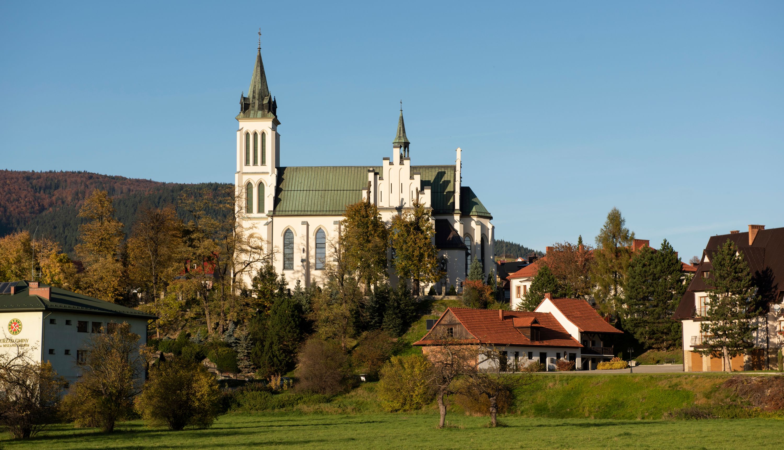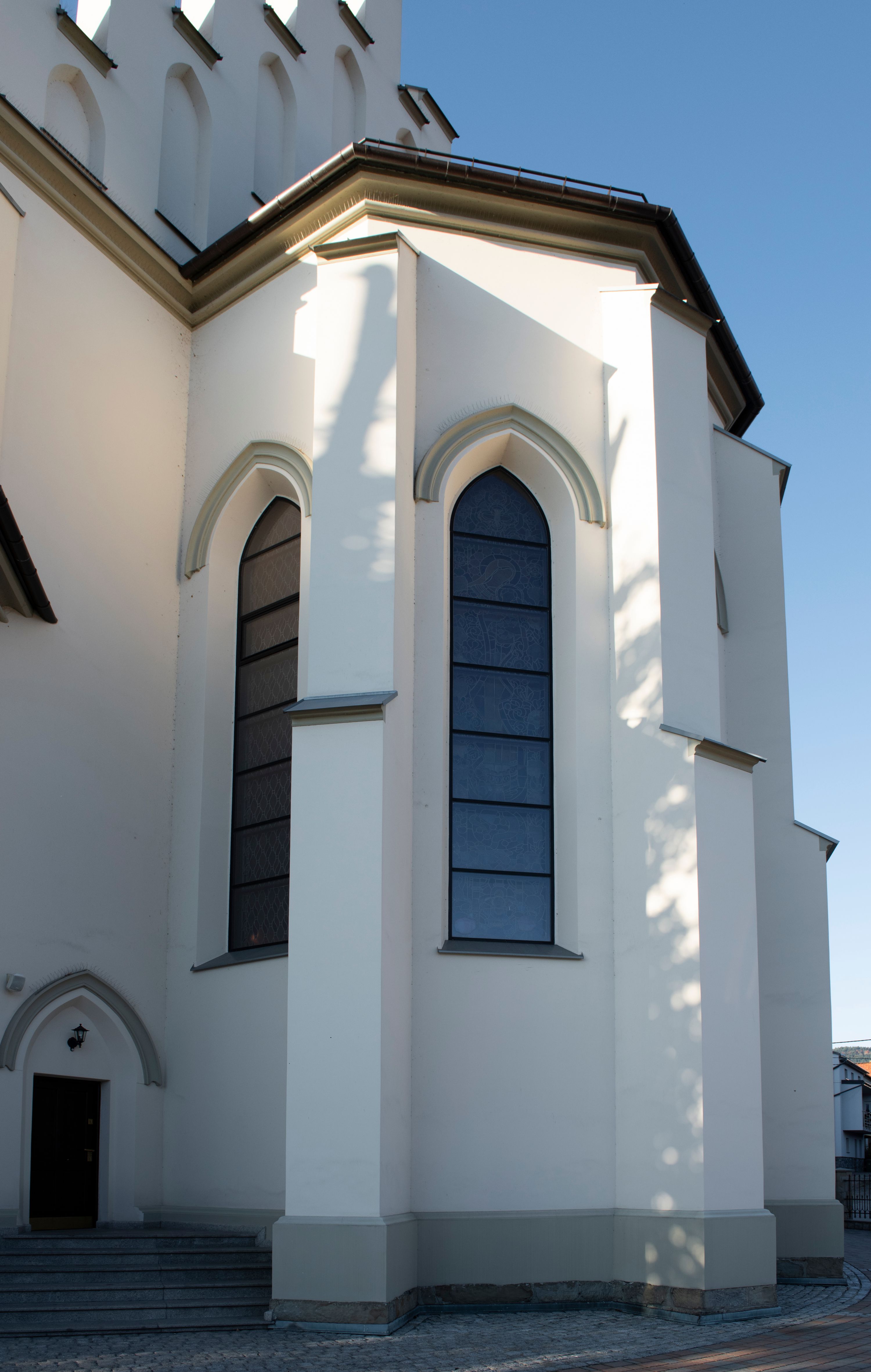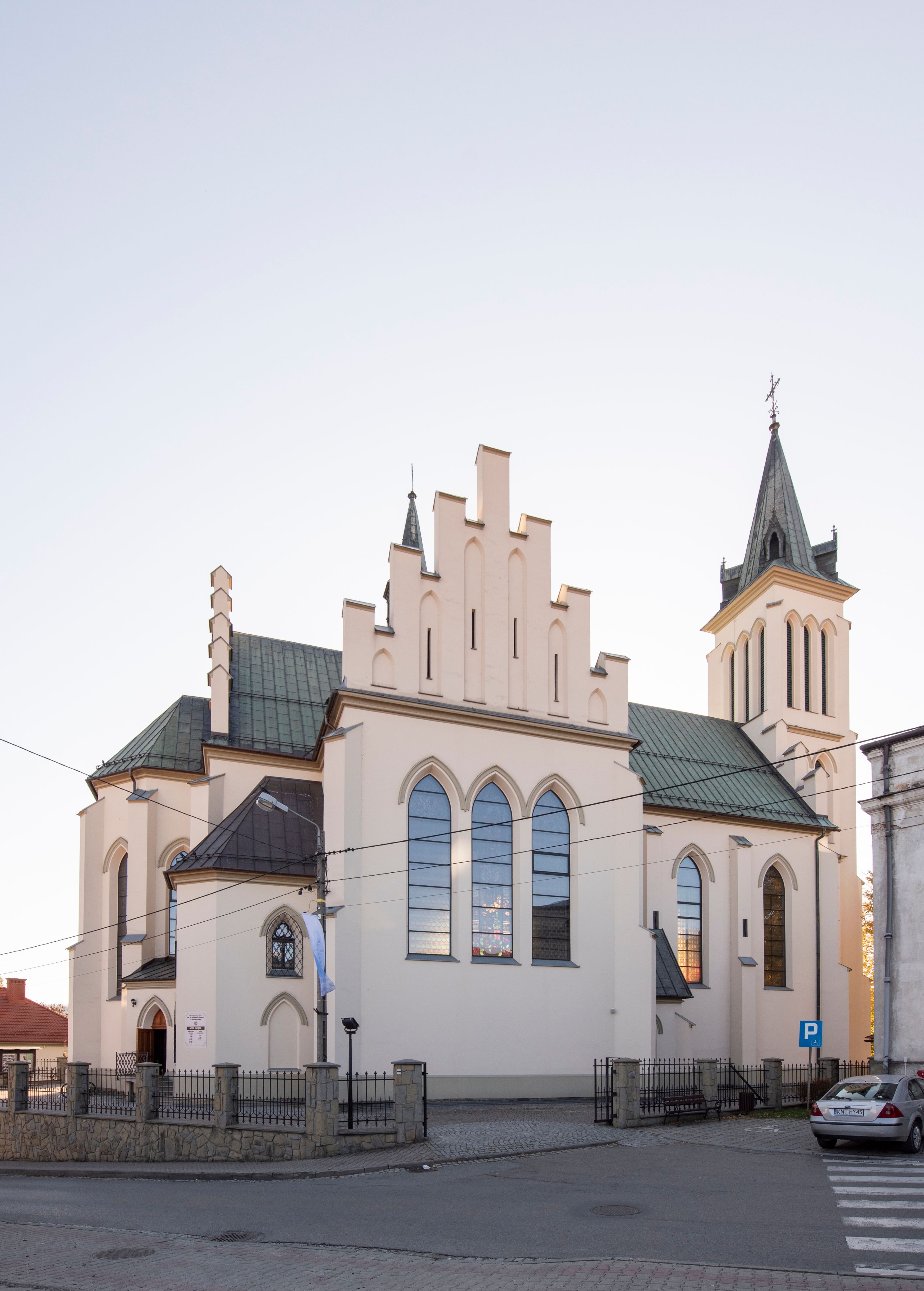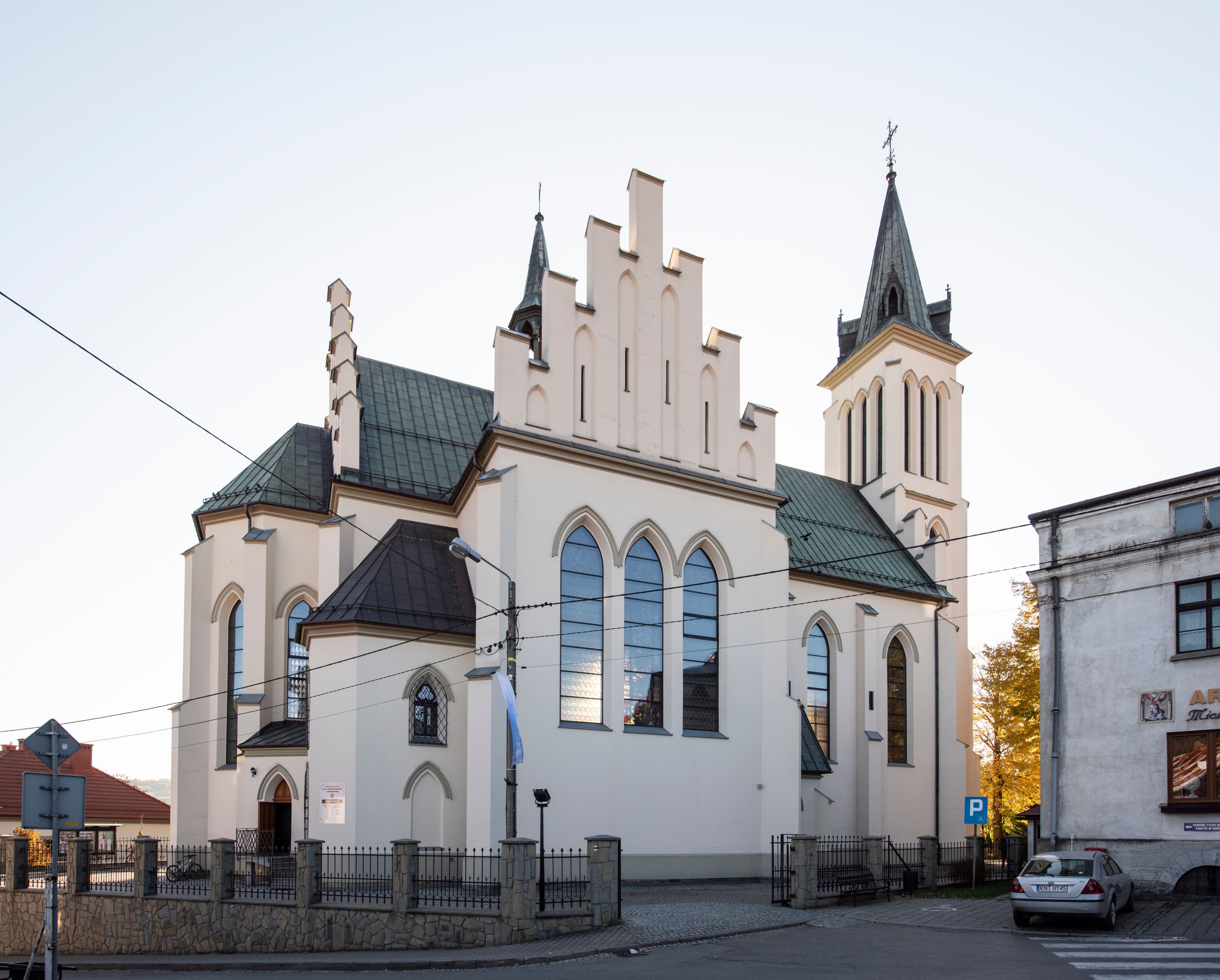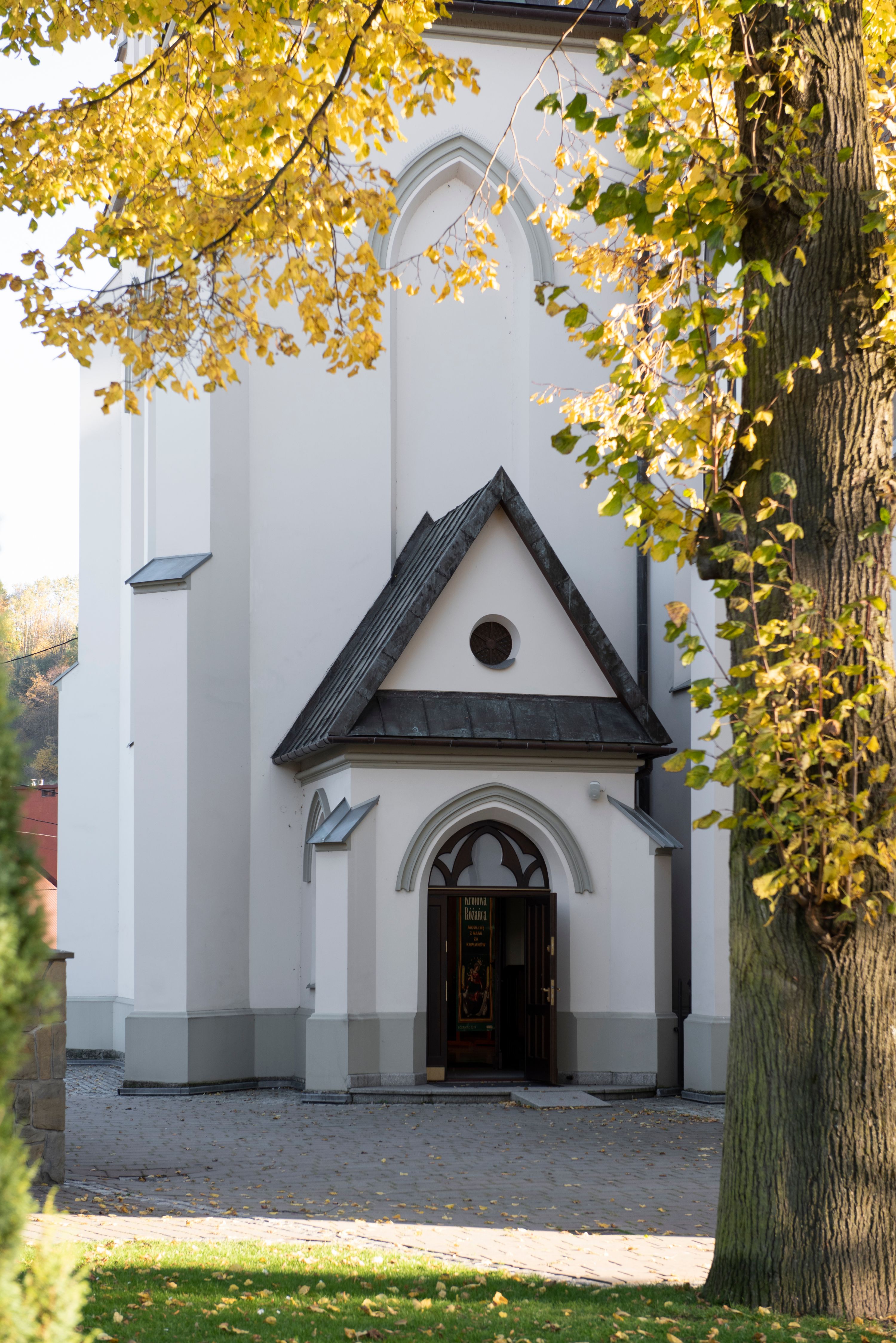 Church of Michael the Archangel in Mszana Dolna was built in 1891-1901 in the Neo-Gothic style. The temple was designed by Wincenty Wdowiszewski. In the church, the architect designed high, narrow windows that are divided into columns with pointed arch with closed top. These windows are stained glass ones and deserve special attention. The first of them was commissioned by Franciszek Mączyński (on the advice of then parish priest Józef Stabrawa) and was created by Juliusz Makarewicz in 1917. The stained-glass windows were made in the Stained Glass Workshop S. G. Żeleński in Cracow. The concept of the composition is a holistic project of church decoration, in which the main elements were wall paintings and stained glass windows. Another six stained glass windows were made in 1919 by the same artist group. Makarewicz's last work for the church in Mszana was a stained glass window depicting St. Michael the Archangel on the window of the chancel. At the turn of the 19th and 20th centuries, the church was equipped with altars. In 1910, a new baptismal font, confessionals and organs were purchased. Stations of the Cross, made by Józef Zając, hang on the walls of the temple. The oldest furnishings of the church include: a stone stoup from 1668, a painting depicting the Dormition of the Virgin from around 1530 (originates from the St. Anne's Church in Cracow), a painting of St. Michael the Archangel from the 17th century and a painting of St. Augustine and the Child from the 18th century. At the entrance to the church, it is worth paying attention to a bust of father Józef Stabrawa, a parish priest in Mszana Dolna for many years, who died in the Dachau concentration camp. The bust was made by the local sculptor Stanisław Ciężadlik.