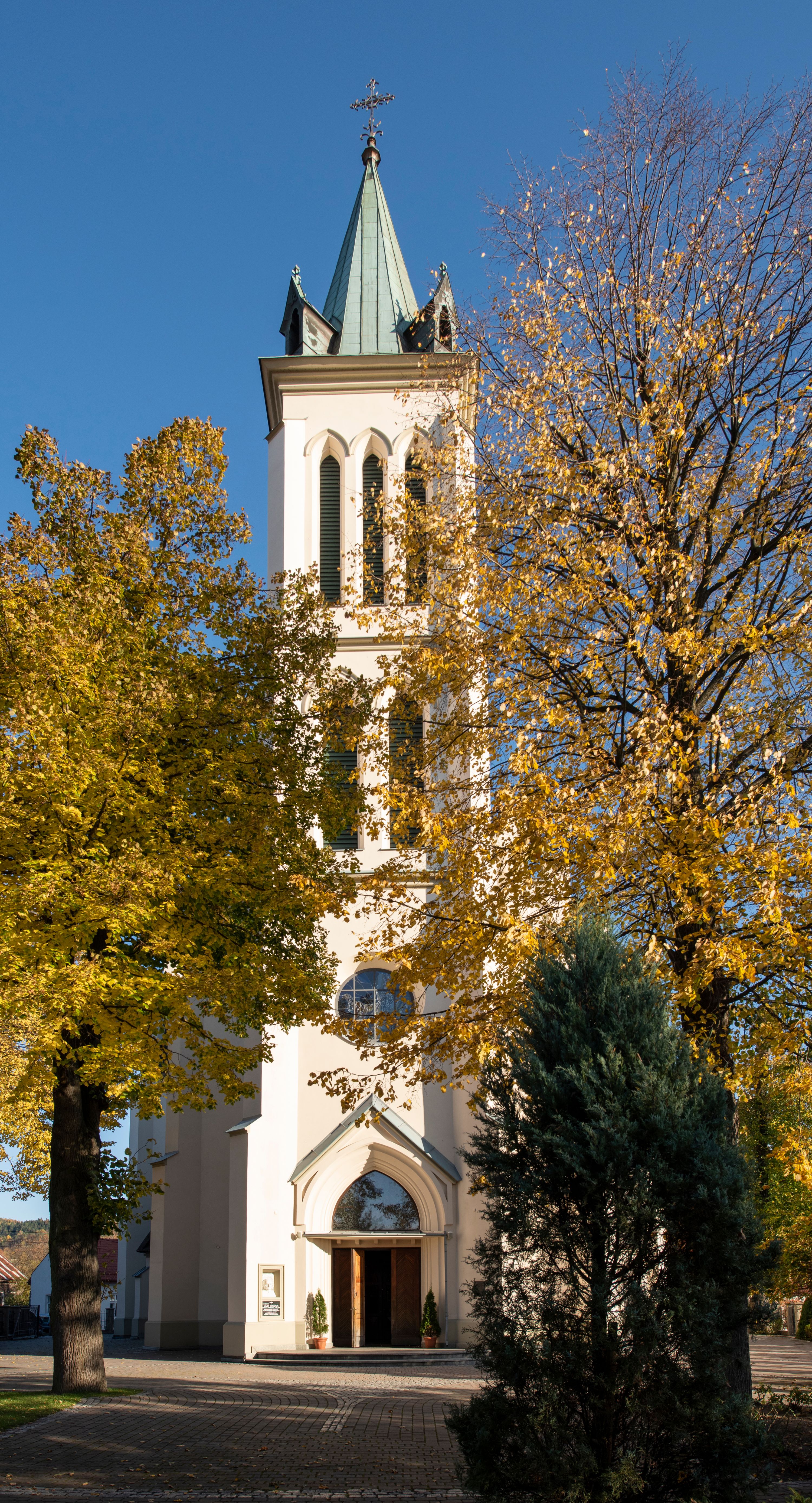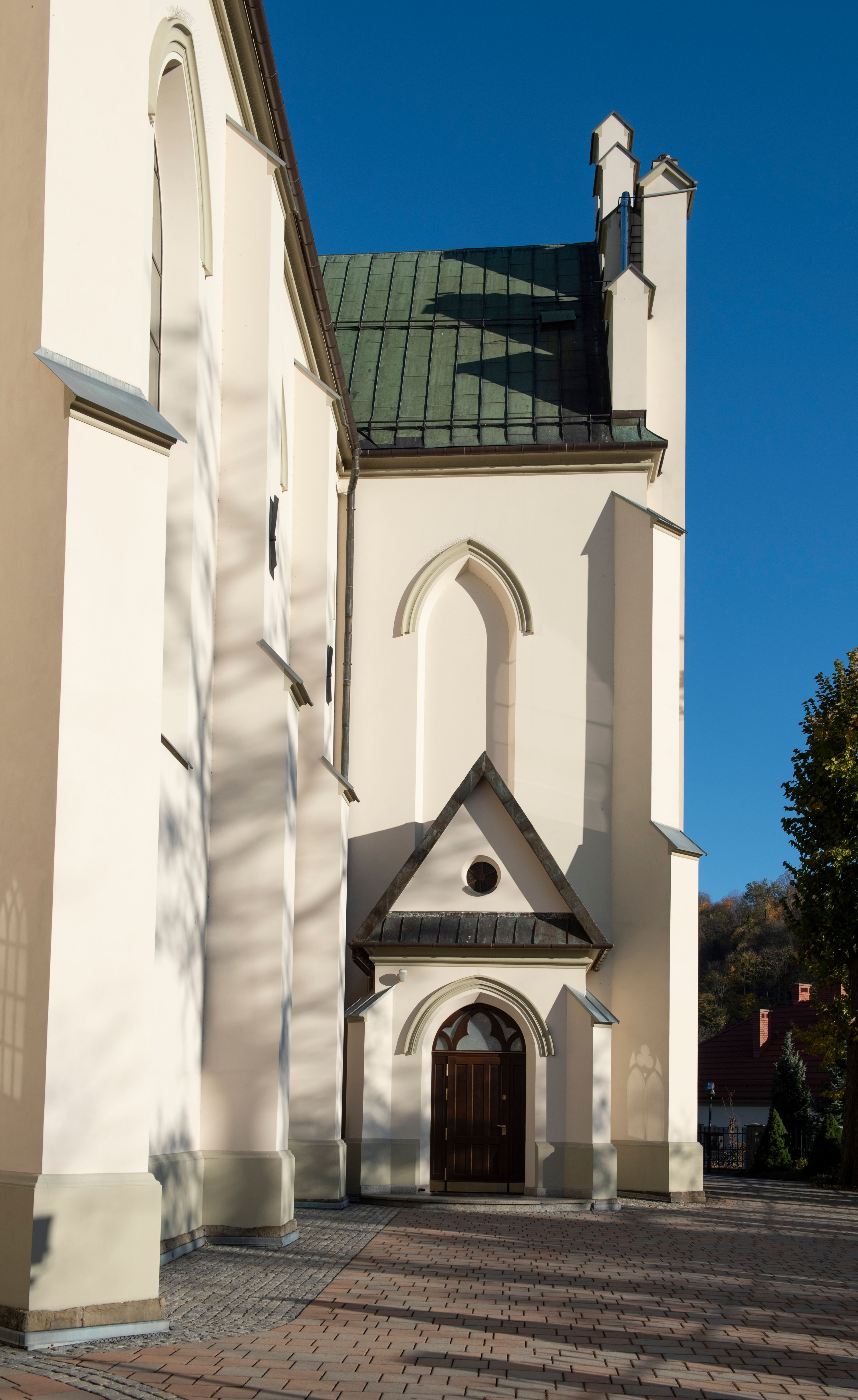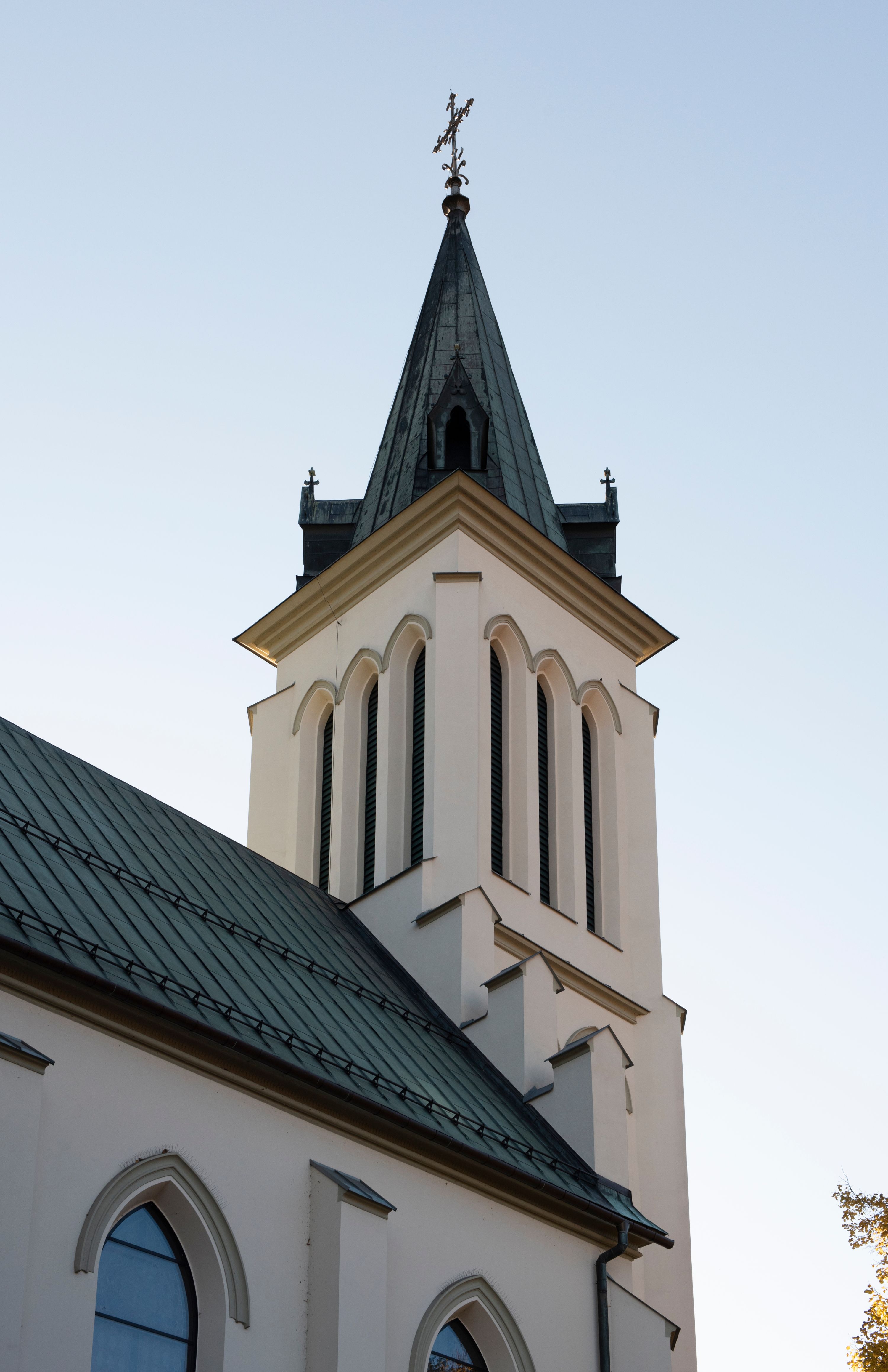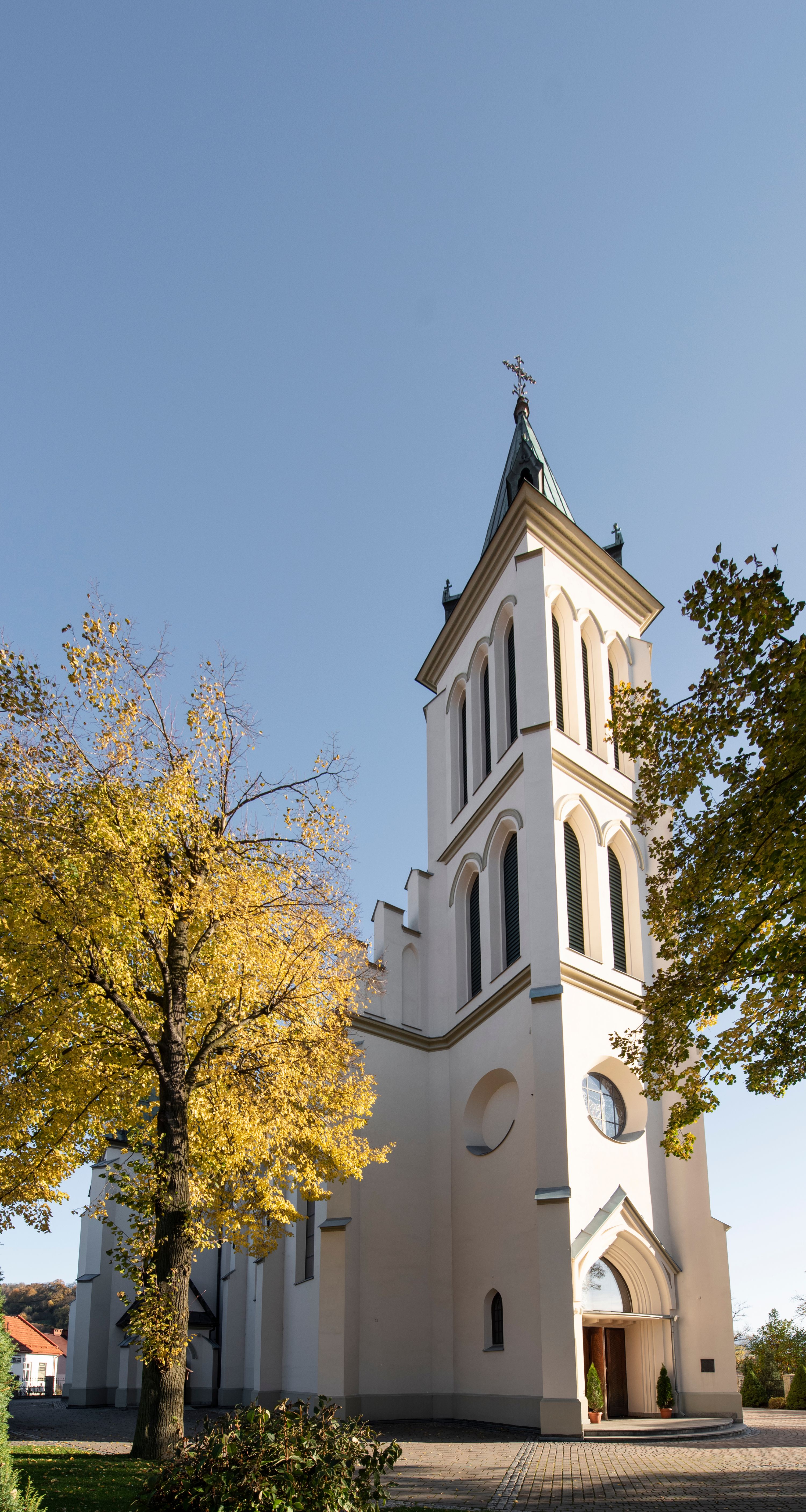 Church of Michael the Archangel in Mszana Dolna was built in 1891-1901 in the Neo-Gothic style. The temple was designed by Wincenty Wdowiszewski. In the church, the architect designed high, narrow windows that are divided into columns with pointed arch with closed top. These windows are stained glass ones and deserve special attention. The first of them was commissioned by Franciszek Mączyński (on the advice of then parish priest Józef Stabrawa) and was created by Juliusz Makarewicz in 1917. The stained-glass windows were made in the Stained Glass Workshop S. G. Żeleński in Cracow. The concept of the composition is a holistic project of church decoration, in which the main elements were wall paintings and stained glass windows. Another six stained glass windows were made in 1919 by the same artist group. Makarewicz's last work for the church in Mszana was a stained glass window depicting St. Michael the Archangel on the window of the chancel. At the turn of the 19th and 20th centuries, the church was equipped with altars. In 1910, a new baptismal font, confessionals and organs were purchased. Stations of the Cross, made by Józef Zając, hang on the walls of the temple. The oldest furnishings of the church include: a stone stoup from 1668, a painting depicting the Dormition of the Virgin from around 1530 (originates from the St. Anne's Church in Cracow), a painting of St. Michael the Archangel from the 17th century and a painting of St. Augustine and the Child from the 18th century. At the entrance to the church, it is worth paying attention to a bust of father Józef Stabrawa, a parish priest in Mszana Dolna for many years, who died in the Dachau concentration camp. The bust was made by the local sculptor Stanisław Ciężadlik.