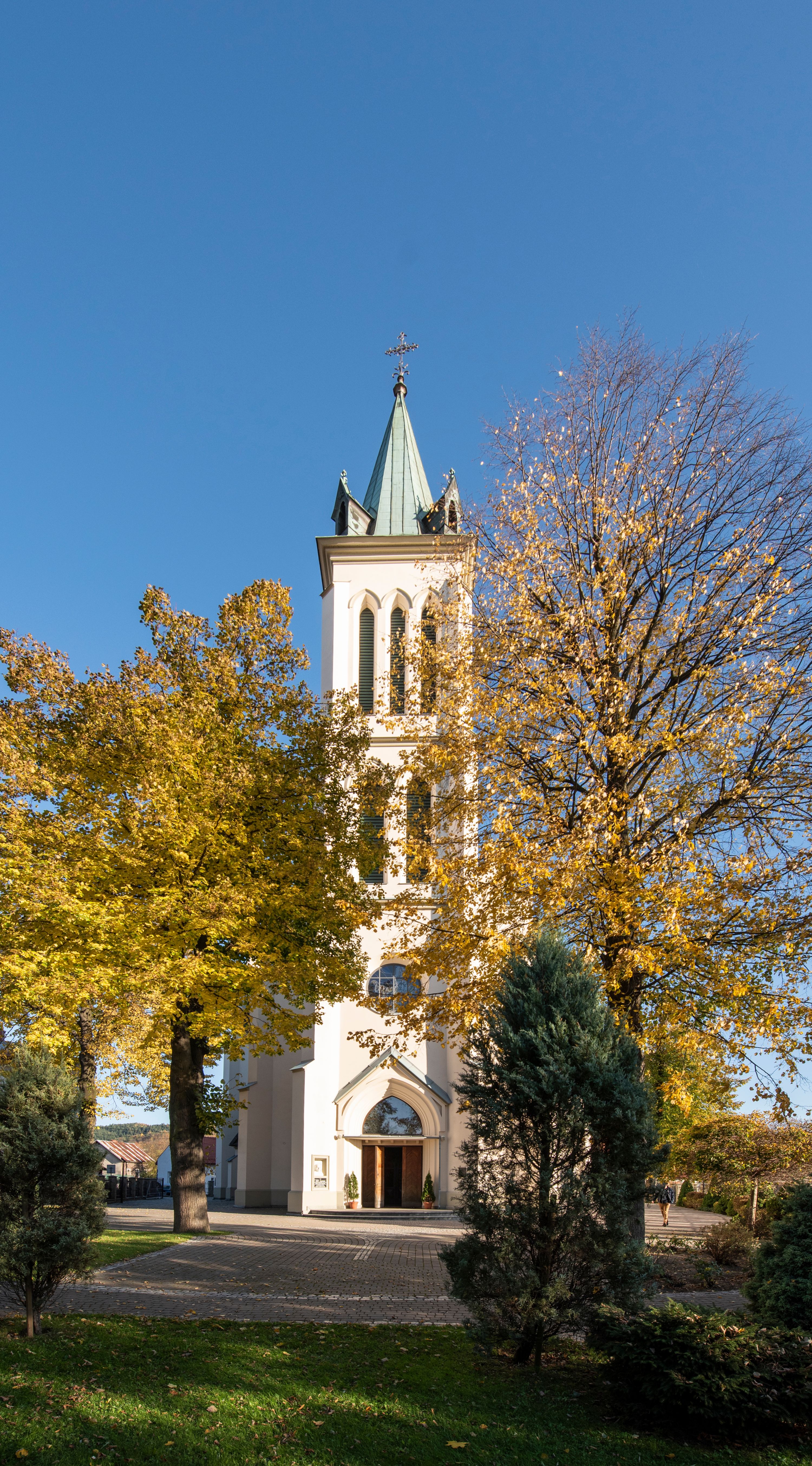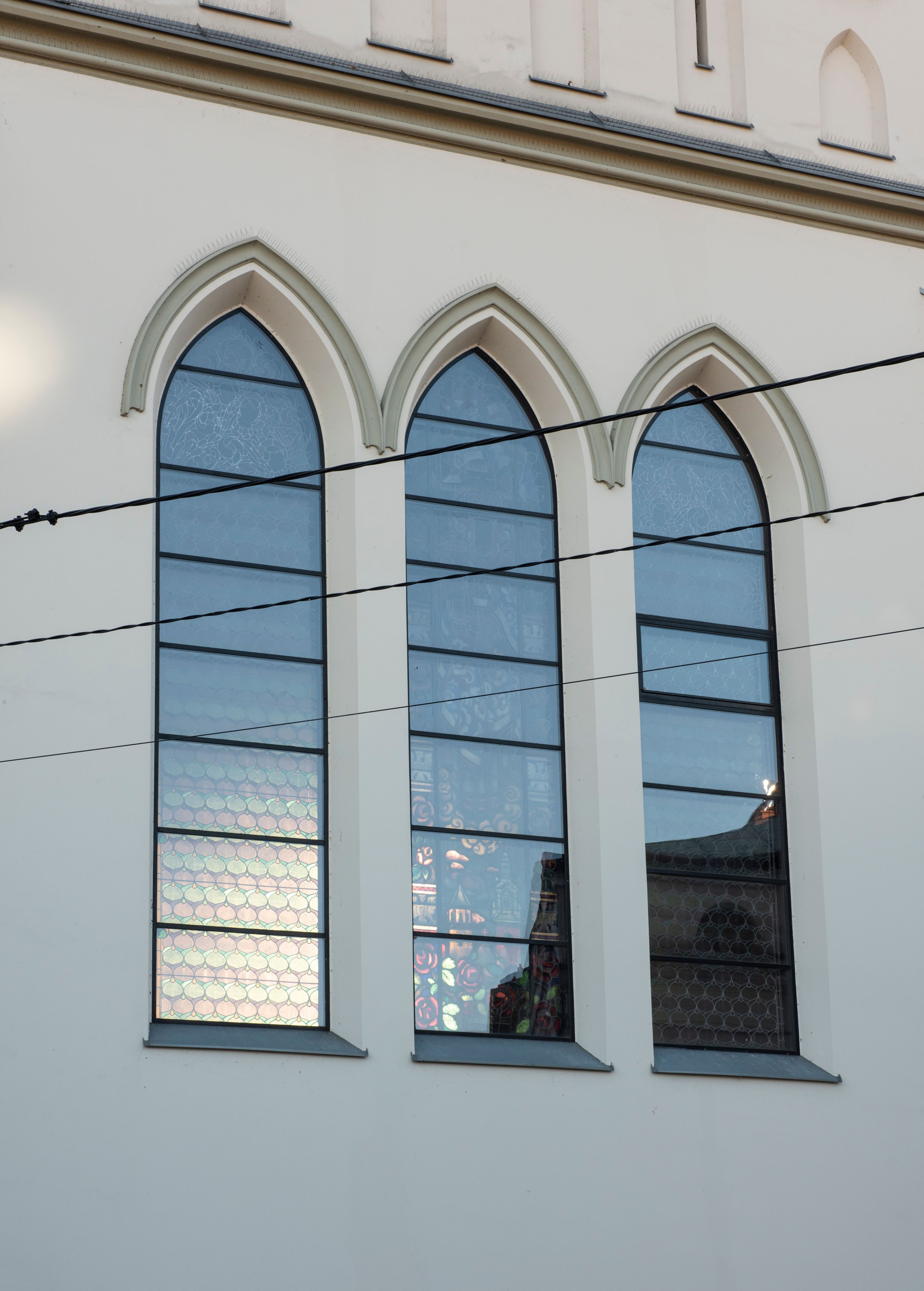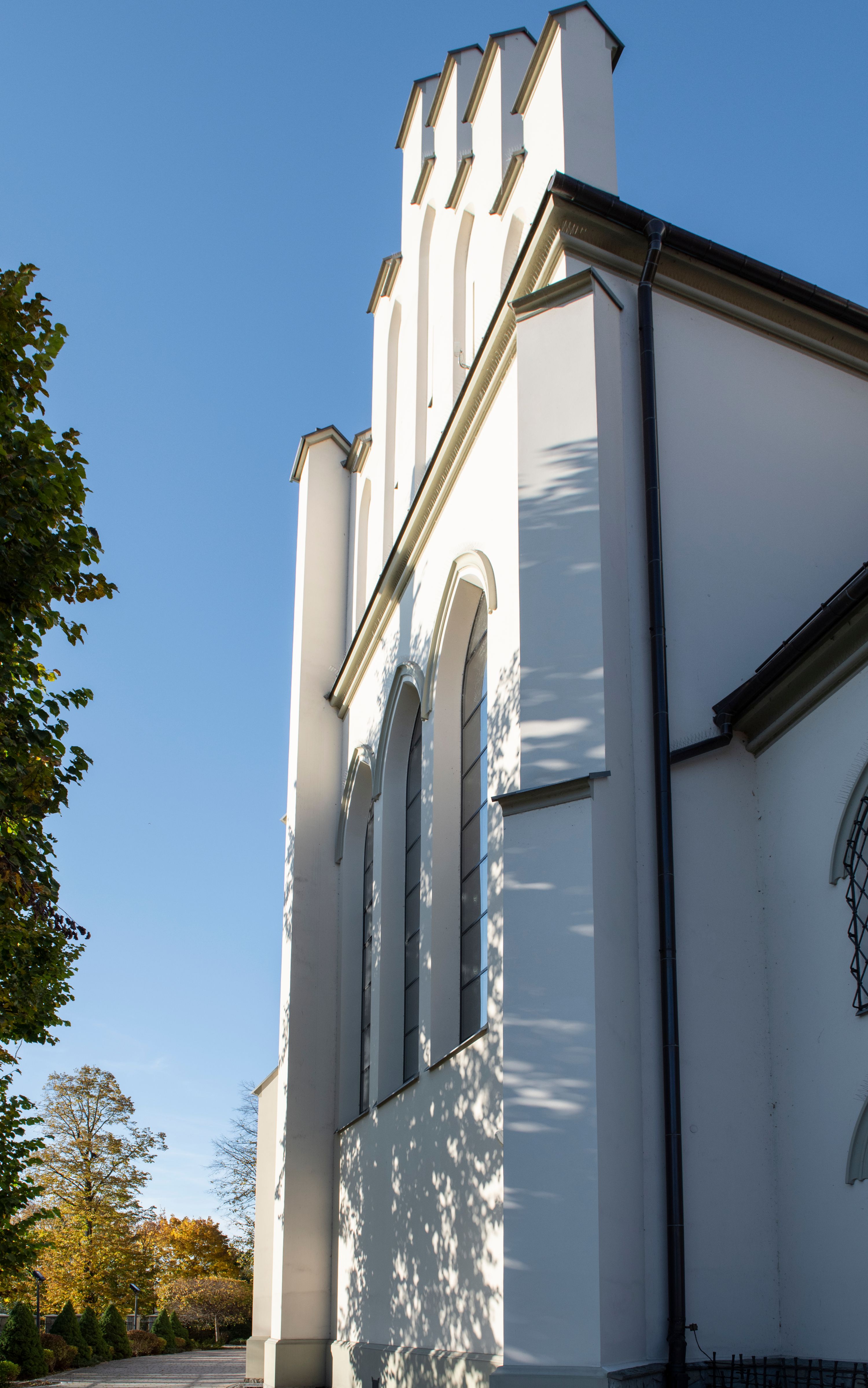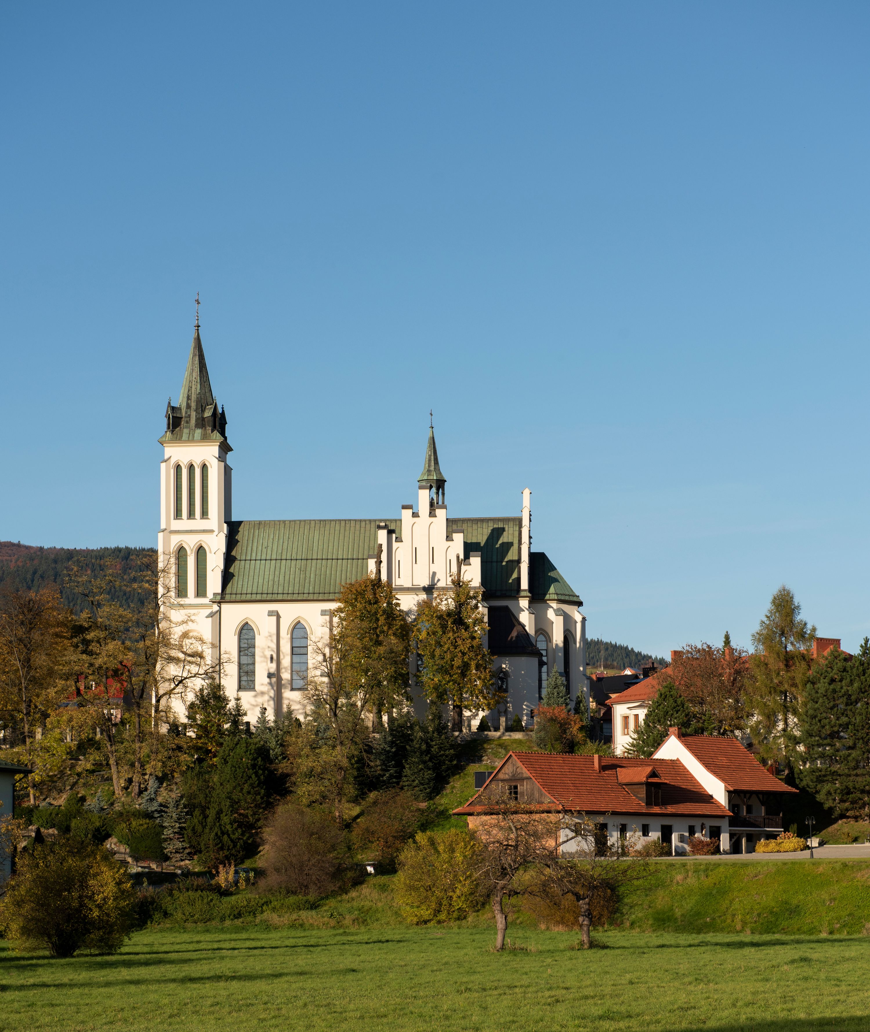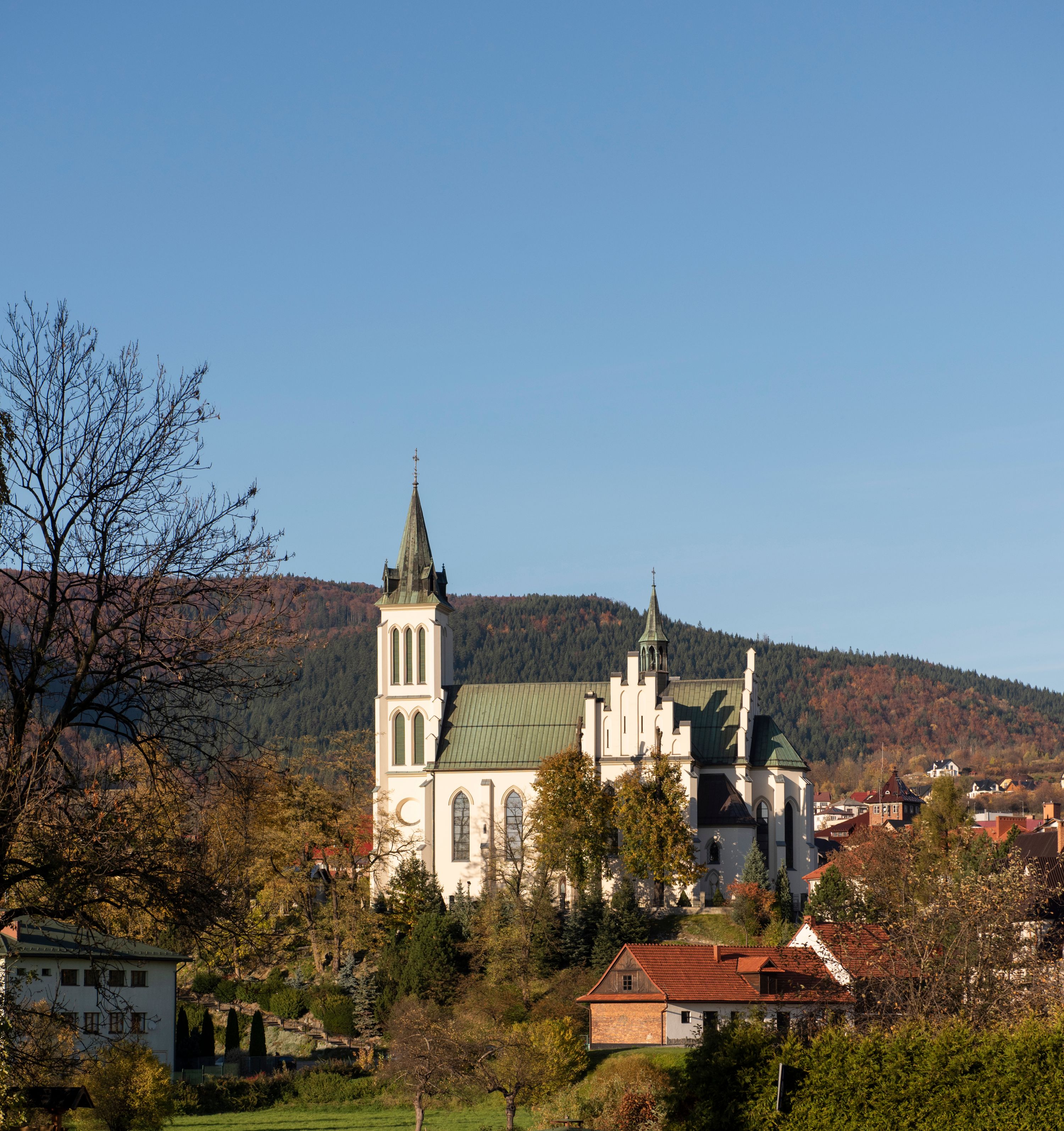 Church of Michael the Archangel in Mszana Dolna was built in 1891-1901 in the Neo-Gothic style. The temple was designed by Wincenty Wdowiszewski. In the church, the architect designed high, narrow windows that are divided into columns with pointed arch with closed top. These windows are stained glass ones and deserve special attention. The first of them was commissioned by Franciszek Mączyński (on the advice of then parish priest Józef Stabrawa) and was created by Juliusz Makarewicz in 1917. The stained-glass windows were made in the Stained Glass Workshop S. G. Żeleński in Cracow. The concept of the composition is a holistic project of church decoration, in which the main elements were wall paintings and stained glass windows. Another six stained glass windows were made in 1919 by the same artist group. Makarewicz's last work for the church in Mszana was a stained glass window depicting St. Michael the Archangel on the window of the chancel. At the turn of the 19th and 20th centuries, the church was equipped with altars. In 1910, a new baptismal font, confessionals and organs were purchased. Stations of the Cross, made by Józef Zając, hang on the walls of the temple. The oldest furnishings of the church include: a stone stoup from 1668, a painting depicting the Dormition of the Virgin from around 1530 (originates from the St. Anne's Church in Cracow), a painting of St. Michael the Archangel from the 17th century and a painting of St. Augustine and the Child from the 18th century. At the entrance to the church, it is worth paying attention to a bust of father Józef Stabrawa, a parish priest in Mszana Dolna for many years, who died in the Dachau concentration camp. The bust was made by the local sculptor Stanisław Ciężadlik.