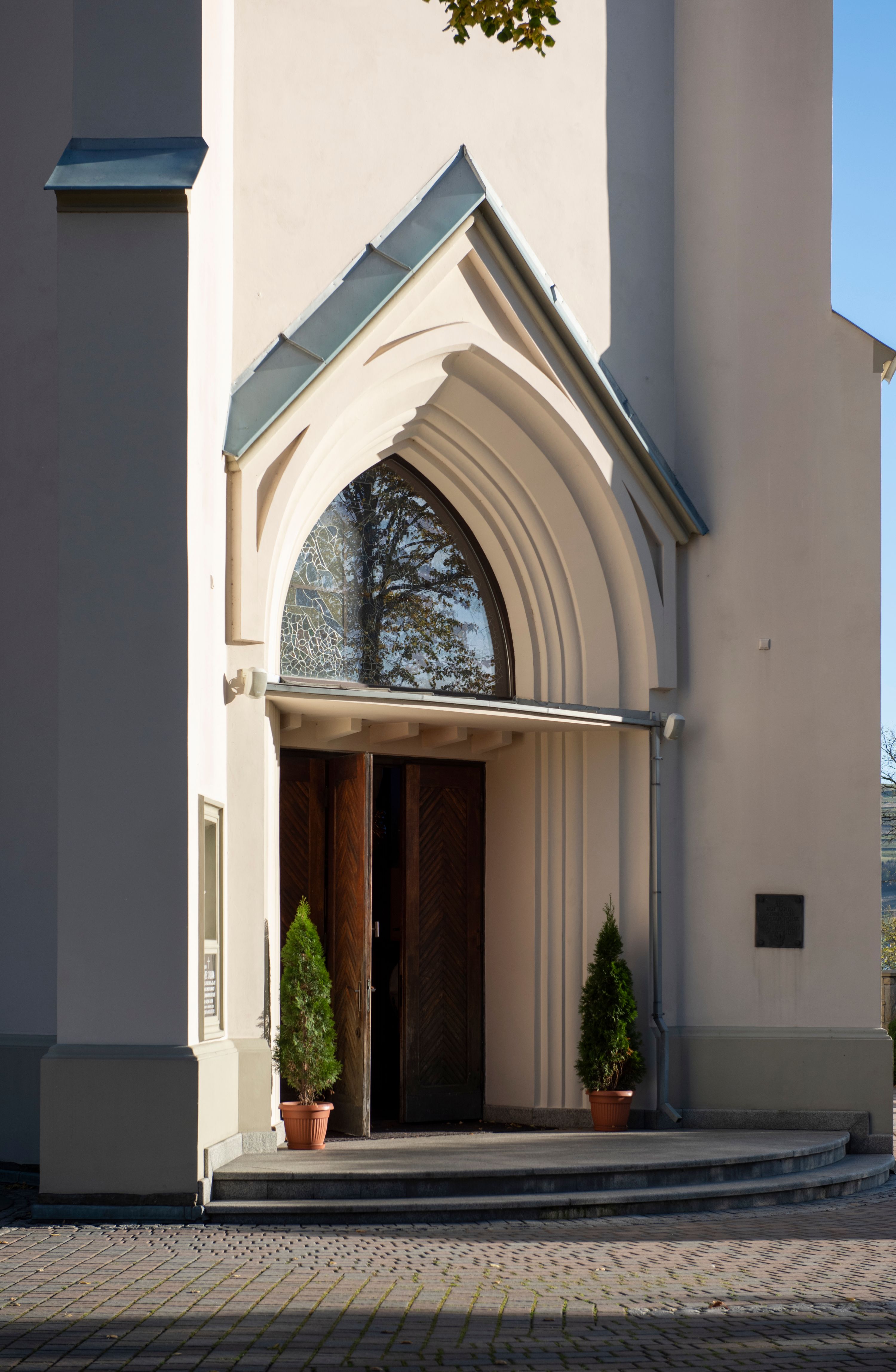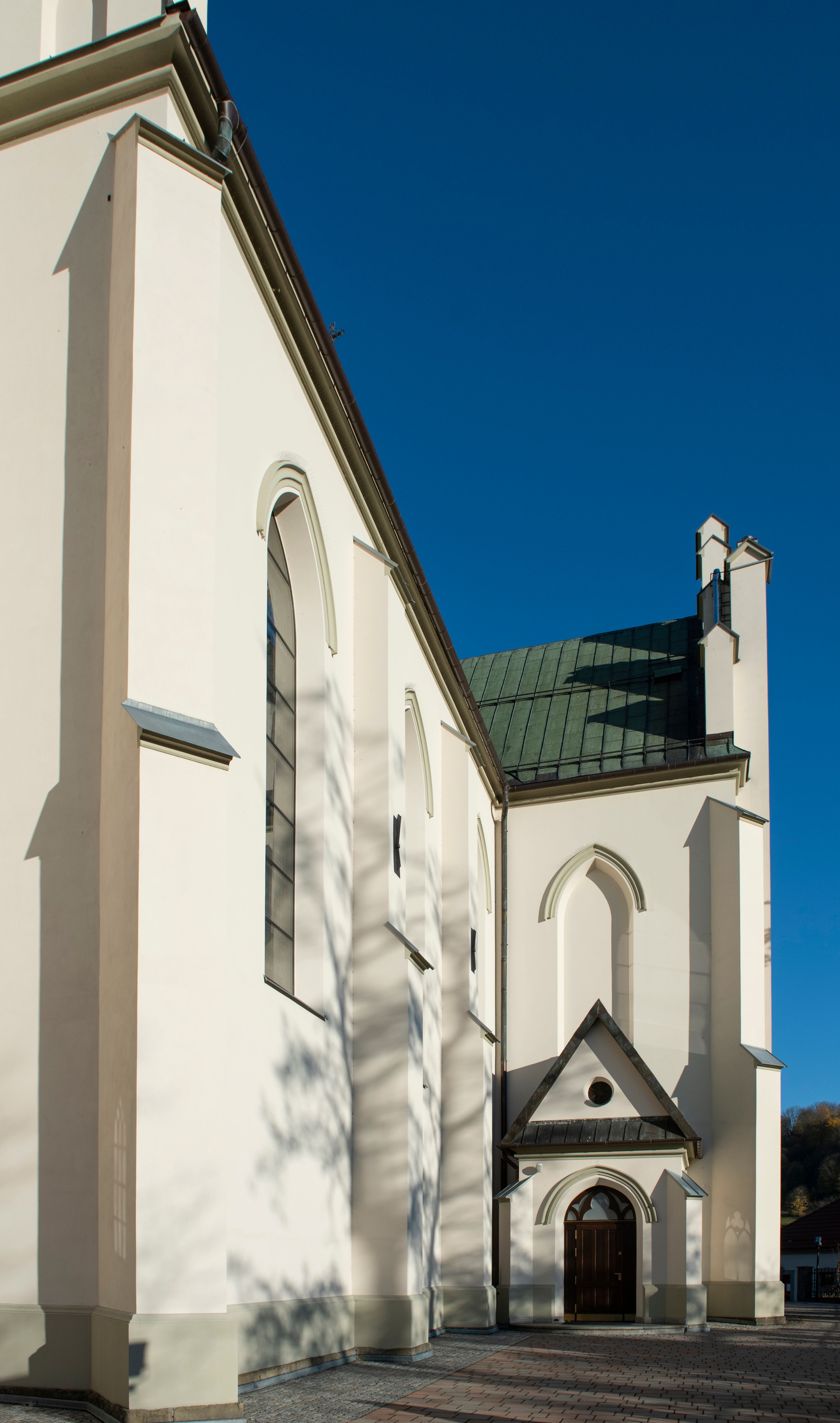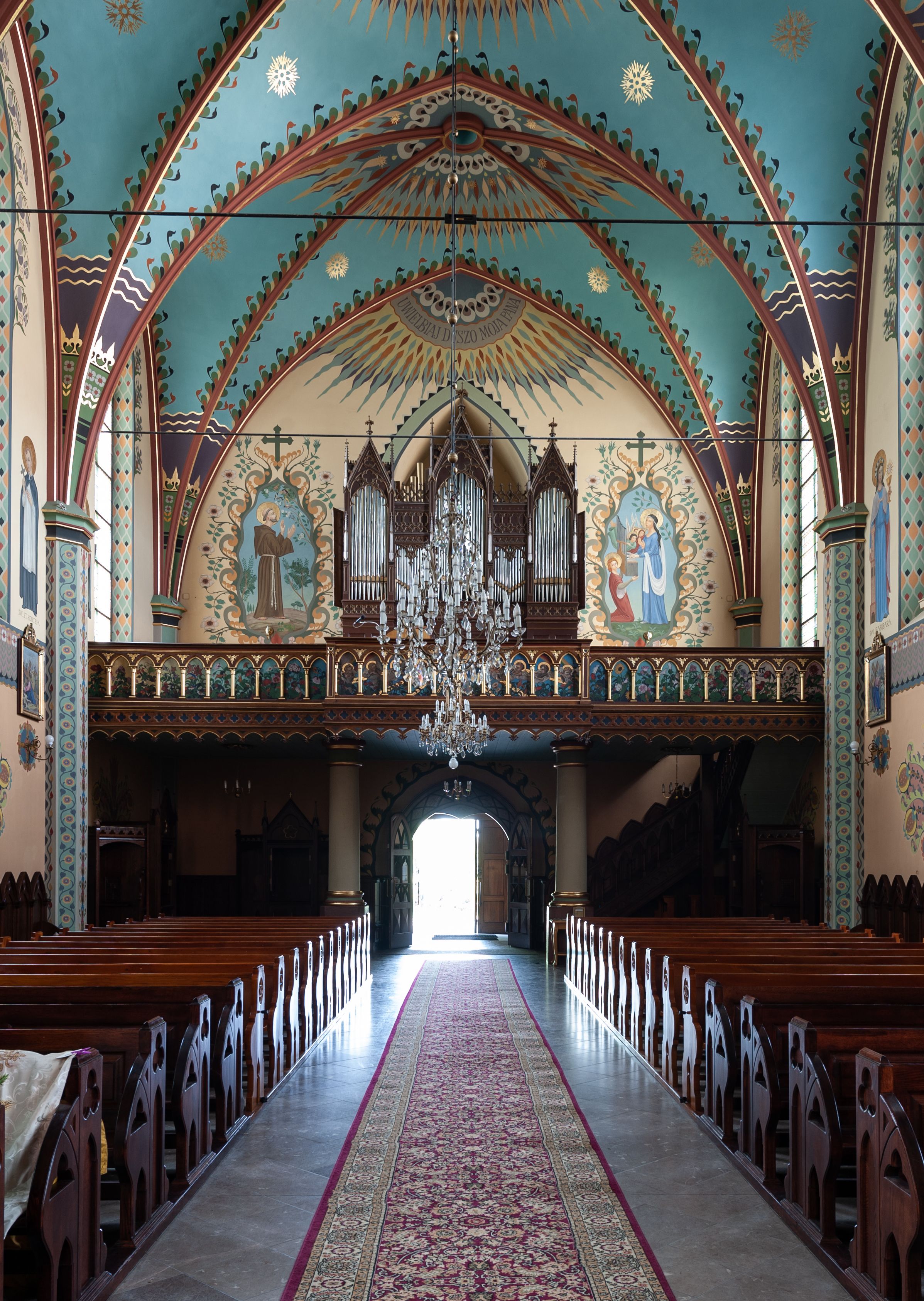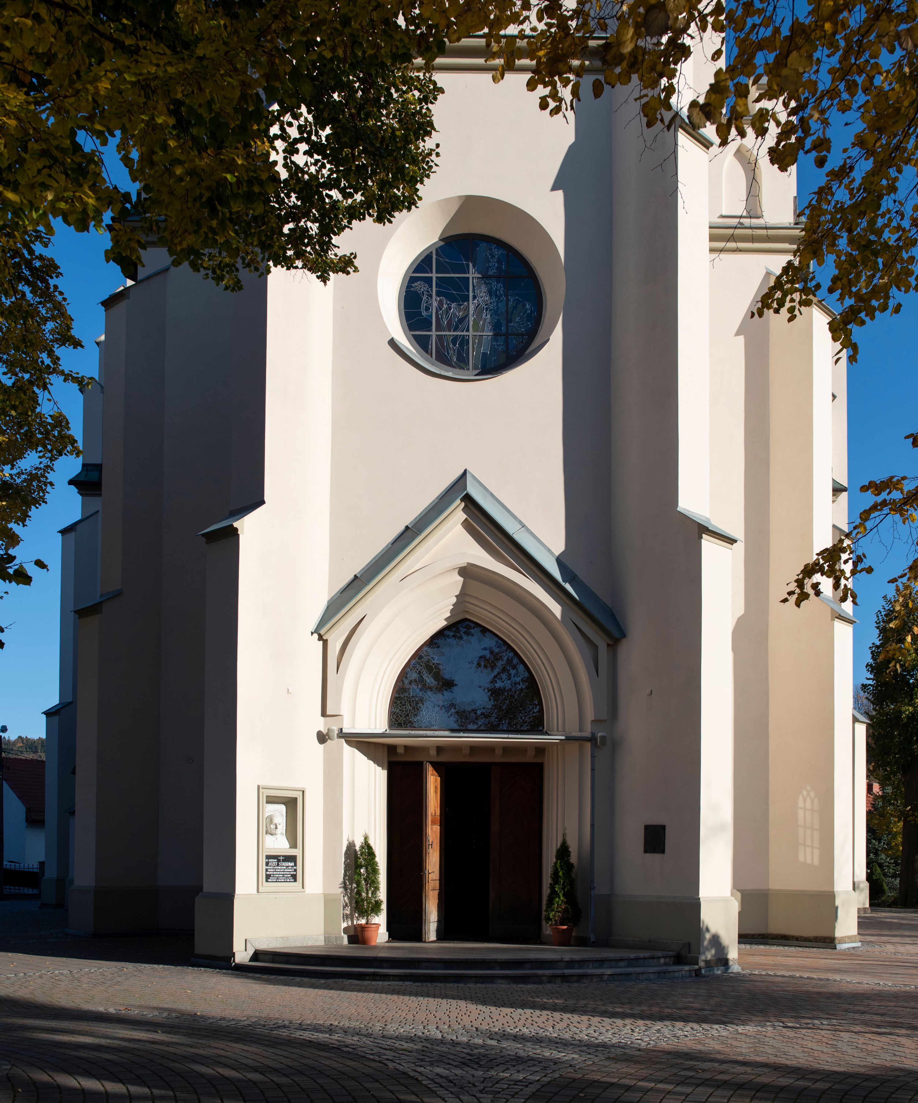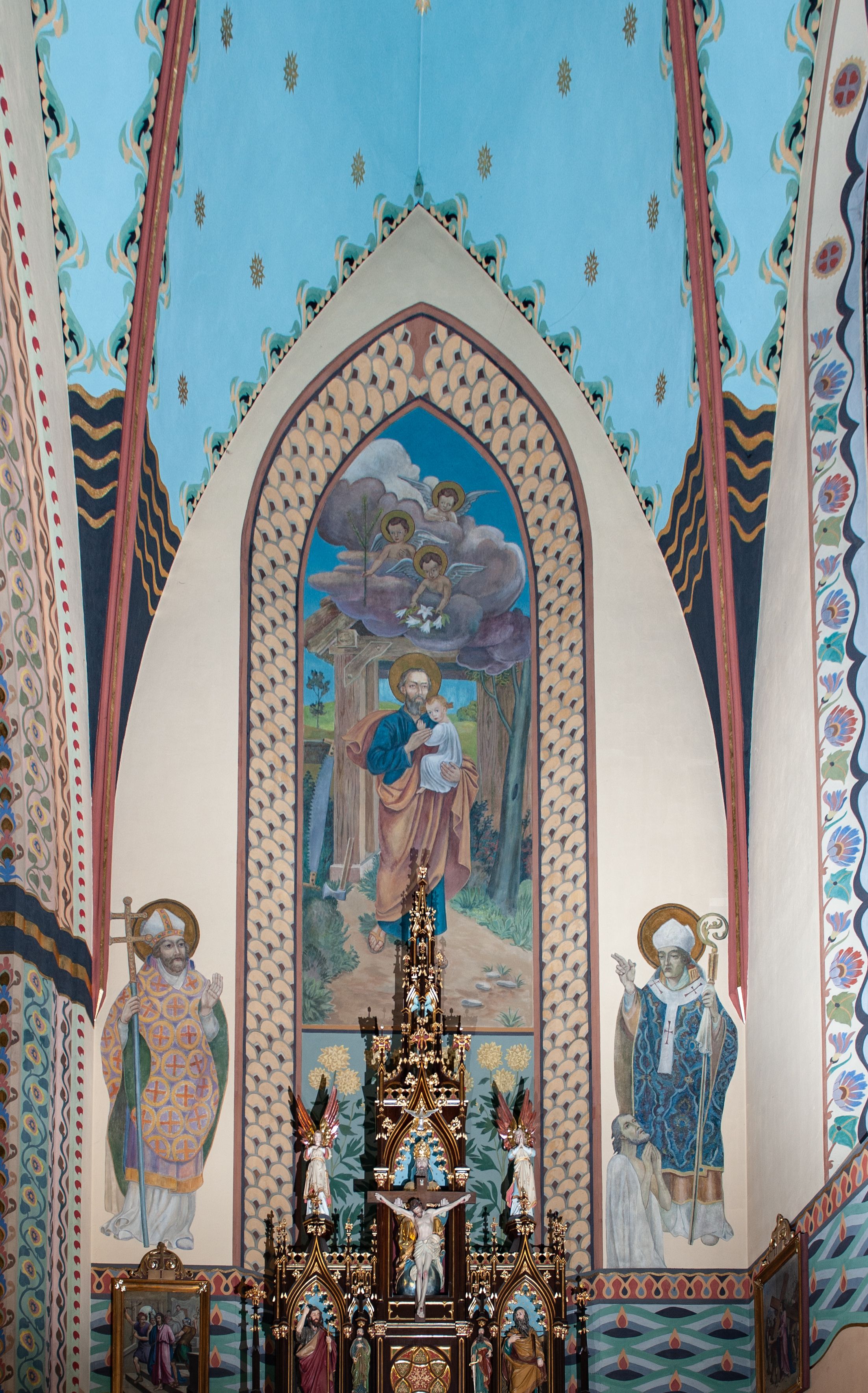 In 1956, the fourth neo-Gothic altar in the church, dedicated to St. Joseph, was built. The altar was made by Andrzej Węgrzyn and Stanisław Dobrowolski. In the middle area there is a painting of St. Joseph and the Child, created in a traditional iconographic pattern by the local artist Stanisław Ciężadlik. The artist also made a large crucifix placed above the high altar. The crucifix was installed there by Stanisław Jakubiak, a mason. In the years 1966-1969, stained glass windows were renovated while replacing all the glazings in the windows of the nave. In the following decade, stairs were built beside the sacristies on both sides of the chancel. Then, Maciej Makarewicz, together with his daughter Zofia and Józef Wiatr, carried out the conservation of wall paintings (1972-1974). The artist then created images of "Baptism of Christ" and "Sermon on the Mount" in the niches of the chancel, unveiled when the side altars were moved into the transept in 1971. As a result of these works, one altar was removed. On September 29, 1975, bishop Julian Groblicki consecrated the renovated paintings. In the following decade, brick porches were built in front of the entrances to the arms of the transept (in place of the wooden ones from 1964). In 1984, two new bells, made in Waleria and Janusz Felczyński's workshop in Przemyśl, were consecrated. The last stained glass in the church, with the image of John Paul II, was created in 2006 and put in the tower window. Altars and polychromes were conserved in recent years. At the entrance to the church, it is worth paying attention to a bust of father Józef Stabrawa, a parish priest in Mszana Dolna for many years, who died in the Dachau concentration camp. The bust was made by the local sculptor Stanisław Ciężadlik.