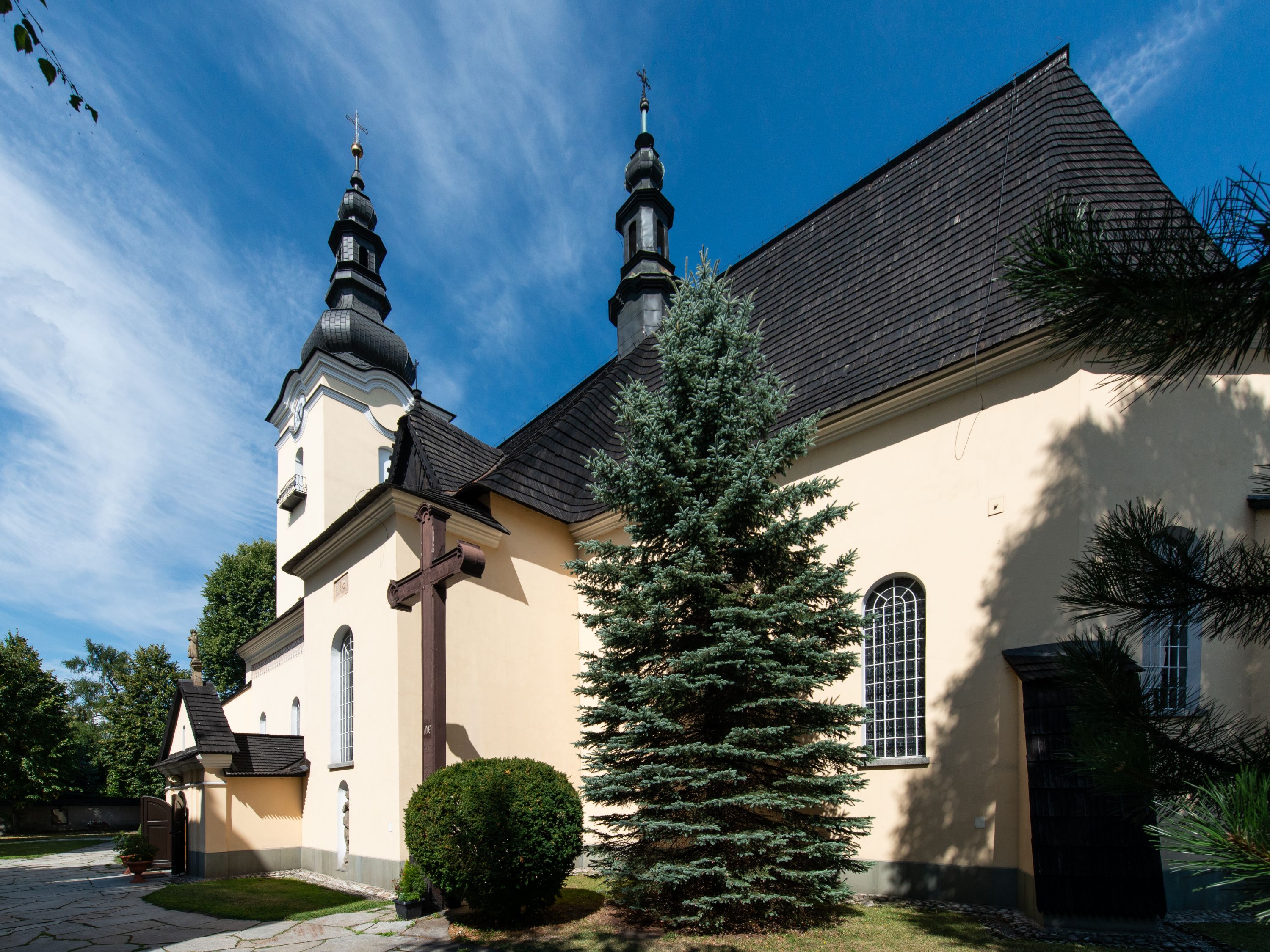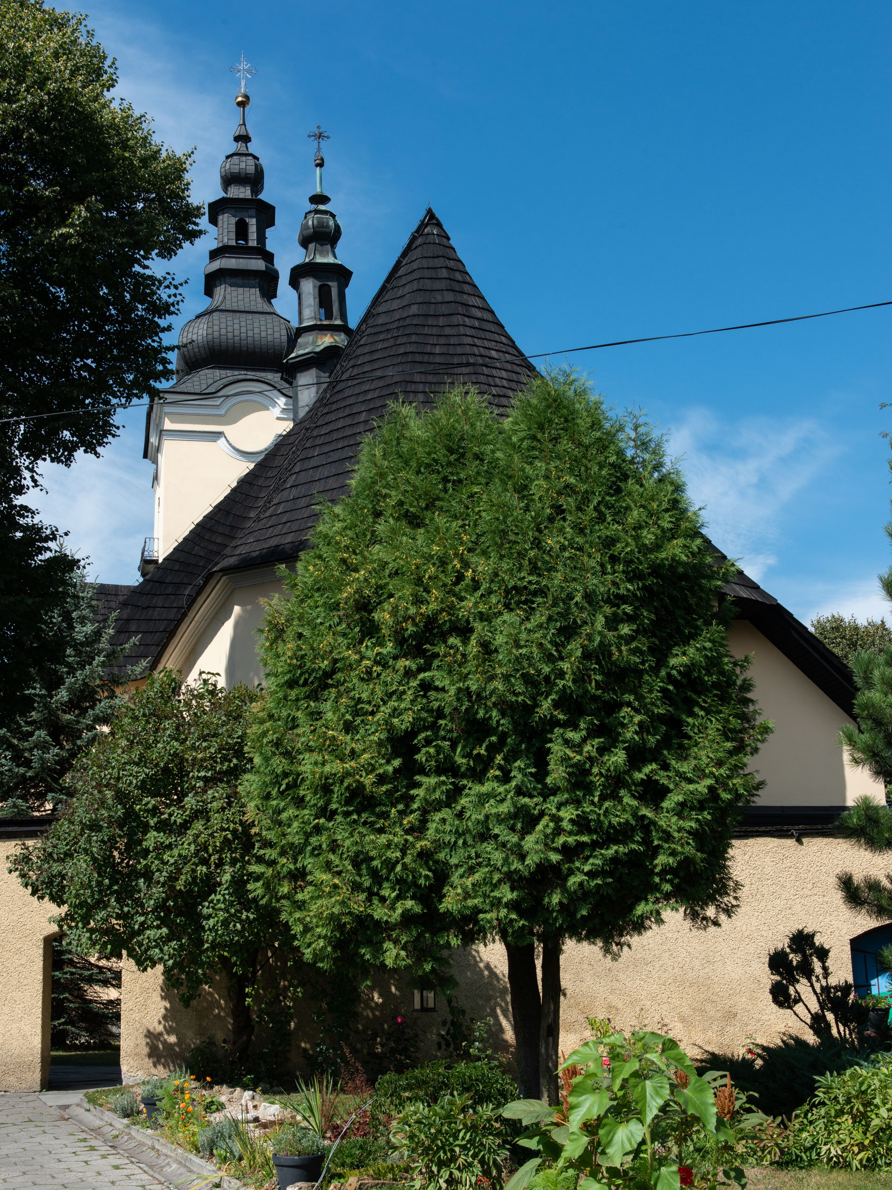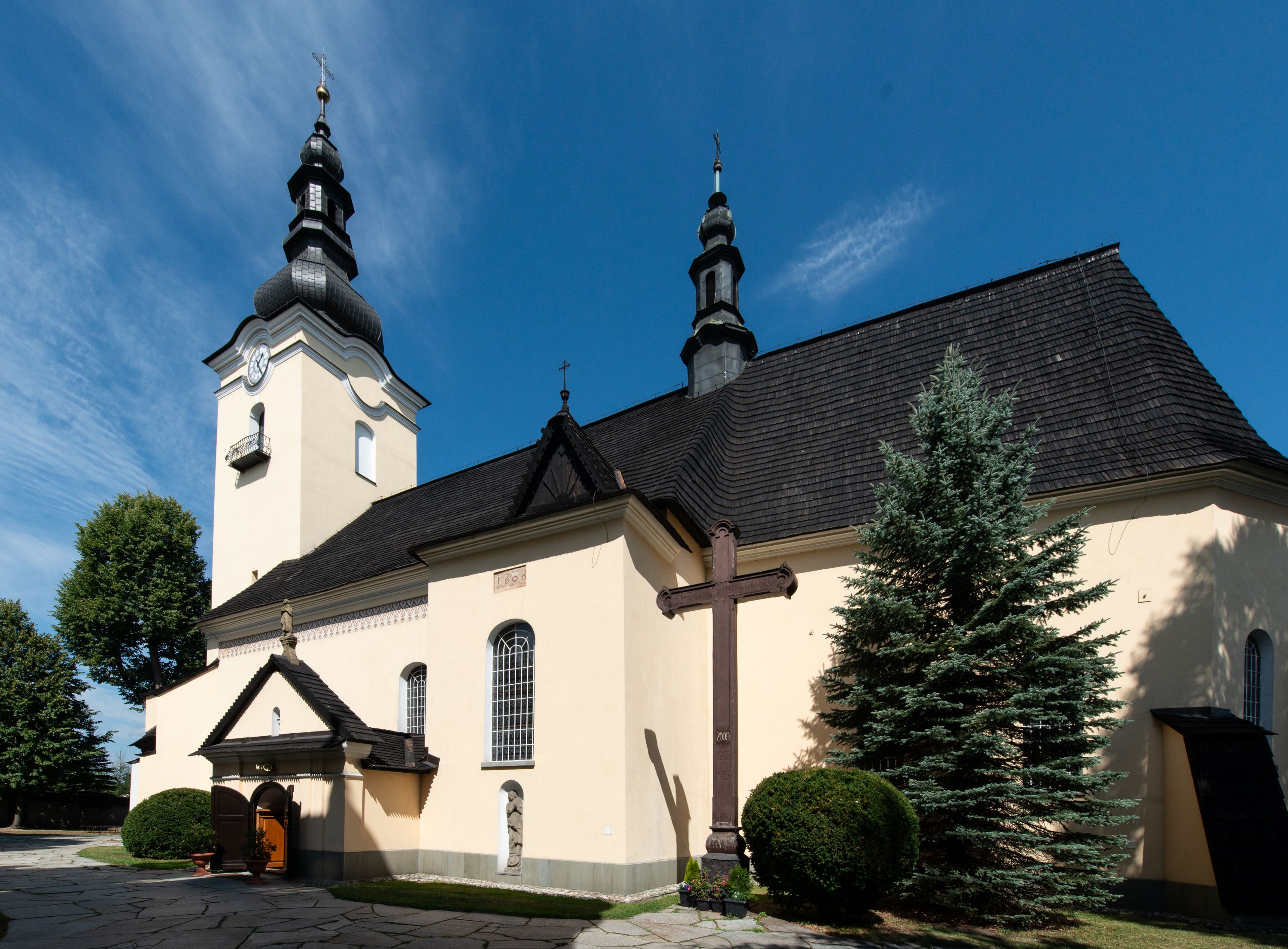 Church of Saint Catherine of Alexandria is a building with simple architectural forms, but with a complex record of the creation. The chancel was created in the first half of the 14th century, and the nave in 1601-1655, which, as evidenced by the inscription on the wall, was erected by Piotr Czarny, a bricklayer. The high altar was built in the first quarter of the 18th century, however it was significantly changed in the 19th century. In the main area of the altar there was originally a painting of Saint Catherine by Franciszek Lekszycki. It is currently occupied by a copy by Władysław Rossowski from 1892. Noteworthy is also the choir parapet from the first quarter of the 18th century, decorated with paintings modelled on engravings illustrating the work of the Flemish Jesuit Herman Hugo "Pia desideria emblematis elegiis et affectibus SS. Patrum illustrata", i.e. "Pious desires, explained with emblems, elegies and feelings of holy Fathers", issued in 1624 in Antwerp. In the chapel of the Virgin Mary, in turn, closed with an 18th-century lattice with a Marian monogram among lilies, there is an altar funded by prebendary priest Adam Gorczyński (1753-1760), and two paintings located in it: Our Lady of Perpetual Help in the main area of the altar and the Assumption of the Blessed Virgin Mary in the altar finial. On the eastern wall of the chapel, there is a painting of the Holy Family from 1516, moved to this place for security reasons from the cemetery church of Saint Anne in Nowy Targ (a copy by Marek Hapka is placed there). In the chapel there is also a baroque baptismal font, the core of which is an angel supporting the bowl like a caryatid. Inside the temple there are Stations of the Cross hanging, from 1894, painted by Stanisław Bryniarski.