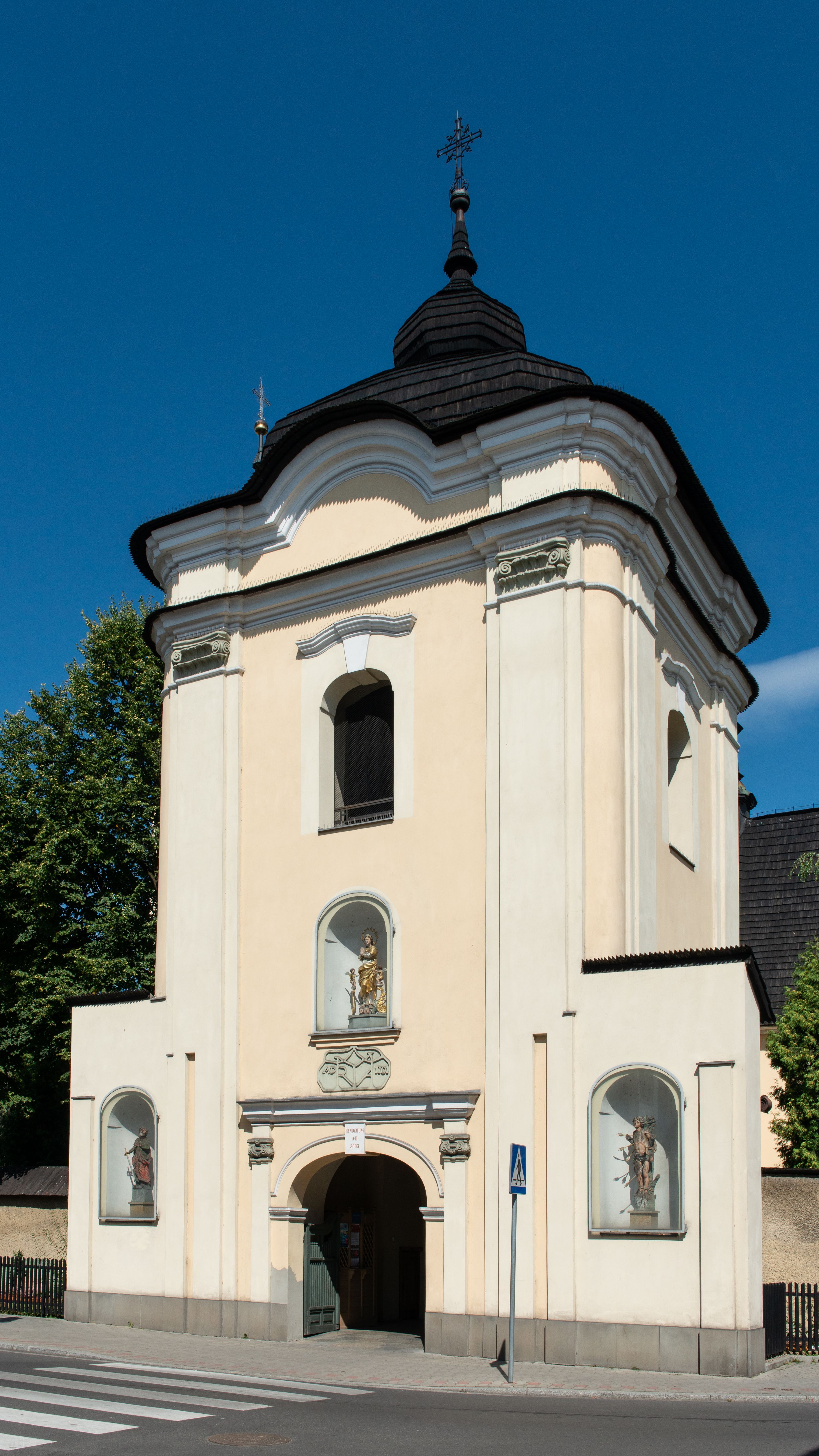 The first church under invocation of St. Catherine of Alexandria in Nowy Targ was founded in 1327 (or 1326). The temple was noted in the files of the episcopal visit from 1596 with a description that the chancel was made of brick and the rest of the church was wooden. There were four altars, organs and a crucifix on a chancel opening beam. The church burned down on May 7, 1601 along with the entire city. It was just the brick chancel with the high altar and the sacristy that were not damaged by the fire. King Zygmunt III, upon hearing of this damage, released the inhabitants of Nowy Targ from all taxes and tributes for a period of four years. In the years 1606-1655 a new stone church was built, as evidenced by source documents, as well as an inscription found during the renovation in 1926 on the outer southern wall: "AEDIFICATA H(A)EC EC[C]LESIA / A[NNO] D[OMINI] / 1606 / PETRVS CZARNY MVLARS "(a fragment of the decorative frieze was also exposed at the western corner of this wall). On September 14, 1649, Bishop Wojciech Lipnicki consecrated the church. The rosary chapel deserves special attention. According to some researchers of the history of the church in Nowy Targ, it was built in 1634, according to others in 1717, according to the act of the foundation of priest Mikołaj Szczegliński, when it was granted its own organist, organ, cantor, bell tower, equipment and canonicals. The chapel was founded on January 13, 1771.