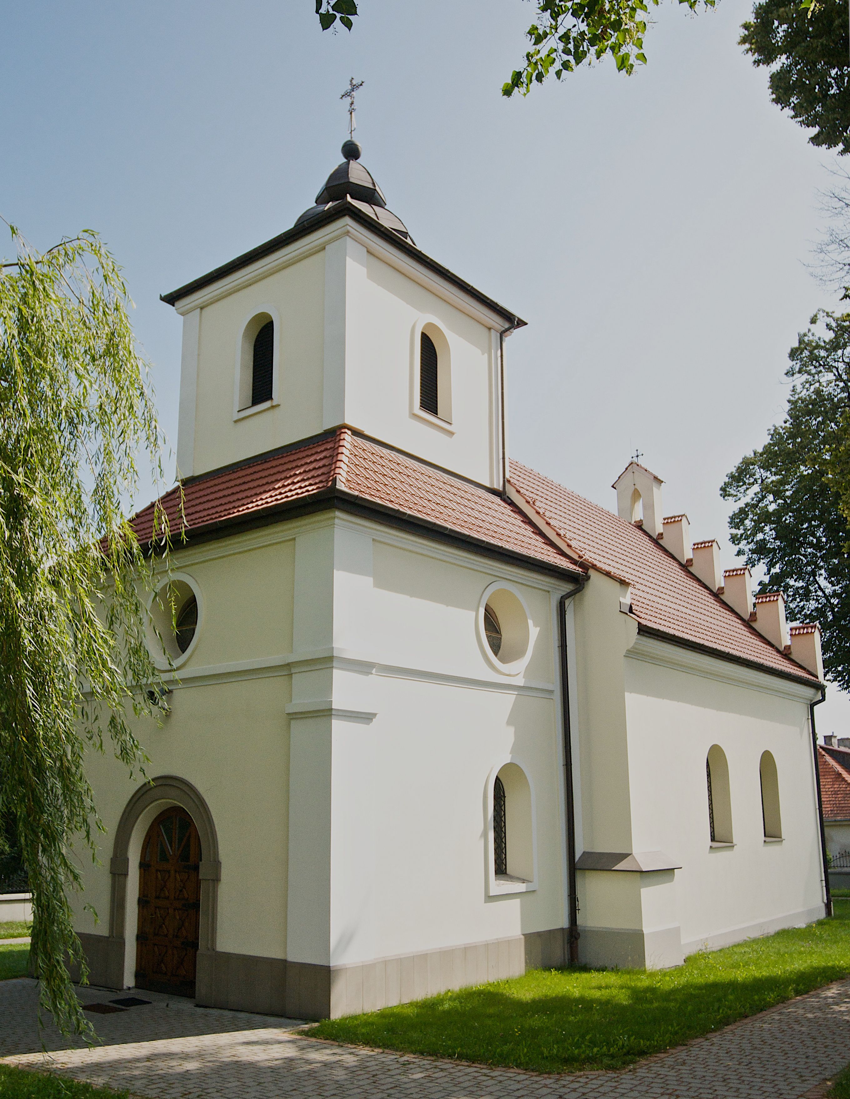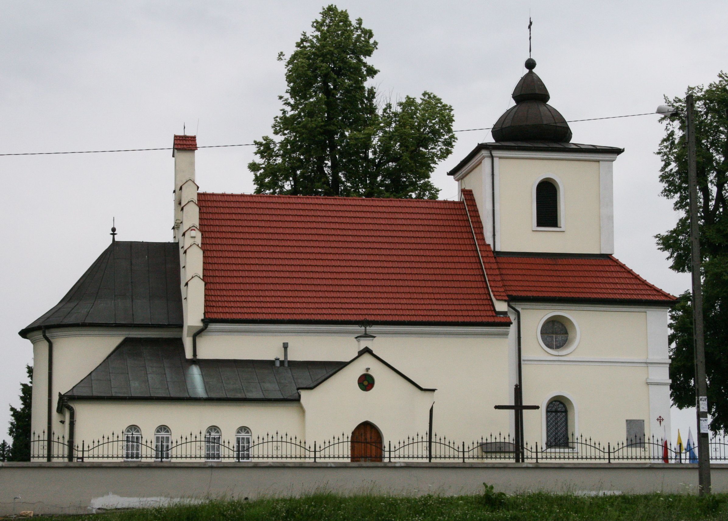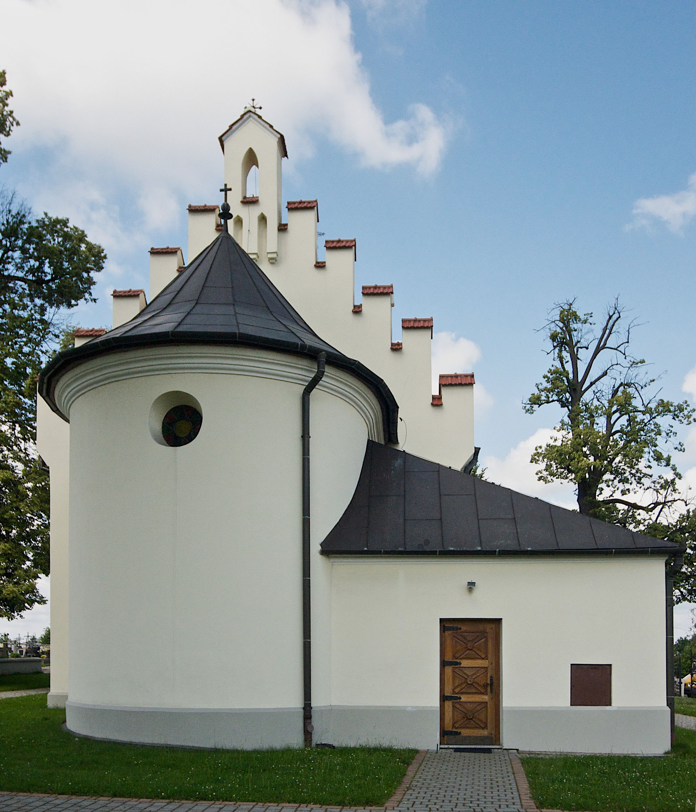The Church of St. James the Apostle in Sanka was built from the foundation of Zygmunt Świerczowski in 1618–1625. After a short period of time, on the initiative of then owner of the village, the church was transformed into a Calvinist church. This situation did not last long and concerned only the owners of Sanka. At that time, the faithful attended the temple in Rybna. The owner of the village, however, converted before his death to Catholicism and the church became Catholic again. On October 5, 1625, Tomasz Oborski – the Bishop of Cracow, solemnly re-consecrated the church. In the second half of the 17th century, the church in Sanka was quite well equipped – it had i.a. three altars. In the high altar of the temple there is still the painting depicting Madonna of Sanka, dating back to this period. The cult of the image already existed in the 17th century, as evidenced by panels with votive offerings, placed next to the painting in 1663. In 1846, the Miraculous Image was transferred to the high altar (according to the parish chronicle: "for greater honour") and the main patron – St. Jacob – was transferred to the side altar. According to historical tradition, the reason for transferring the painting was the gift of offspring begged by the village heiress. A woman lost her pregnancies as a result of miscarriage several times. After hearing her prayers at the feet of the Mother of God, she asked the bishop for permission to transfer the painting to the high altar. The image of Madonna of Sanka (created on May 22, 2015) was topped with episcopal crowns. The faithful ask for special favours in front of this painting and offer votive offerings. In the 19th century, the temple and its surroundings changed their appearance many times. In 1834, the building was enclosed by a stone wall with corner chapels. In 1860, a sacristy was added from the northern side, and a nave was covered with an apparent barrel vault. The next change of the building's body took place in 1873, when a wooden tower was erected. Current appearance of the temple is the result of restoration works initiated in 1996. The temple has the 19th-century high altar and two 18th-century side altars. At the left side altar there is a baptismal font, mentioned in sources from 1644. Epitaph plaques of members of the Świerczowscy and Kochańscy families belong to very interesting monuments of the temple in Sanka. These epitaph plaques were made of the famous in the 17th century black marble quarried nearby Dębnik. There were also workshops specialising in the processing of raw material, and their products (plaques, altars, baptismal fonts, etc.) decorate many temples nowadays, including such well-known temples as the Wawel Cathedral or Benedictine monasteries in Tyniec and Camaldolese monks in Bielany (district of Cracow). In addition, coffin portraits have preserved from sepulchral art, including the portrait of Zofia Kochańska, which is particularly popular among visitors to the temple, belongs to a special branch of painting – coffin portraits, depicting the realistic image of a deceased person, but shown as alive. The piece was created in the third quarter of the 17th century. It is a part of a seven-piece set of epitaph plaques commemorating the funders of the church from the Świerczowscy and Kochańscy families, buried under the church floor.