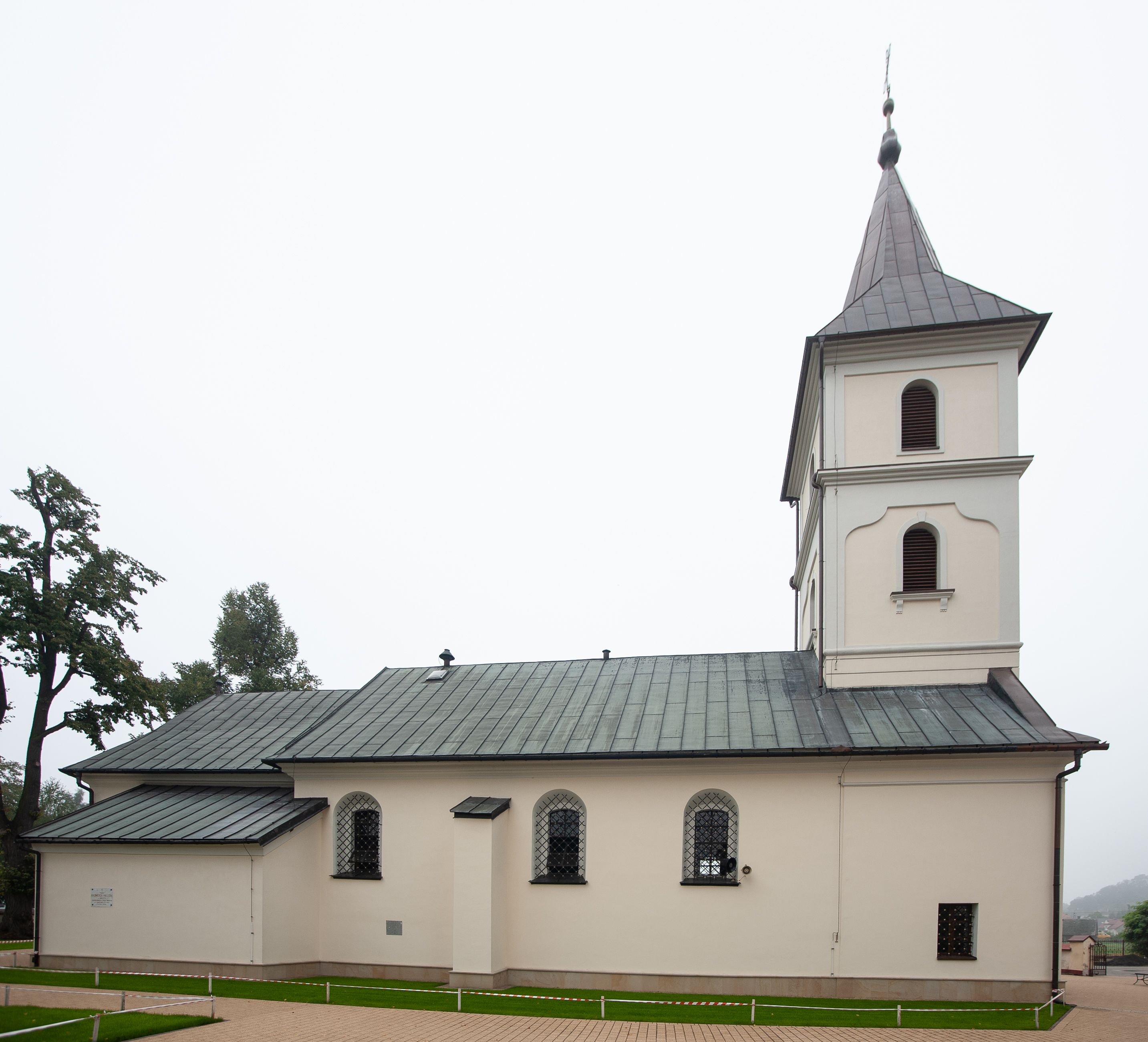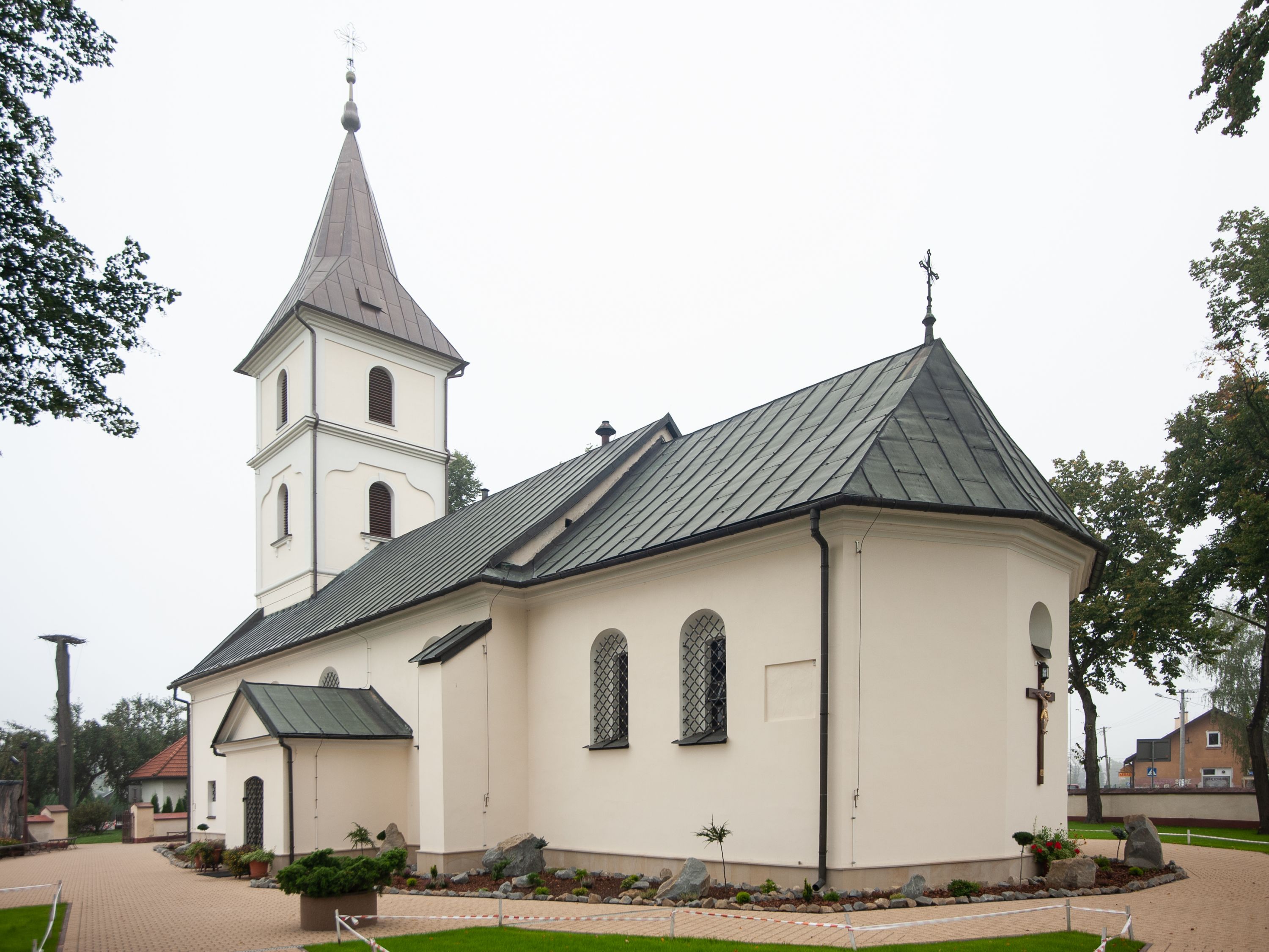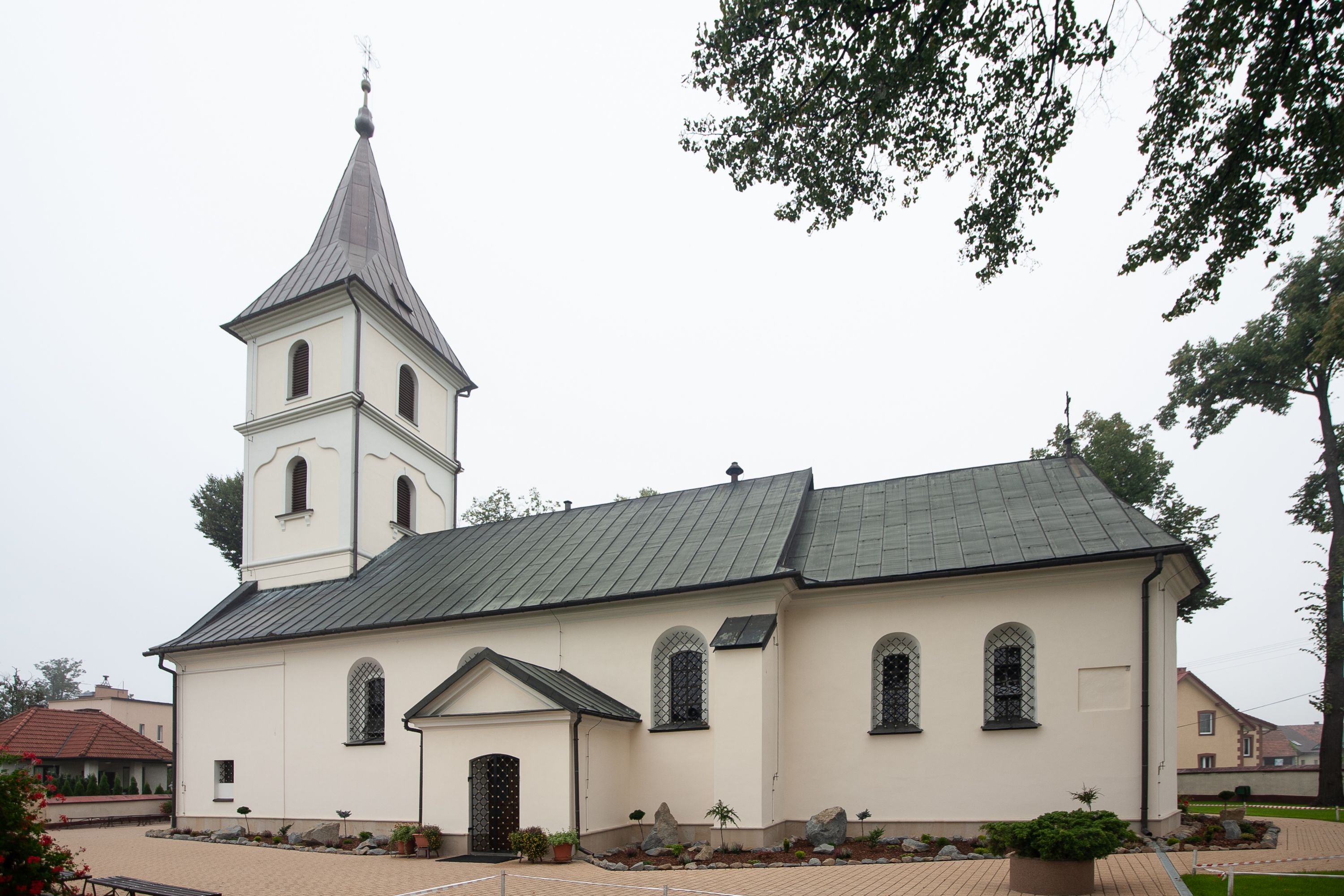 The church in Radziszów was first mentioned in 1325. The current one was erected in the 15th century, however, it was burnt in 1844 and rebuilt until 1847, and consecrated again in 1857 by Bishop Alojzy Pukalski. In 1867, a new tabernacle made by master Otręba from Maków was founded. In 1916, a new balustrade was installed in front of the high altar. In the interwar period, the organ was renovated and the high altar was regilded. In 1992, the tower was renovated and the roofs were covered with sheet metal. In 1927, the walls were covered with polychrome designed by Franciszek Przebindowski and a stained glass window depicting the Madonna of Częstochowa was fitted. In 1939, an explosion broke all the windows in the church, including the mentioned stained glass. Another polychrome was made in 1950 according to drawings by Adam Witkowski (conservator and goldsmith from Kraków), and in the same year the church was electrified and the ceiling was replaced. In 1952, the polychrome of the chancel was supplemented, the Way of the Cross was renovated and the facade was repainted. In 1967 all the windows were replaced, in 1974 the polychrome was renewed, and in 1978 the oak panelling was installed and the tower was refurbished. In 1998, the churchporch, door, loft and sacristy were renovated. The current polychrome, including its earlier parts, was created in 1999–2000 and is the result of the work of a group of artists: Maria Augustynska, Jakup Gujda and Halina Wasyl under the direction of Krystyna Sokół-Gujda. In the same years, the interior and furnishings of the church were renewed. The tower damaged during the storm in 2007 was rebuilt in 2011.