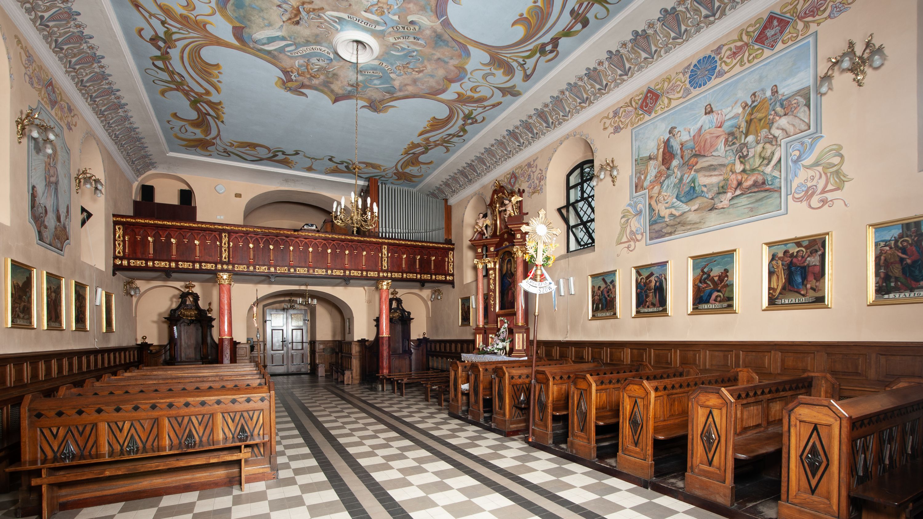The church of St. Lawrence in Radziszów was built in 1844-1847 on the foundations and preserving a part of the wall of the former church that was burnt. It was made in an economical, Josephine style and the construction was financed by Countess Halina Dzieduszycka. 17th century right side altar with the images of St. Catherine and St. Lawrence (made one century later), richly sculpted presenter's pew and 17th century baptismal font are the elements of the church furnishings that are worth noting.