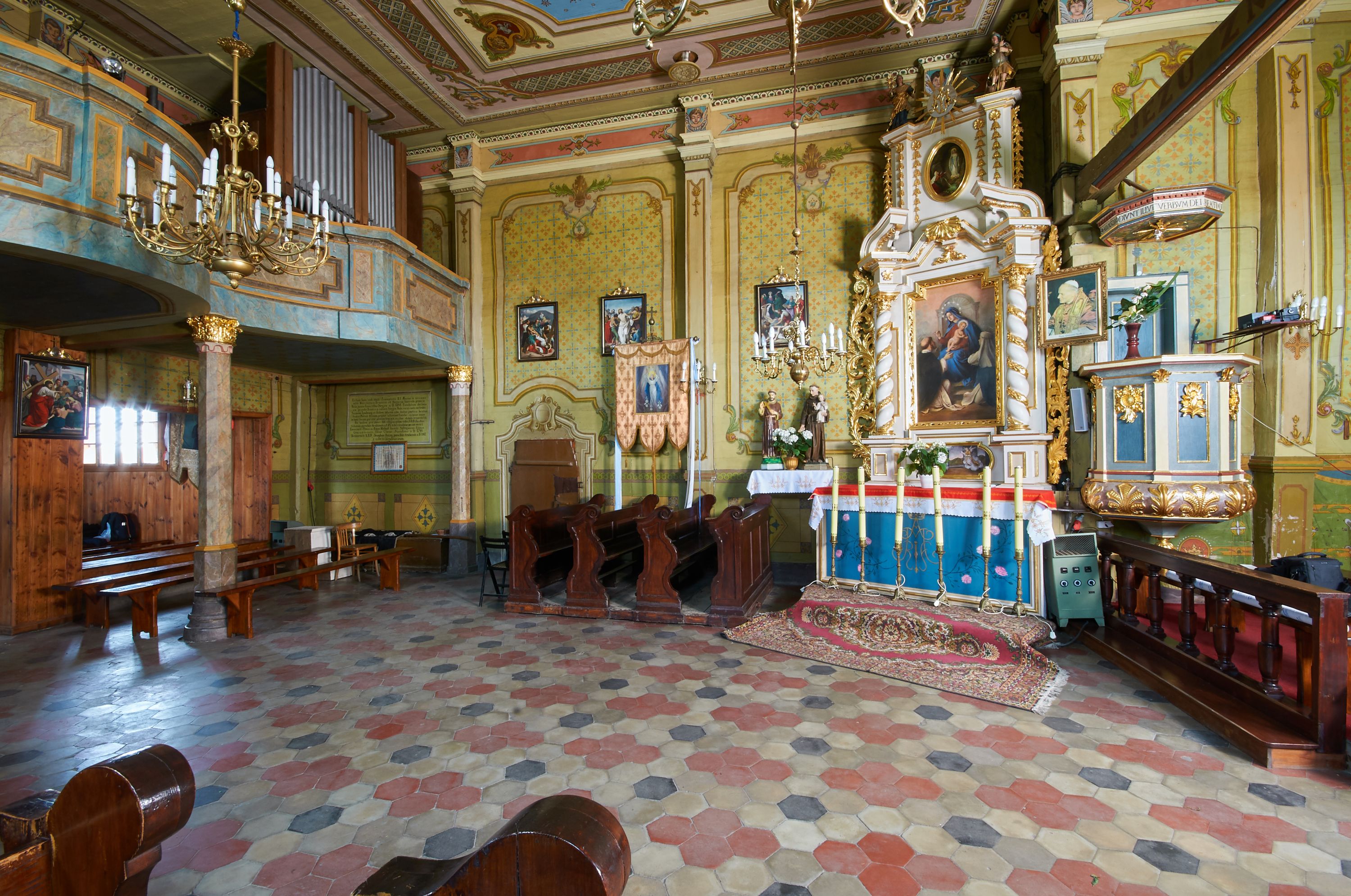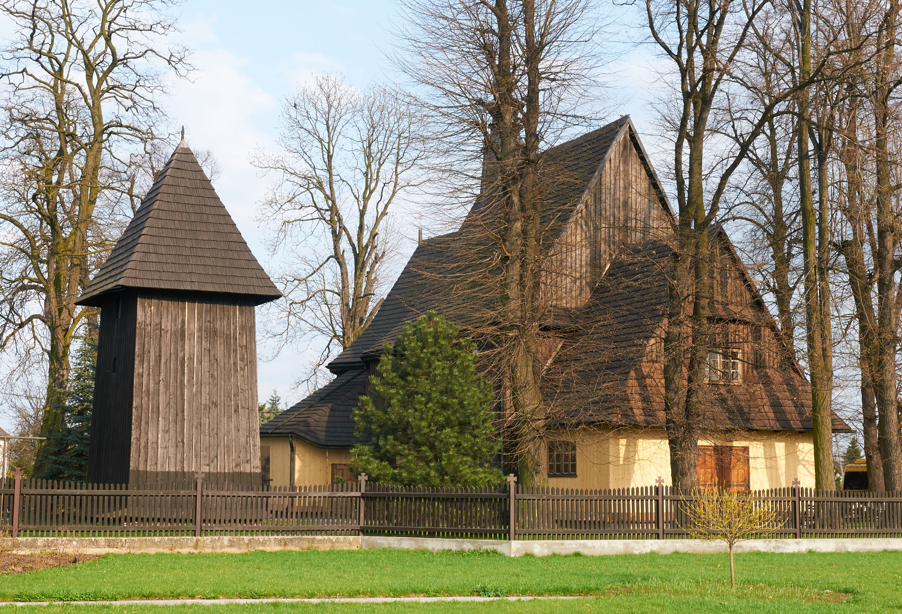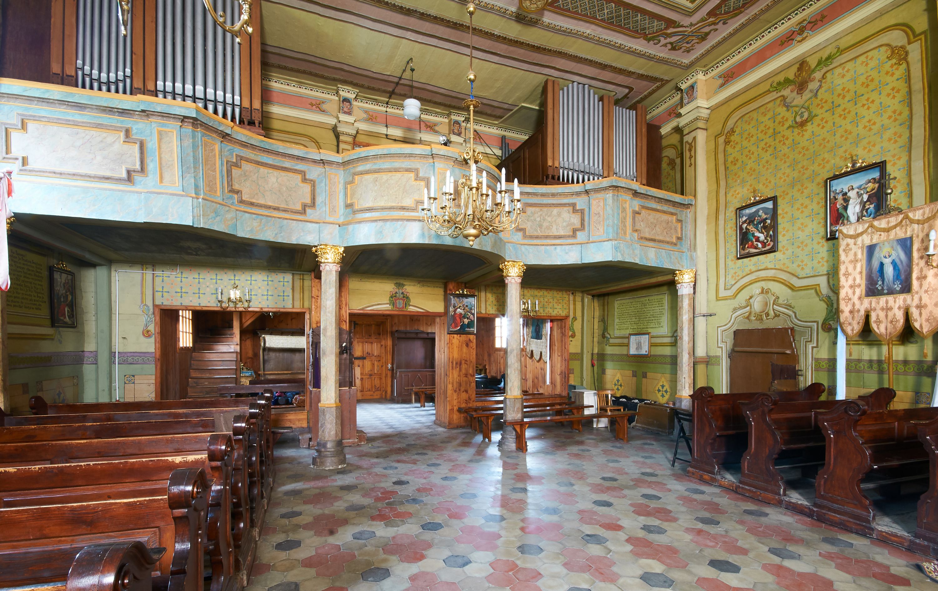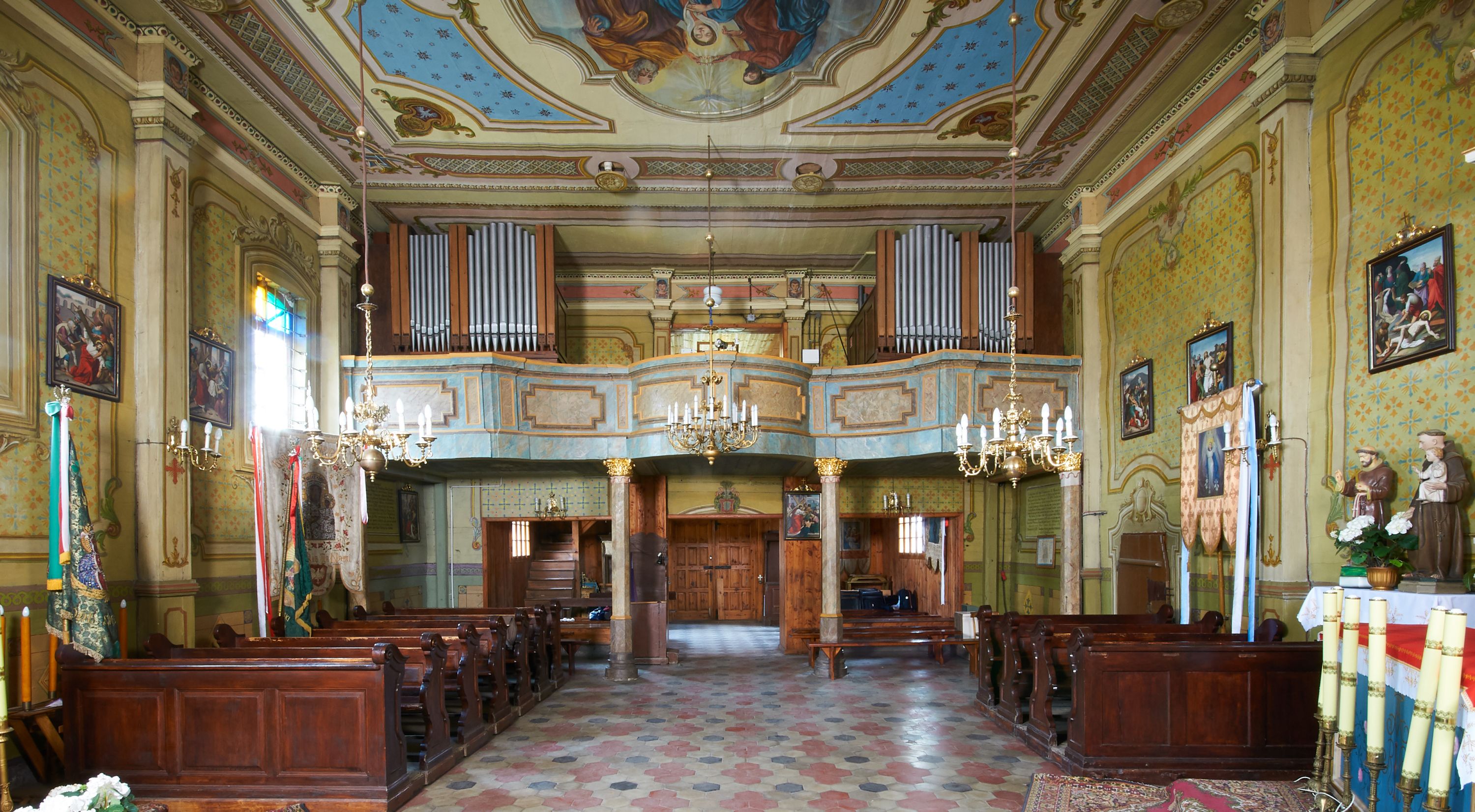 In 1742, work began on relocating the temple again - to another place in Grabia, a meadow called Gruczyn, where it is still located today. The work was initiated by the then parish priest Jakub Cichoński and Father Wawrzyniec Rempalski, Dean of Proszowice. In the above-mentioned year of relocation, masses were still held in the former church. This proves that the temple gained almost a completely new form and new furnishings, and only a part of the building material from the old church was used for its construction. The new church was consecrated on 14 September 1749 by Bishop Michał Kunicki. The created building obtained mainly new architectural and sculptural furnishings. In the visitation acts of 1747, five altars were mentioned, namely the main altar of Our Lady and the side altars of St. Joseph, St. John Cantius (on the right) and St. Anne and the St Sa.lvator (on the left). In the temple, there also was a pulpit and an organ loft. The church was repainted in 1754 (such a date was once painted on the rainbow). In 1835-1836, the temple was repaired. The beams were then pulled up (the base on which the wall rests) and walls were fastened with oak clamps. Three mensas were set in the altars, namely the high altar, St. Joseph's altar and the altar of Transfiguration of Jesus. This proves that there were only three altars in the church at that time, which were the only altars with the invocations indicated. In 1844, the church was repainted again. In 1879, the church floor was repaired: "hard stone floor brought from Rzegocina was used in the nave from the rood screen to almost half of the floor, while the rest was laid with old stones", the oak thresholds were thrown out, and, in their place, turned oak bases were installed under all pillars. In 1885, from parishioners' contributions and at his own expense, parish priest A. Konopiński bought four windows for the south side of the building "with colourful ornaments in oak frames." At the turn of 1899 and 1900, a new shingle roof was installed on the church, while the garret and ridge turret were boarded with planks. In 1907, in the days of parish priest Józef Raźny, the condition of the church was described as bad and a thorough renovation started. Rotten stringpieces were replaced with new oak ones, and concrete-reinforced foundation was laid under them. The church was lined with a cement floor and the rest, which was in good condition, was laid in the sacristy. The church was repainted with oil paints on the inside and outside. The polychromes of the interior with the scenes of the Assumption of the Blessed Virgin Mary in the presbytery and the crowning of the Blessed Virgin Mary in the main nave were made by Jan Talaga from Kraków. "The decorative part of the entire church is attributed to Mr. Michał Tarczatowicz from Bochnia." The pillars supporting the walls of the church were boarded with planks in the form of "prism-shaped pilasters" with chapiters. The cost of the renovation was 6400 Crowns, which were collected from voluntary contributions. In 1911, a new floor was laid out in the loft and an additional doorway was created in the sacristy due to fire concerns. The church was seriously damaged during war operations in 1914: "The roof of the bell tower, the roof of the Church, the organ and the loft, the altar of St. Anthony, the Baroque pulpit, the northern wall of the church, flags, banners, the Gothic lamp, the hanging candle holder, all of it was destroyed and all the windows were smashed. After these events, the parish priest applied makeshift fixes to the roof and fitted glass into the windows. In 1916 "through the k.u. k. Society of Heritage Art, I [parish priest Józef Raźny] managed to obtain a subsidy for the restoration of the Church in the amount of 3100 Crowns, for which I covered the larger portion of the church's roof with new shingles, inserted a new northern wall of the church at the former altar of St. Anthony, repaired the truss in the attic, filled holes in other walls with new flat logs, and put a concrete foundation in place of the oaken sill plate that had been crushed by cannonballs on the southern and western side." Subsequently, the pulpit was renovated and the organ loft in the church was renovated the following year. In 1919, a pump organ was bought instead of a pipe organ. In 1929, a new altar of Our Lady of the Rosary with her painting was built in place of the destroyed altar of St. Anthony. In 1937, thanks to the parishioners' contributions, half of the roof was covered with shingles, and the works on the second half of the roof were completed in 1941. In 1947, a fence was built around the church. In 1956, the church was electrified and equipped with new lamps. A year later, a renovation of the church financed by the parishioners' contributions commenced, namely the roof of the sacristy and the northern side of the church were covered with shingles. Carpenters from Niedźwiedź were brought in for that purpose. The decayed ridge turret was replaced with a new one, covered with sheet metal. The next stage of the works in 1958 was the laying of new foundations for the church and covering of the underpinning with shingles, which was conducted by highlanders from Niedźwiedź. Jan Kalisz from Brzegi painted the church from the outside. Renovation of the polychrome and the entire interior was carried out a year later by Józef Nawałka from Kraków together with five assistants. During the ministry of the parish priest Józef Masłowski, namely in the years 1979-1986, the church was extended by a porch on the western side, the entire church was boarded with new planks on the outside, and all the doors were replaced. In April 1989, Różecki from Kętek painted the Garden of Gethsemane on the eastern, outer wall of the chancel. A year later, with the help of the parishioners, the church, its external facades and the roof were secured with varnish. In 1997, Dorota Wąchalska performed polychrome co