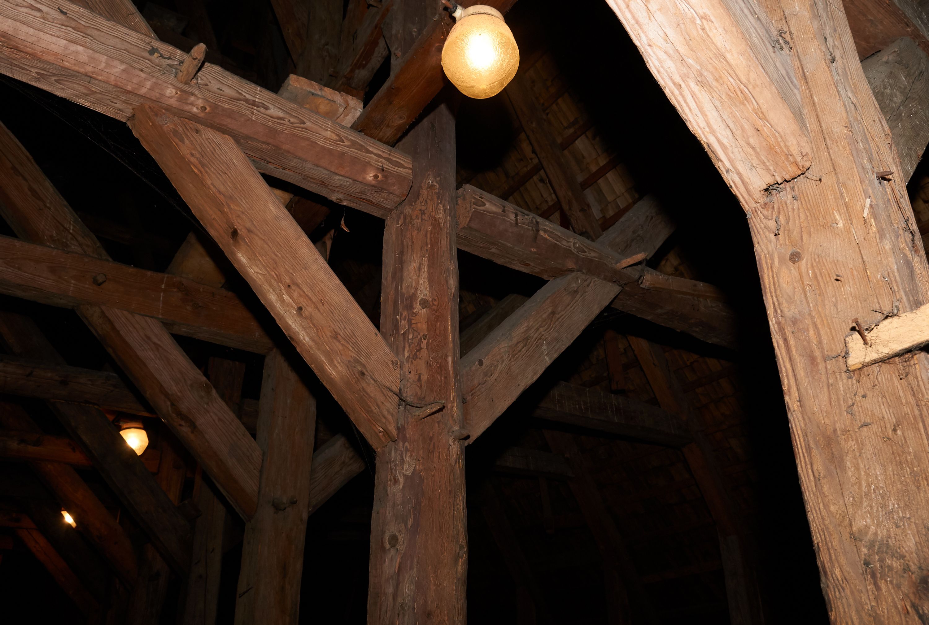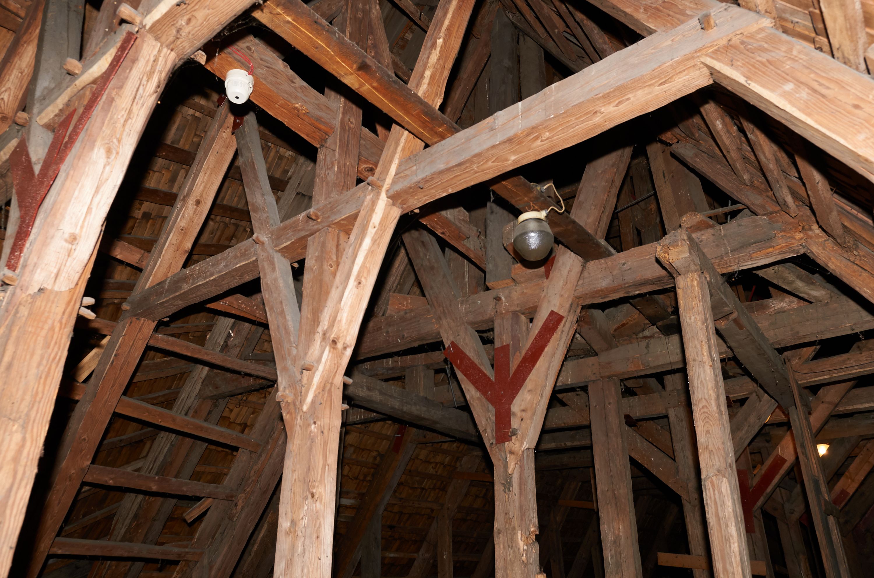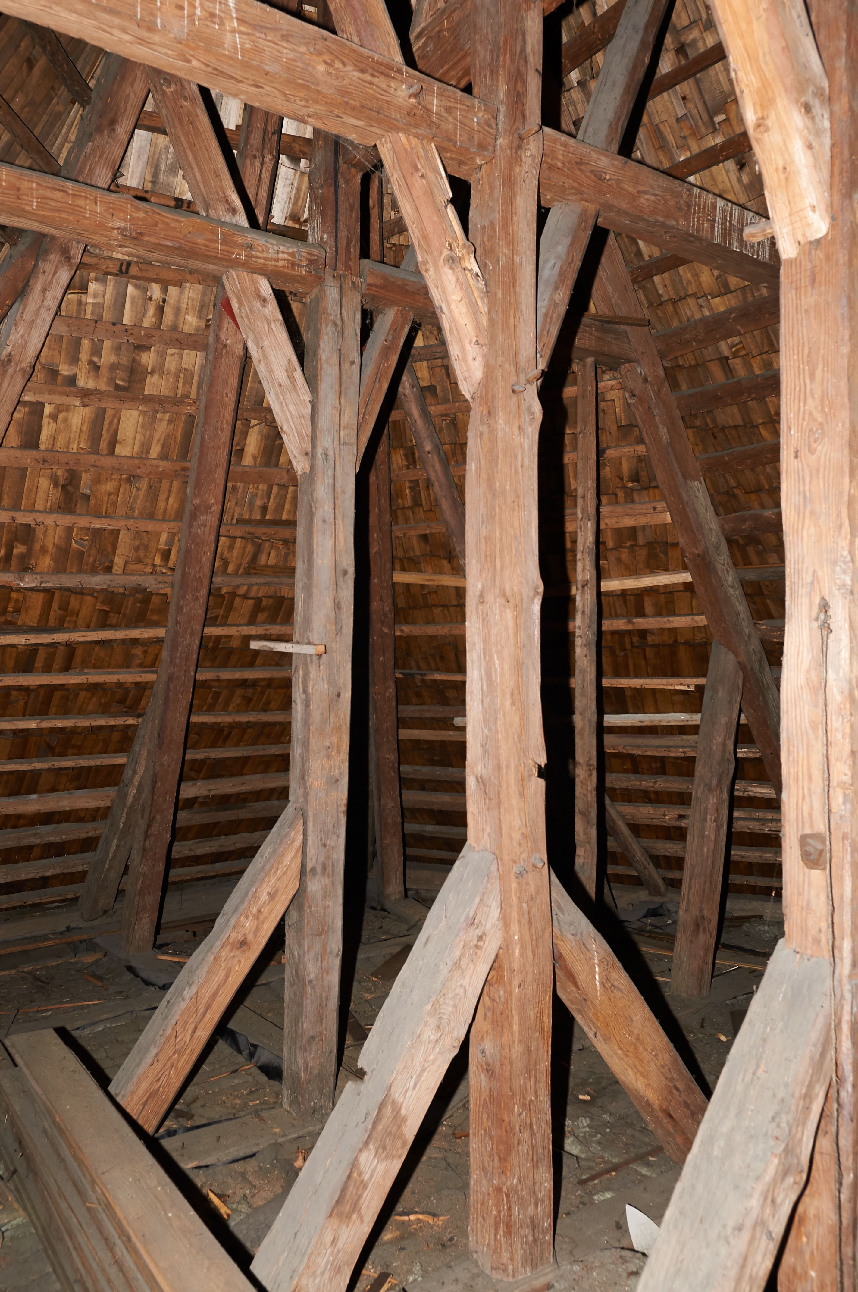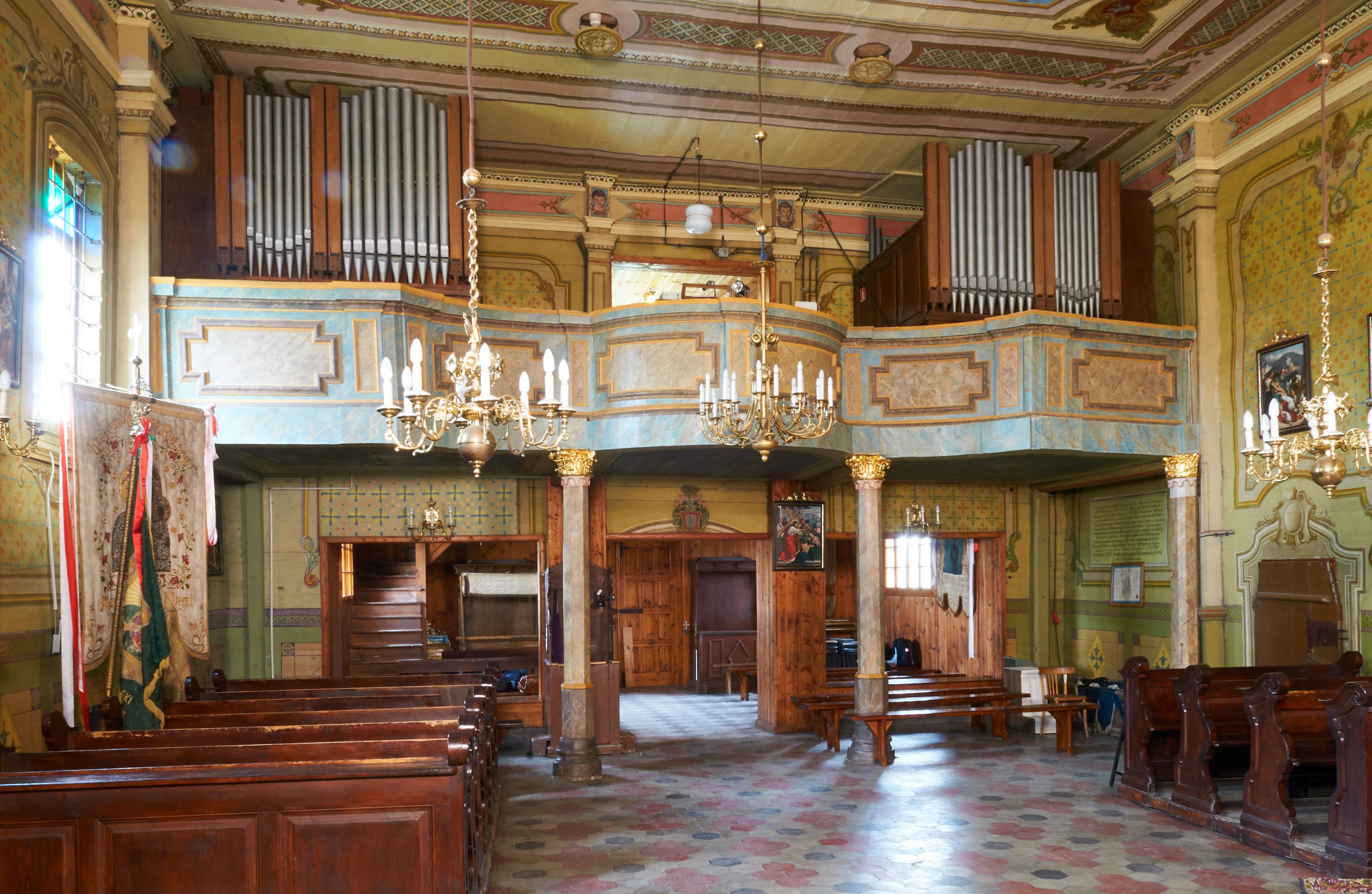 In 1742, work began on relocating the temple again - to another place in Grabia, a meadow called Gruczyn, where it is still located today. The work was initiated by the then parish priest Jakub Cichoński and Father Wawrzyniec Rempalski, Dean of Proszowice. In the above-mentioned year of relocation, masses were still held in the former church. This proves that the temple gained almost a completely new form and new furnishings, and only a part of the building material from the old church was used for its construction. The new church was consecrated on 14 September 1749 by Bishop Michał Kunicki. The created building obtained mainly new architectural and sculptural furnishings. In the visitation acts of 1747, five altars were mentioned, namely the main altar of Our Lady and the side altars of St. Joseph, St. John Cantius (on the right) and St. Anne and the St Sa.lvator (on the left). In the temple, there also was a pulpit and an organ loft. The church was repainted in 1754 (such a date was once painted on the rainbow). In 1835-1836, the temple was repaired. The beams were then pulled up (the base on which the wall rests) and walls were fastened with oak clamps. Three mensas were set in the altars, namely the high altar, St. Joseph's altar and the altar of Transfiguration of Jesus. This proves that there were only three altars in the church at that time, which were the only altars with the invocations indicated. In 1844, the church was repainted again. In 1879, the church floor was repaired: "hard stone floor brought from Rzegocina was used in the nave from the rood screen to almost half of the floor, while the rest was laid with old stones", the oak thresholds were thrown out, and, in their place, turned oak bases were installed under all pillars. In 1885, from parishioners' contributions and at his own expense, parish priest A. Konopiński bought four windows for the south side of the building "with colourful ornaments in oak frames." At the turn of 1899 and 1900, a new shingle roof was installed on the church, while the garret and ridge turret were boarded with planks. In 1907, in the days of parish priest Józef Raźny, the condition of the church was described as bad and a thorough renovation started. Rotten stringpieces were replaced with new oak ones, and concrete-reinforced foundation was laid under them. The church was lined with a cement floor and the rest, which was in good condition, was laid in the sacristy. The church was repainted with oil paints on the inside and outside. The polychromes of the interior with the scenes of the Assumption of the Blessed Virgin Mary in the presbytery and the crowning of the Blessed Virgin Mary in the main nave were made by Jan Talaga from Kraków. "The decorative part of the entire church is attributed to Mr. Michał Tarczatowicz from Bochnia." The pillars supporting the walls of the church were boarded with planks in the form of "prism-shaped pilasters" with chapiters. The cost of the renovation was 6400 Crowns, which were collected from voluntary contributions. In 1911, a new floor was laid out in the loft and an additional doorway was created in the sacristy due to fire concerns. The church was seriously damaged during war operations in 1914: "The roof of the bell tower, the roof of the Church, the organ and the loft, the altar of St. Anthony, the Baroque pulpit, the northern wall of the church, flags, banners, the Gothic lamp, the hanging candle holder, all of it was destroyed and all the windows were smashed. After these events, the parish priest applied makeshift fixes to the roof and fitted glass into the windows. In 1916 "through the k.u. k. Society of Heritage Art, I [parish priest Józef Raźny] managed to obtain a subsidy for the restoration of the Church in the amount of 3100 Crowns, for which I covered the larger portion of the church's roof with new shingles, inserted a new northern wall of the church at the former altar of St. Anthony, repaired the truss in the attic, filled holes in other walls with new flat logs, and put a concrete foundation in place of the oaken sill plate that had been crushed by cannonballs on the southern and western side." Subsequently, the pulpit was renovated and the organ loft in the church was renovated the following year. In 1919, a pump organ was bought instead of a pipe organ. In 1929, a new altar of Our Lady of the Rosary with her painting was built in place of the destroyed altar of St. Anthony. In 1937, thanks to the parishioners' contributions, half of the roof was covered with shingles, and the works on the second half of the roof were completed in 1941. In 1947, a fence was built around the church. In 1956, the church was electrified and equipped with new lamps. A year later, a renovation of the church financed by the parishioners' contributions commenced, namely the roof of the sacristy and the northern side of the church were covered with shingles. Carpenters from Niedźwiedź were brought in for that purpose. The decayed ridge turret was replaced with a new one, covered with sheet metal. The next stage of the works in 1958 was the laying of new foundations for the church and covering of the underpinning with shingles, which was conducted by highlanders from Niedźwiedź. Jan Kalisz from Brzegi painted the church from the outside. Renovation of the polychrome and the entire interior was carried out a year later by Józef Nawałka from Kraków together with five assistants. During the ministry of the parish priest Józef Masłowski, namely in the years 1979-1986, the church was extended by a porch on the western side, the entire church was boarded with new planks on the outside, and all the doors were replaced. In April 1989, Różecki from Kętek painted the Garden of Gethsemane on the eastern, outer wall of the chancel. A year later, with the help of the parishioners, the church, its external facades and the roof were secured with varnish. In 1997, Dorota Wąchalska performed polychrome co