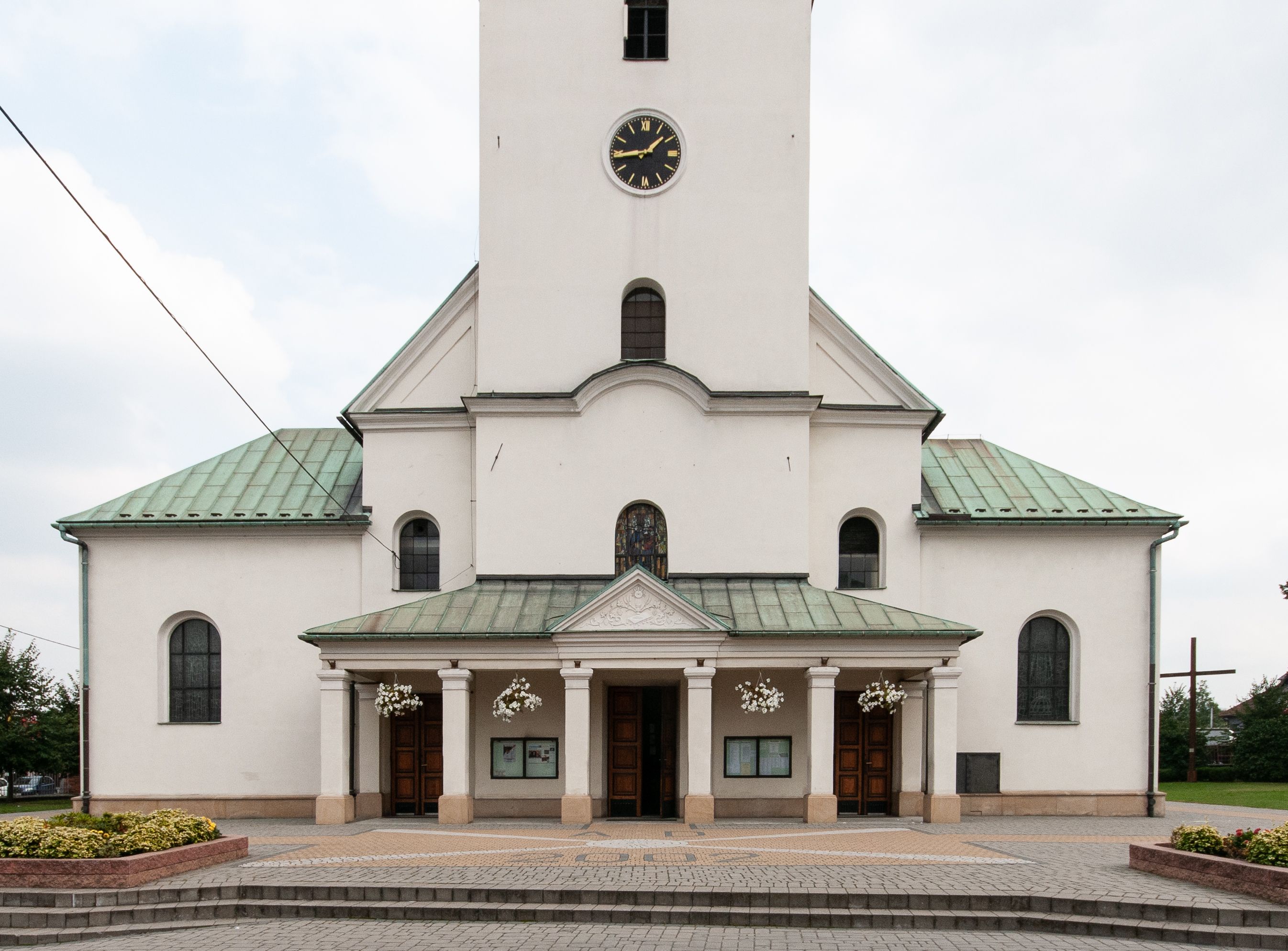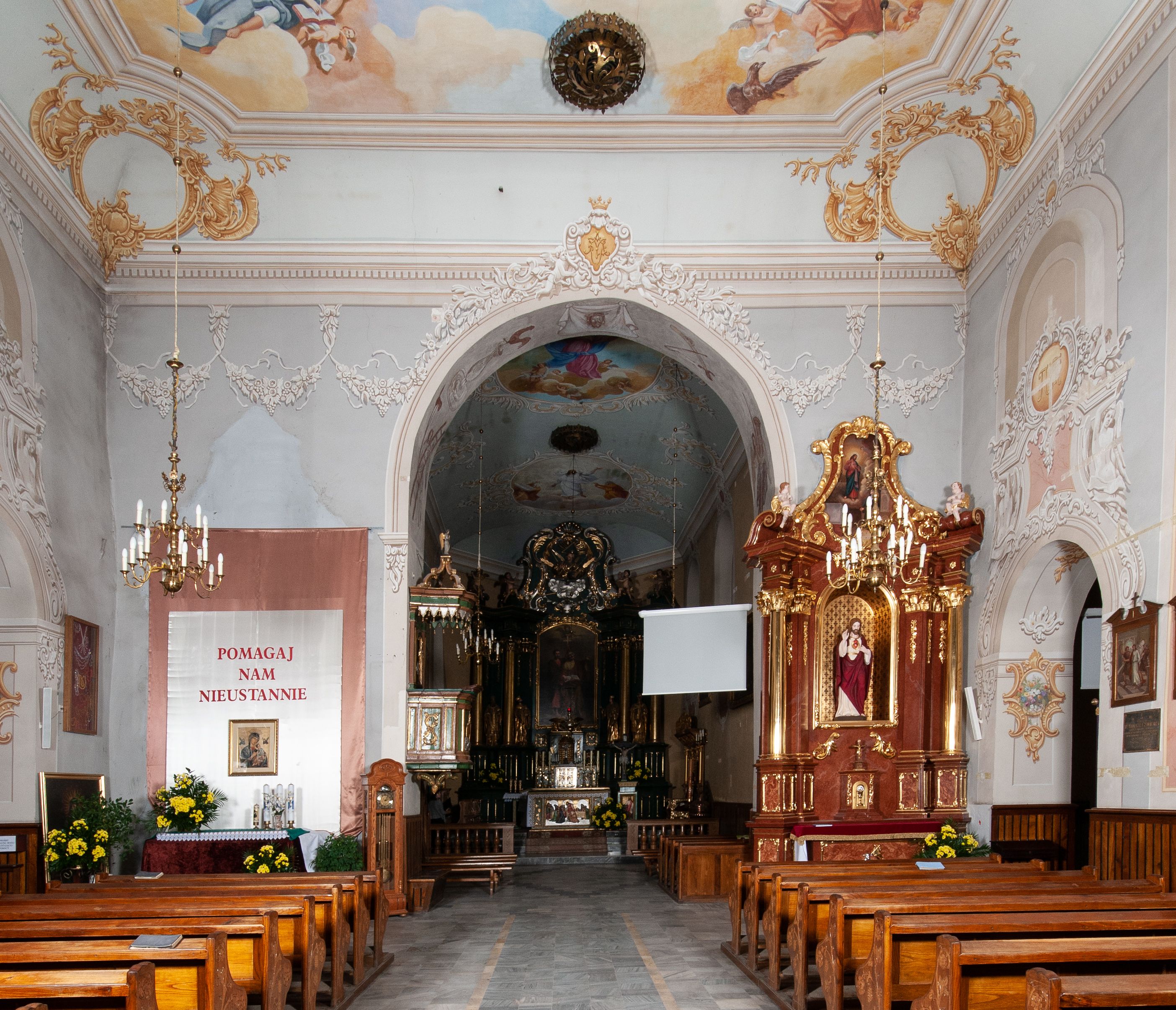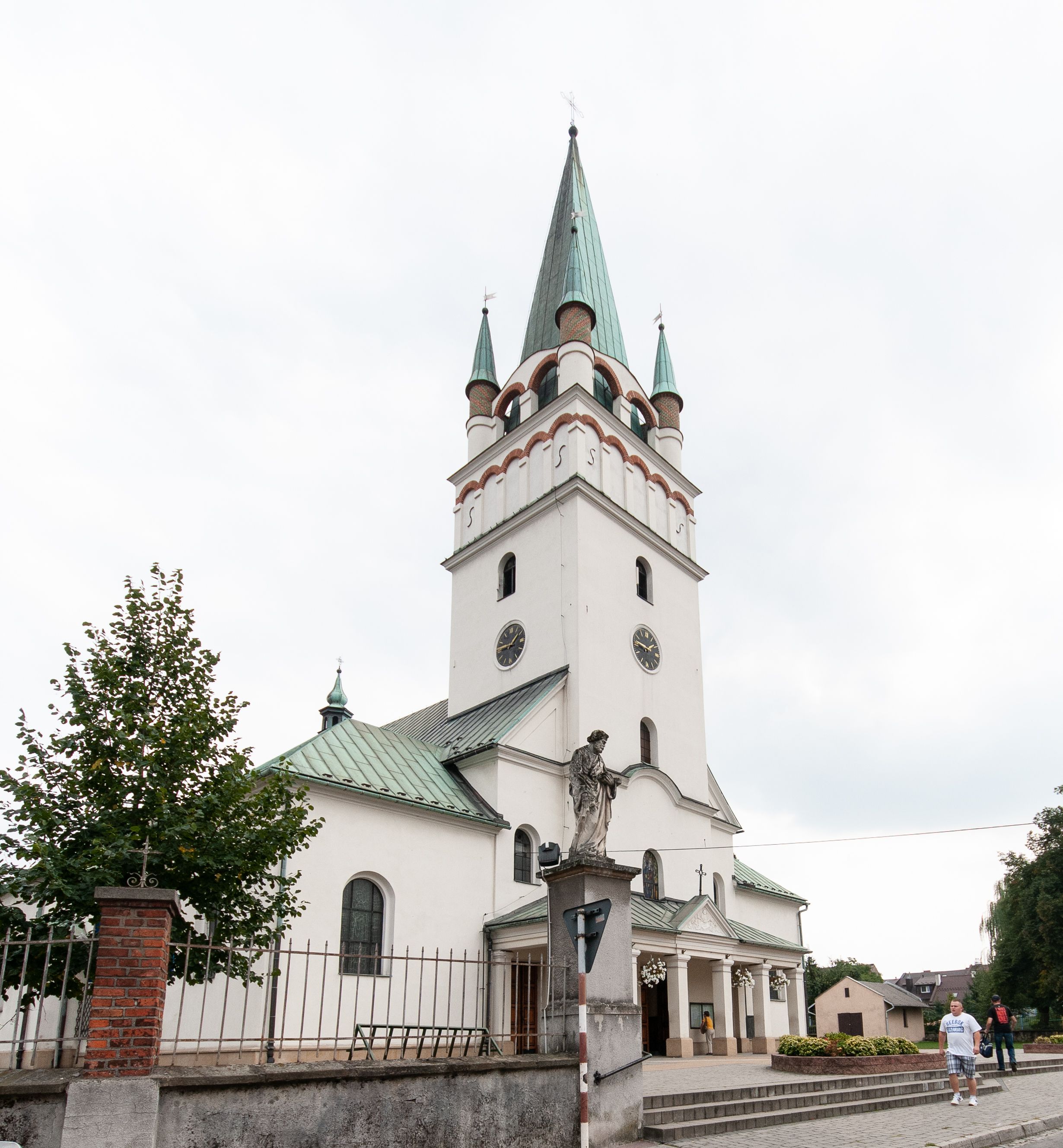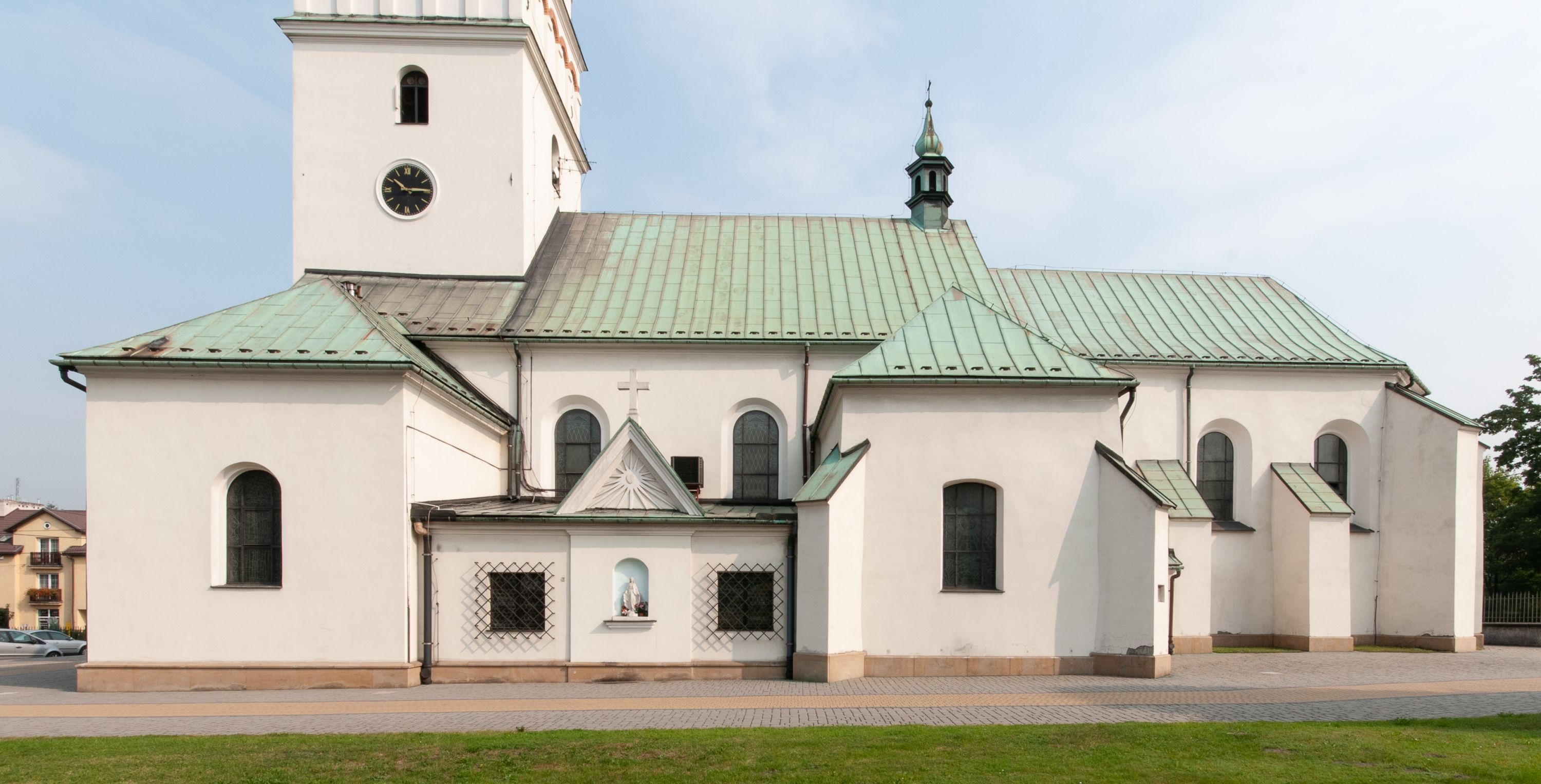 Skawina was established in 1364 by King Casimir the Great. The first parish church was built here in the second half of the 14th century – it was given the invocation of the Holy Spirit, Mary and The Holy Apostles Simon and Jude. Between 1470 and 1480 Jan Długosz described it as built of stone in "Liber beneficiorum dioecesis Cracoviensis". In the middle of the 17th century it was a single-nave building with a chancel in the east and a tower in the west. In 1655 Jan Lipnicus Kuderski funded the side chapel of the Divine Mercy, which was built on the north side of the nave. - In 1662 the church was furnished with seven altars. It was rebuilt twice: the first time in 1720 after the fire of 1704 and in 1728 it was consecrated, the second time in 1826 after the fire of 1815 from the funds of duchess Ludwika Szeptycka. It was then that the church was left with a shortened invocation of Simon and Jude the Apostles. Around 1902 the church tower was elevated according to Władysław Ekielski's project, and in the years 1937-1938, under the direction of the builder Maciej Kurlit, side naves were added and opened with arcades to the main nave. In 1923 the altars were renovated and four additional windows were made. In the 20th century, a portico and a chapel were added to the tower. In the years 1968-1969 Maciej Makarewicz made a polychrome of the church interior, and in the years 1978-1980 the temple was renovated – the roof structure, the roofing, stairs on the tower, etc. were rebuilt. In 1988 the interior was covered with the polychrome designed by J(?) Giebułtowski. In 2012, conservation works involved the high altar and two side altars, as well as painting a new polychrome in the nave and the chancel.