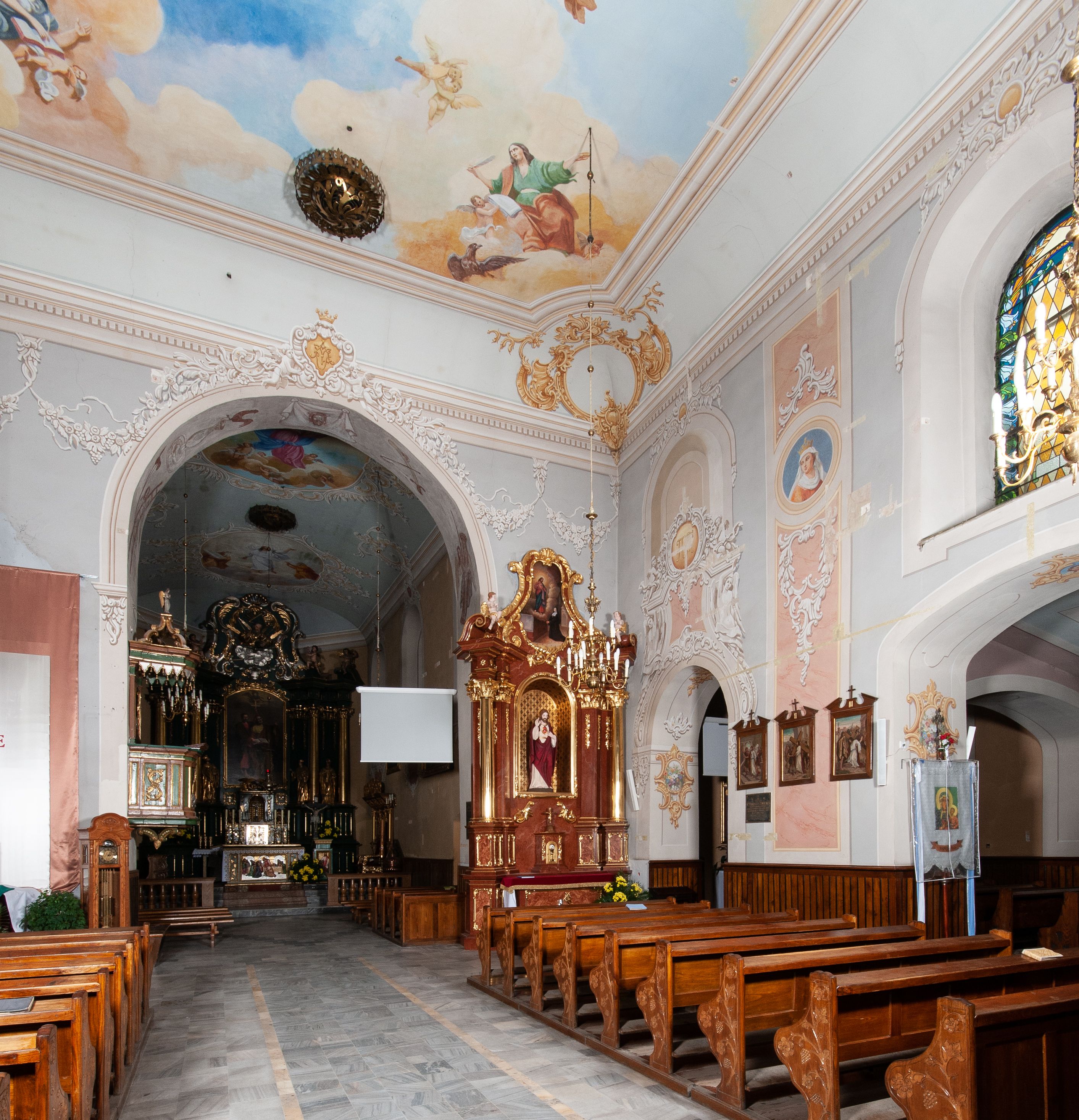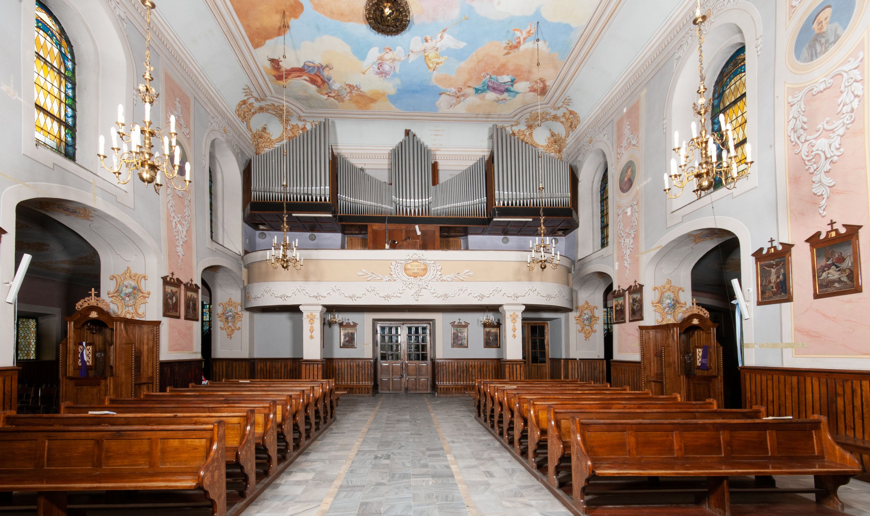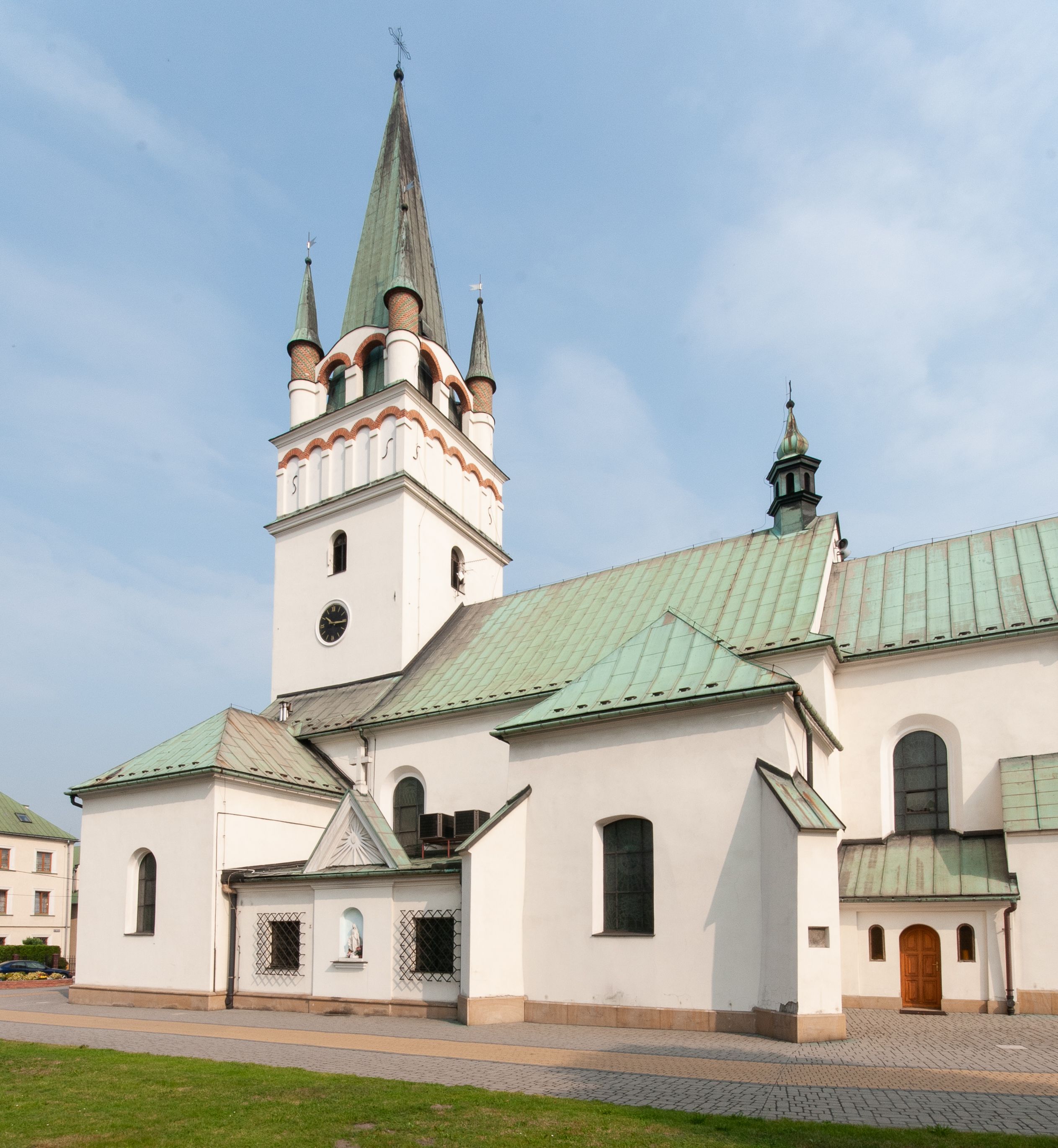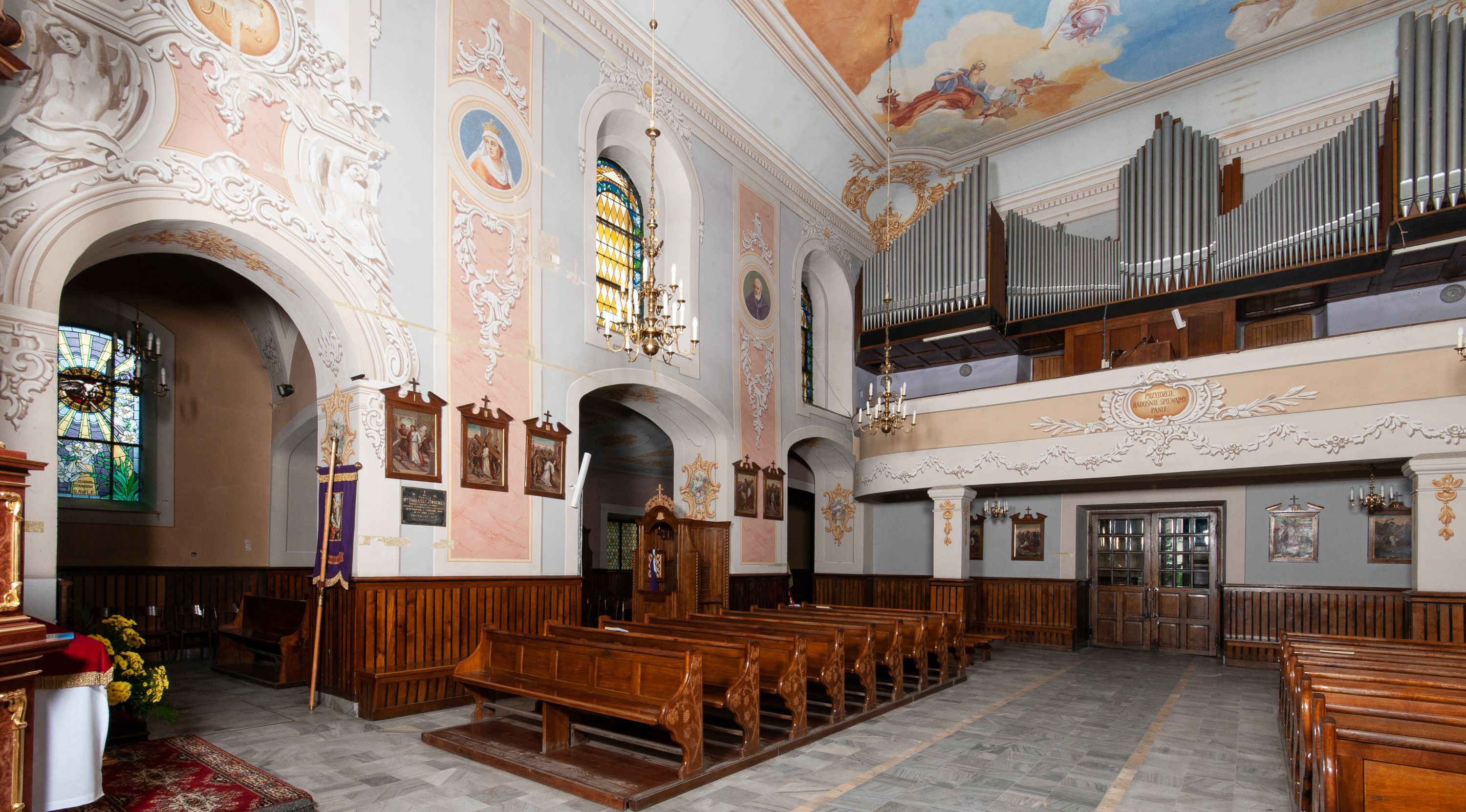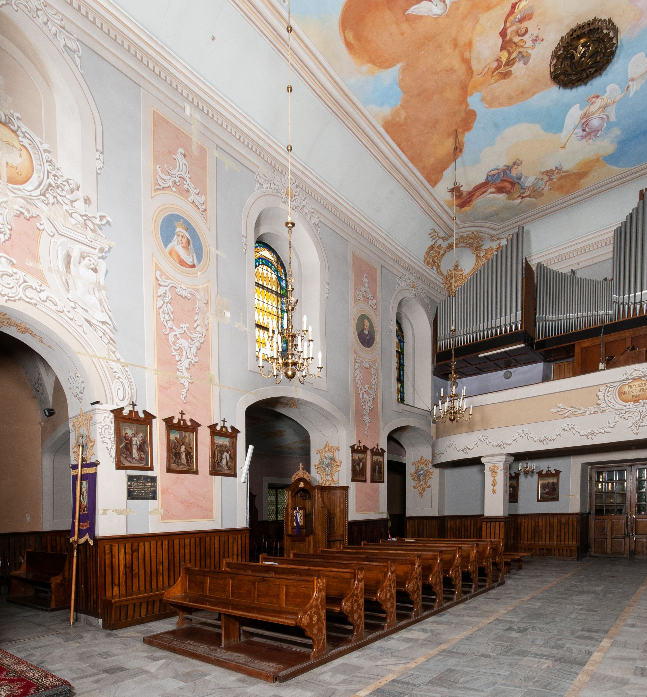 Skawina was established in 1364 by King Casimir the Great. The first parish church was built here in the second half of the 14th century – it was given the invocation of the Holy Spirit, Mary and The Holy Apostles Simon and Jude. Between 1470 and 1480 Jan Długosz described it as built of stone in "Liber beneficiorum dioecesis Cracoviensis". In the middle of the 17th century it was a single-nave building with a chancel in the east and a tower in the west. In 1655 Jan Lipnicus Kuderski funded the side chapel of the Divine Mercy, which was built on the north side of the nave. - In 1662 the church was furnished with seven altars. It was rebuilt twice: the first time in 1720 after the fire of 1704 and in 1728 it was consecrated, the second time in 1826 after the fire of 1815 from the funds of duchess Ludwika Szeptycka. It was then that the church was left with a shortened invocation of Simon and Jude the Apostles. Around 1902 the church tower was elevated according to Władysław Ekielski's project, and in the years 1937-1938, under the direction of the builder Maciej Kurlit, side naves were added and opened with arcades to the main nave. In 1923 the altars were renovated and four additional windows were made. In the 20th century, a portico and a chapel were added to the tower. In the years 1968-1969 Maciej Makarewicz made a polychrome of the church interior, and in the years 1978-1980 the temple was renovated – the roof structure, the roofing, stairs on the tower, etc. were rebuilt. In 1988 the interior was covered with the polychrome designed by J(?) Giebułtowski. In 2012, conservation works involved the high altar and two side altars, as well as painting a new polychrome in the nave and the chancel.