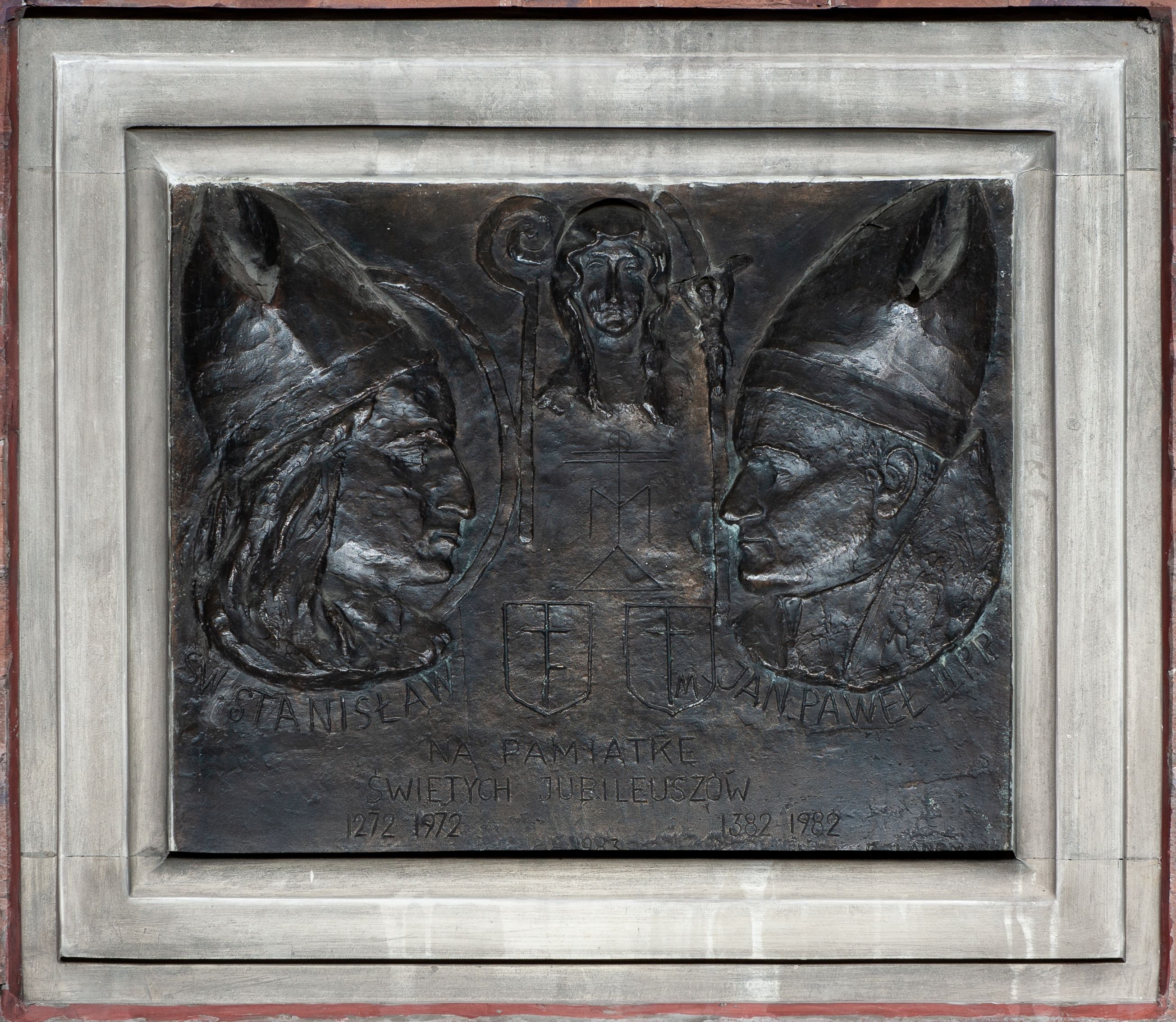 A bronze plaque by artist Bogusław Langman, made in 1983 from the foundation of parish priest Czesław Świniarski, was hung in the ambulatory of a new church. It commemorates such jubilees as: the assumption of the bishopric by St. Stanislaus, founding of the Pauline Monastery in Jasna Góra and bringing the image of Madonna of Częstochowa, the Jubilee Year of Redemption and the fifth anniversary of the election of John Paul II for the office of pope.