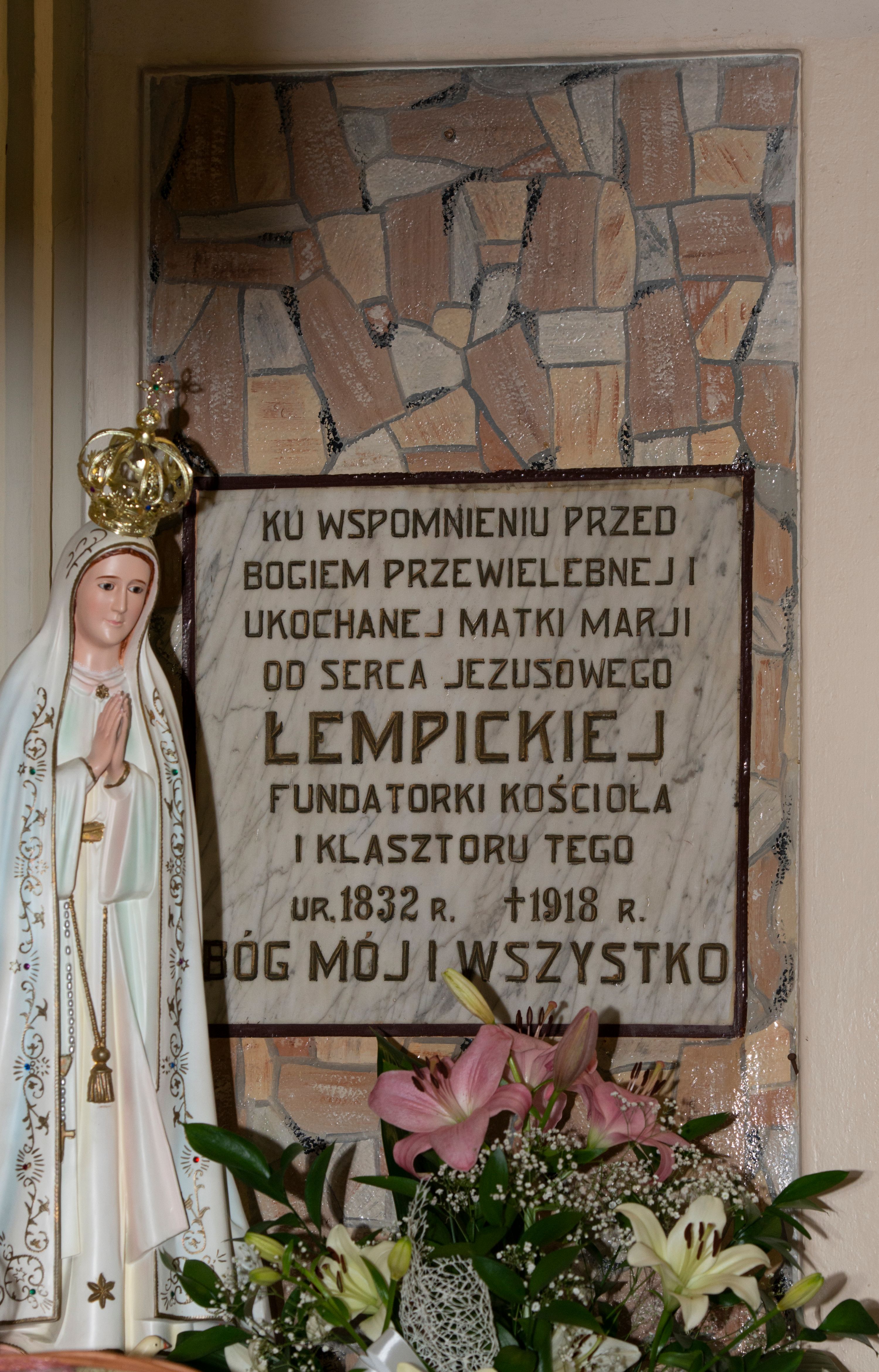 A plaque that was built in the wall of a church dedicated to The HolyTrinity in Kęty in the second half of the 20th century, commemorates sister Mary of the Most Sacred Heart of Jesus - Walentyna Łempicka - the founder and Mother Superior of monastery of the Capuchin Poor Clares, which was transformed into the Capuchin Poor Clares Order of Perpetual Adoration in 1907.