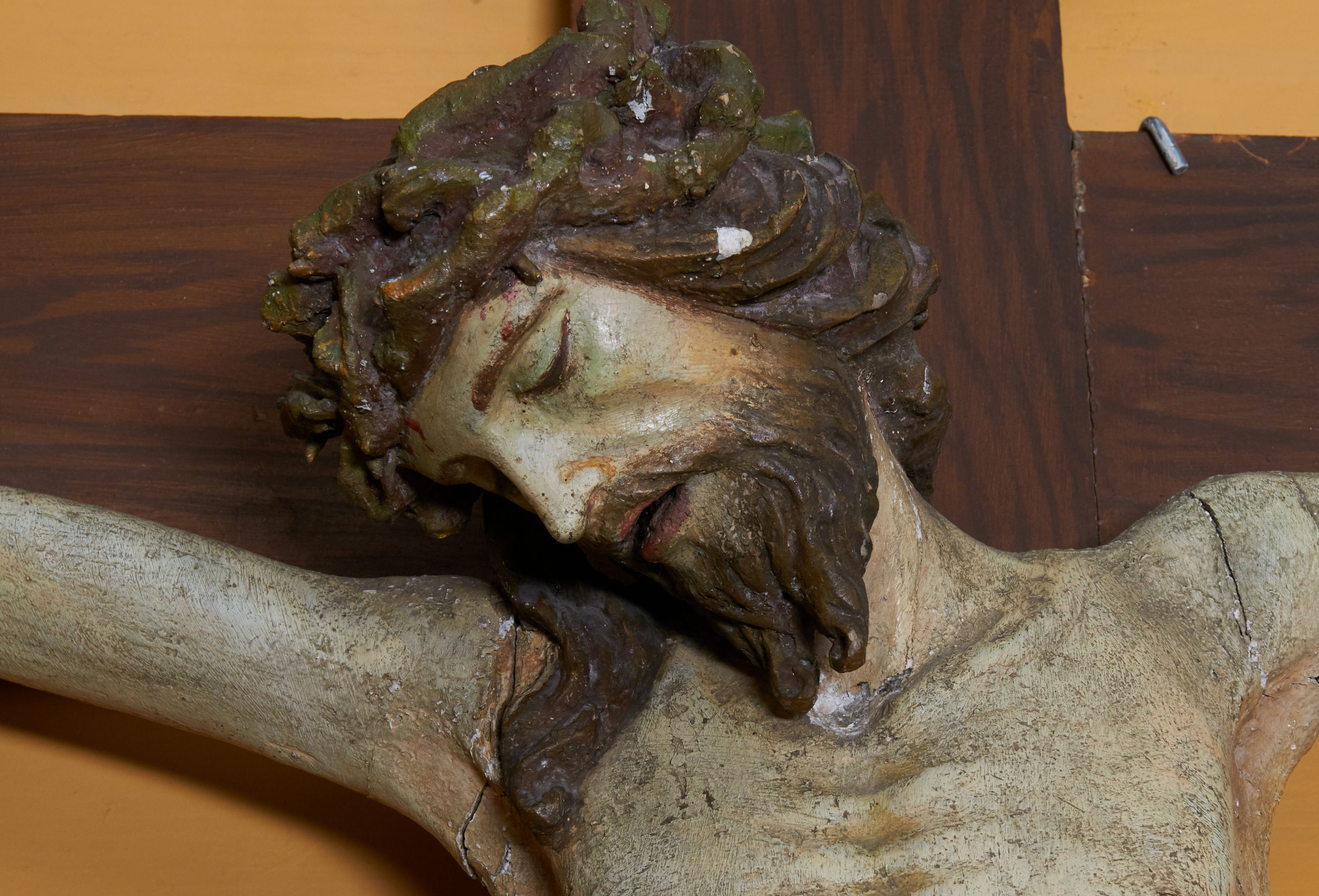 The crucifix was created in the first half of the 18th century. It depicts Christ in Cristo morte type – his death is indicated by closed eyes and half-open mouth. The sculpture has a slightly sigmoidal body and a tightly braided, wide perizoma with one windblown end on the right side, which is the expression of the representation.