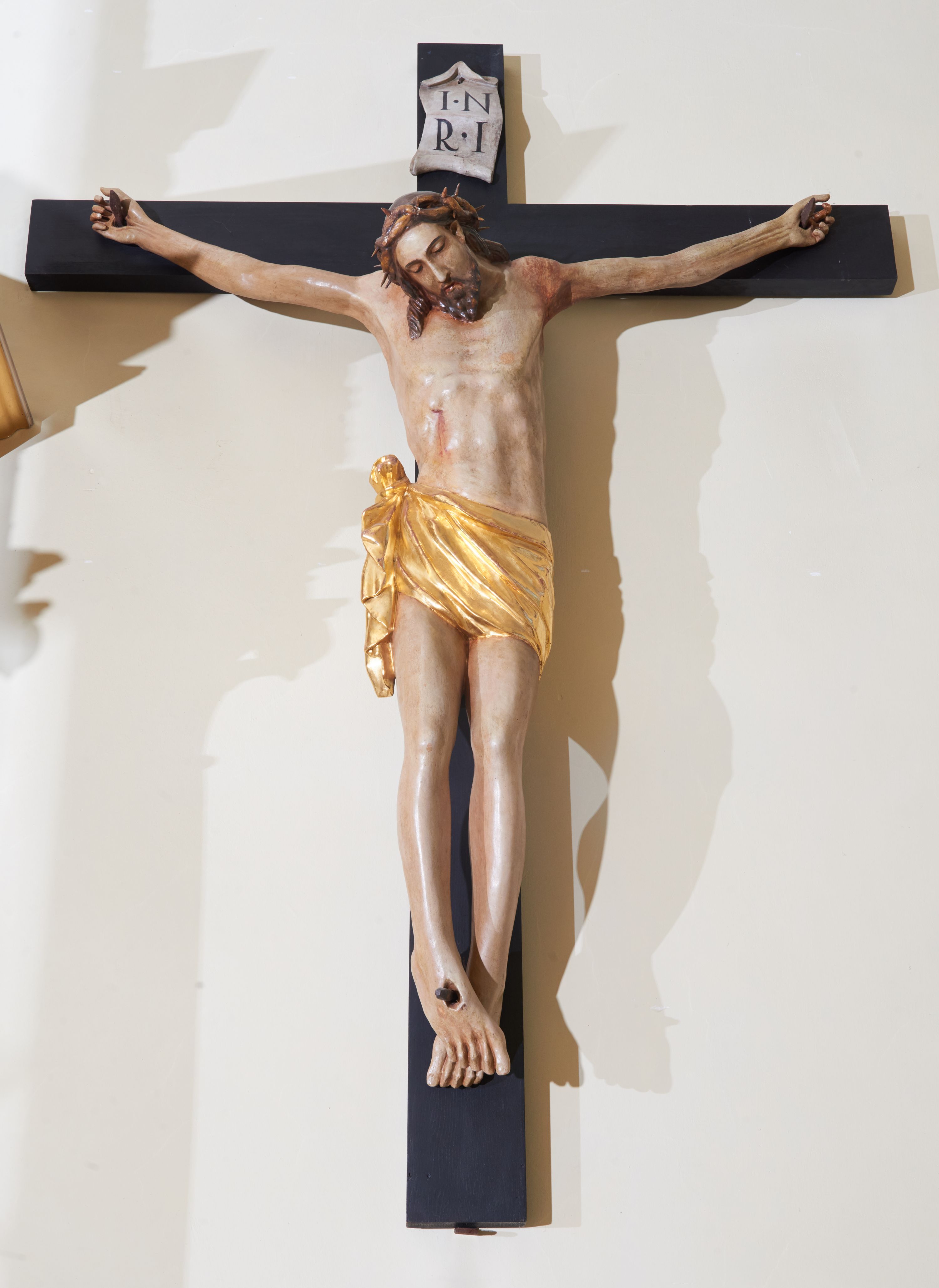 The sculpture of the Christ Crucified was probably created in 1719 from the foundation of parson Jan Franciszek Strzyżański. Perizoma is tied in a knot on the right side, tightly wraps the hips. Christ is portrayed in the type of Cristo Morte, i.e. after he died on the cross.