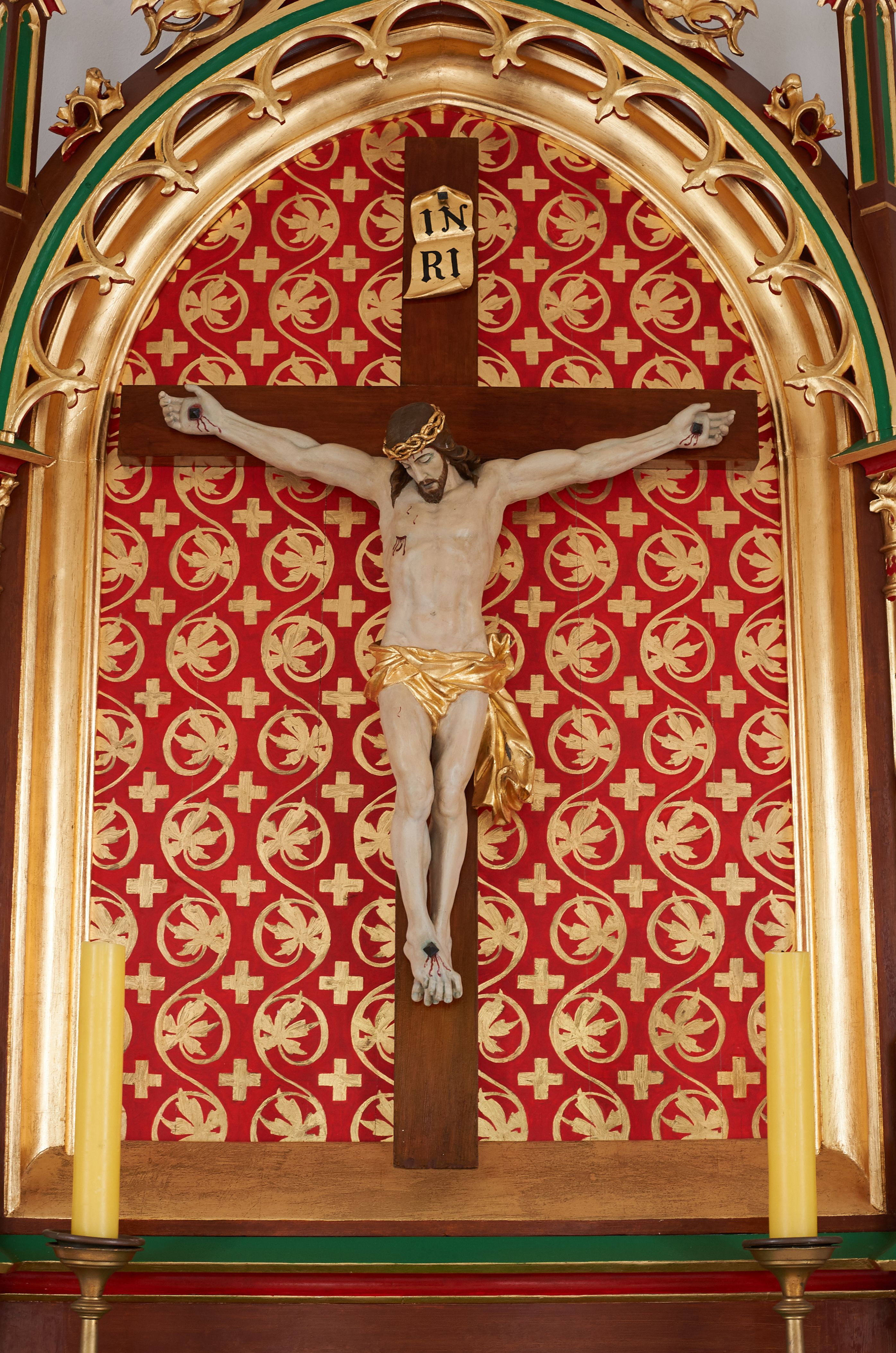 The crucifix and altar in the Neo-Gothic style located in the chapel in a parish cemetery in Łazany, were built in 1893 from the foundation of Ewelina Dunin-Brzezińska, the widow of the village owner - Julian Dunin-Brzeziński. The work was made by the sculptor Kazimierz Wakulski, who had also created a new high altar for a temple in Łazany a year earlier (according to the design of Tadeusz Stryjeński). Wakulski was sculptor working in the second half of the 19th century - apart from making altars, he also renovated monuments. He worked among others in at St. Mary's Basilica in Cracow and at the Wawel Cathedral.