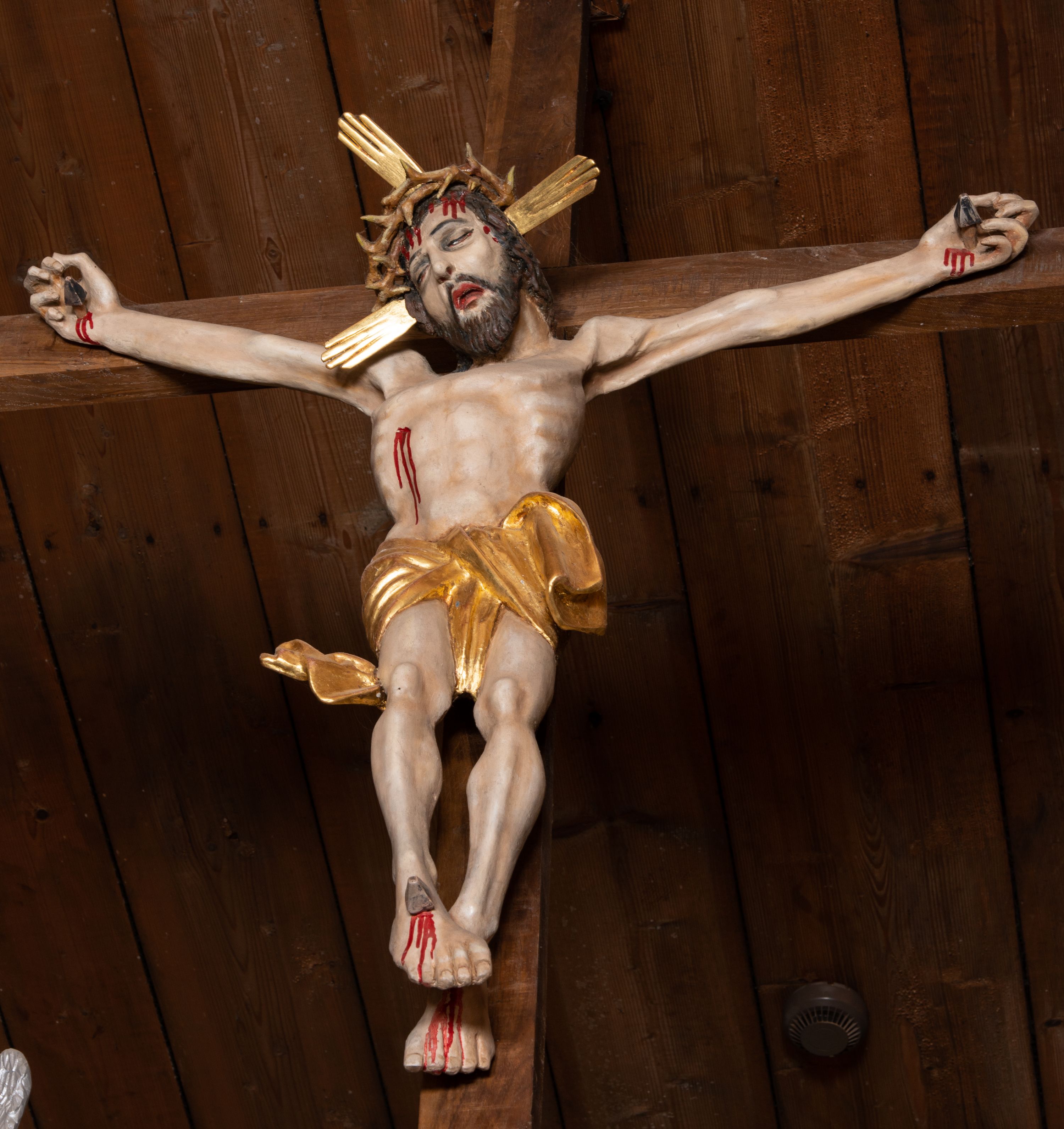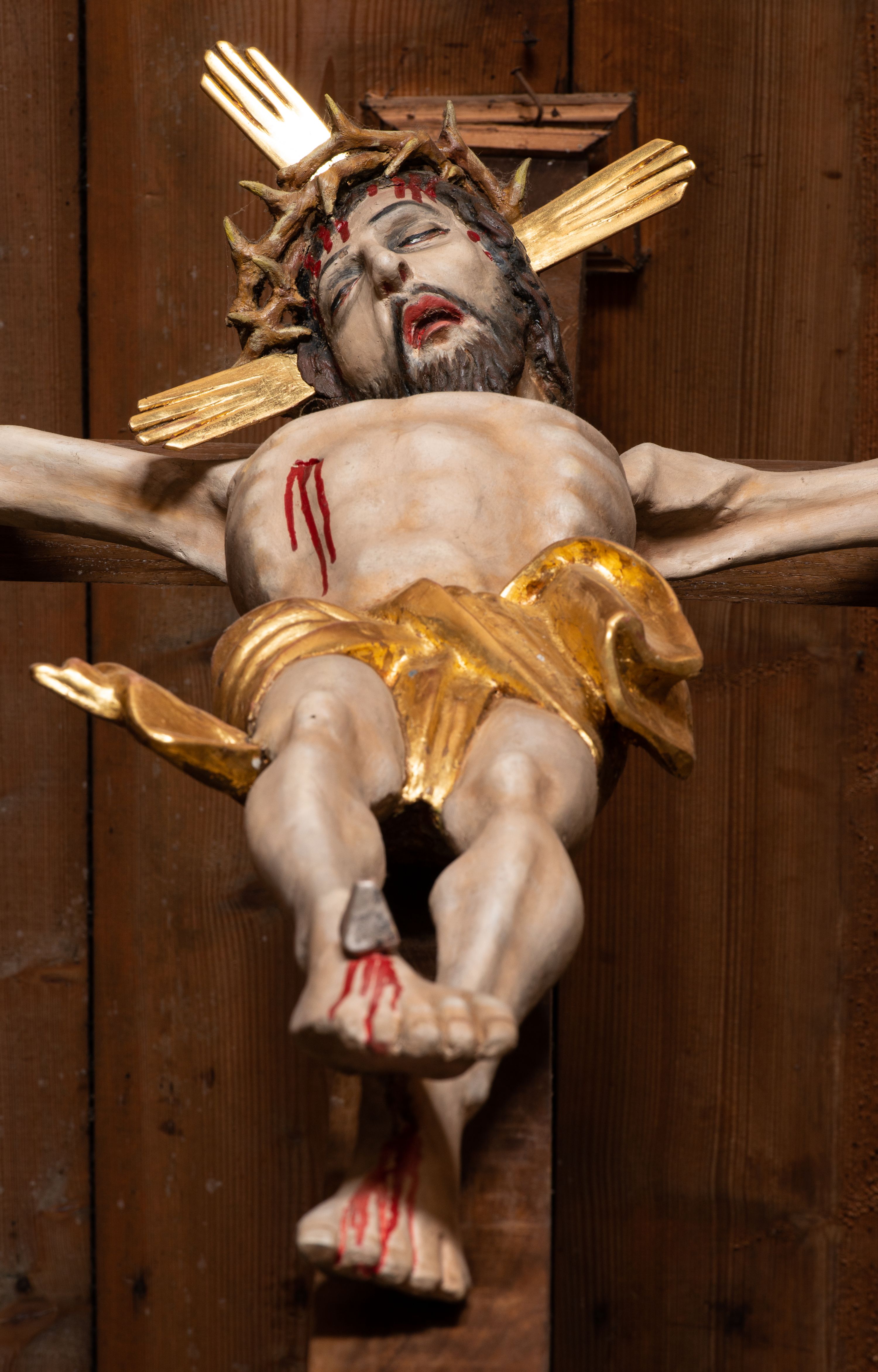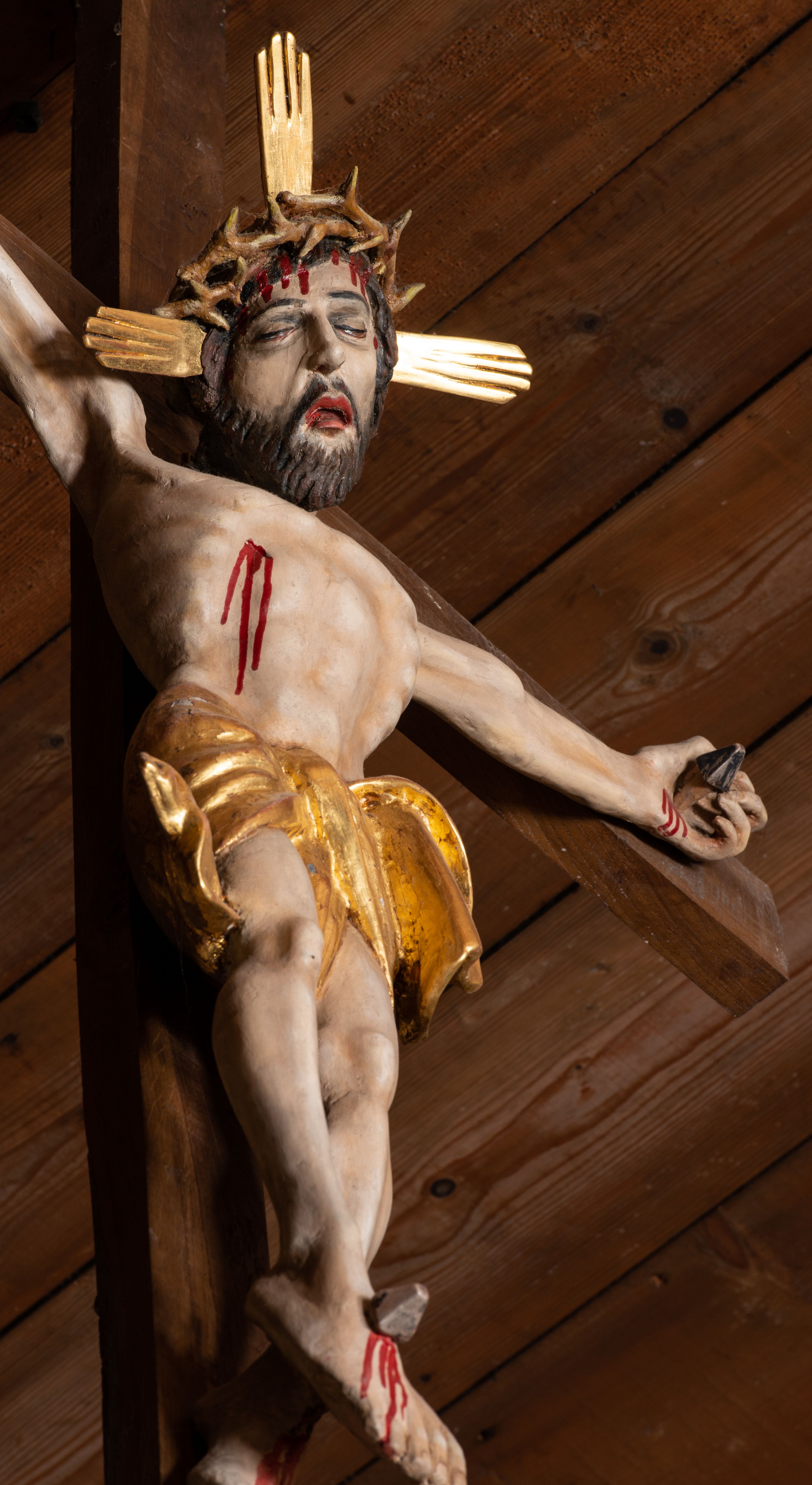 The name "crucifix" comes from the Latin word "crucifixus" and means "nailed to the cross." Presentation of Crucifixion, reduced only to the form of dead Christ on a cross is to make the viewers aware of His loneliness during his suffering. It represents Christ in the Cristo morte type - i.e. as deceased with closed eyes and parted lips. Originally, the crucifix along with the entire temple, built in 1733 was located in Przytkowice. Since the crucifix is older than the church in question, it probably comes from previous temple in Przytkowice. The sculpture was created probably in the early 16th century. The figure is characterised by certain rigidity of silhouette with strongly stressed lines of ribs and breastbone.