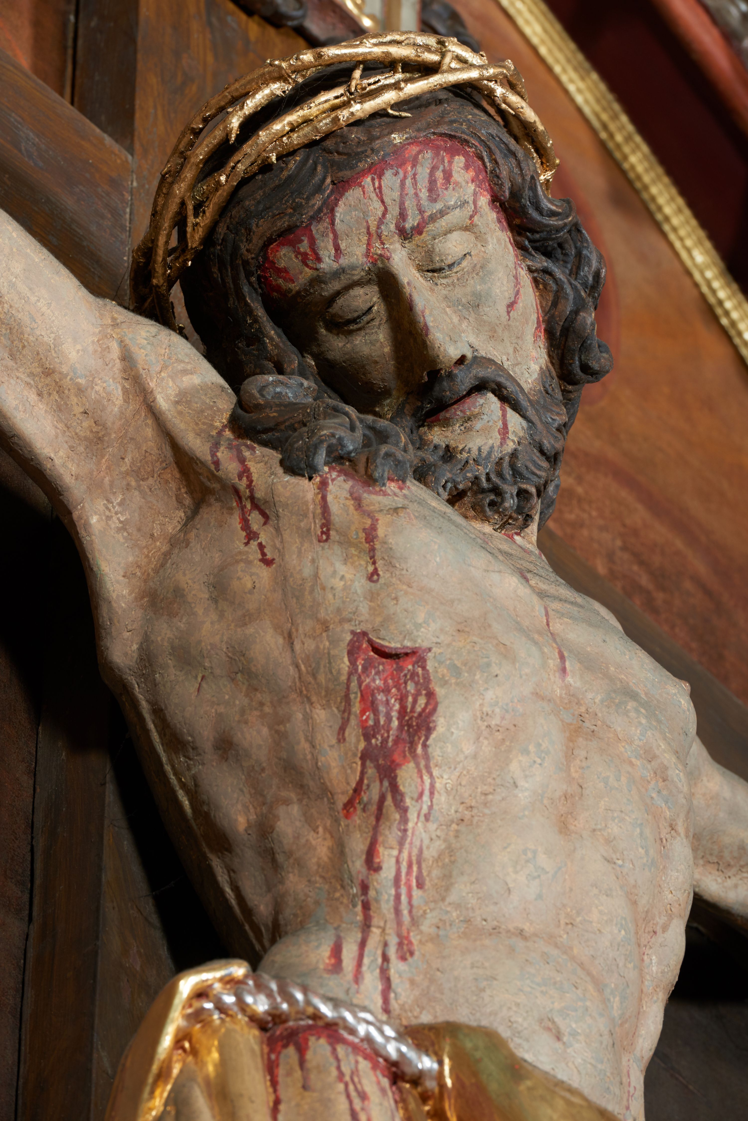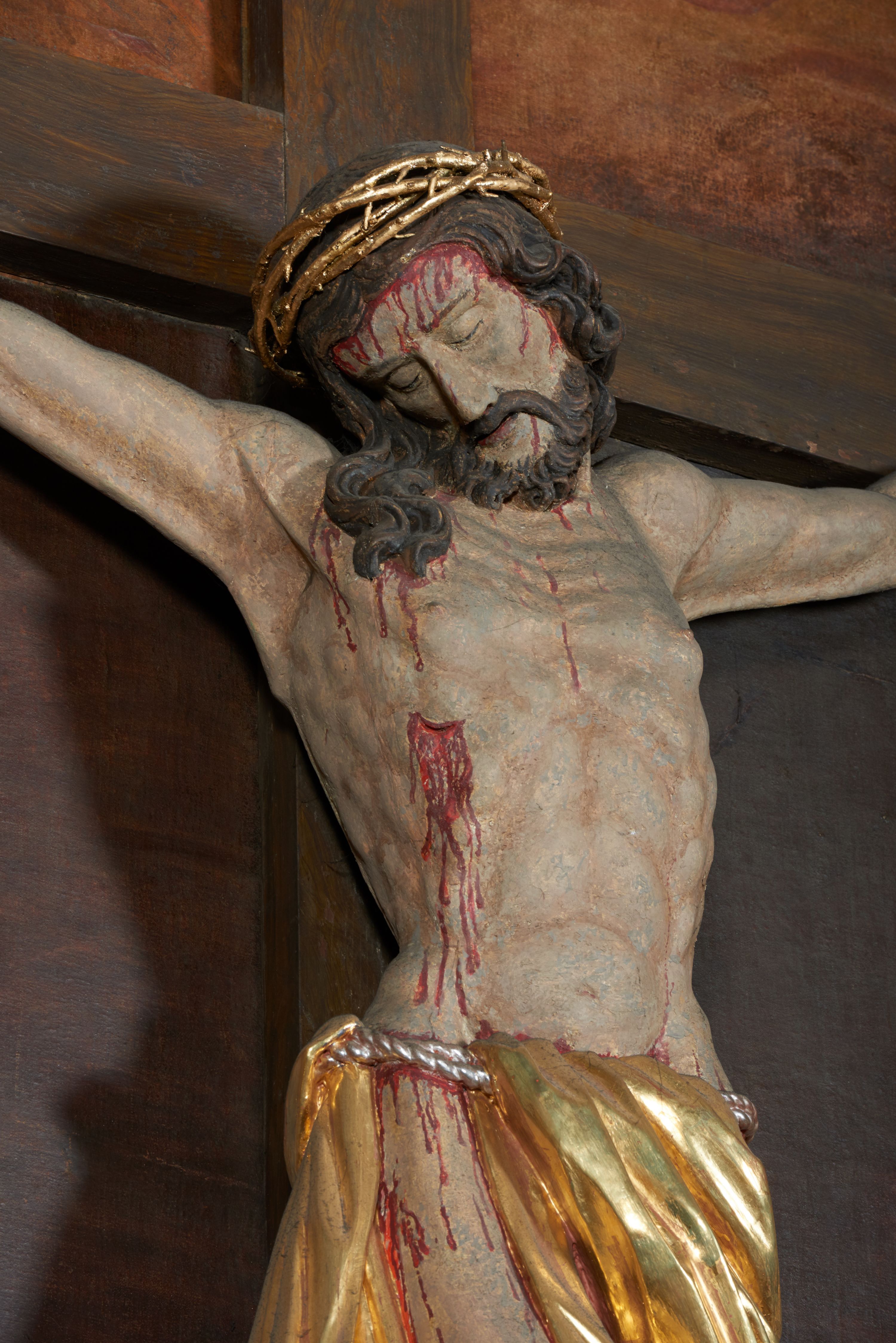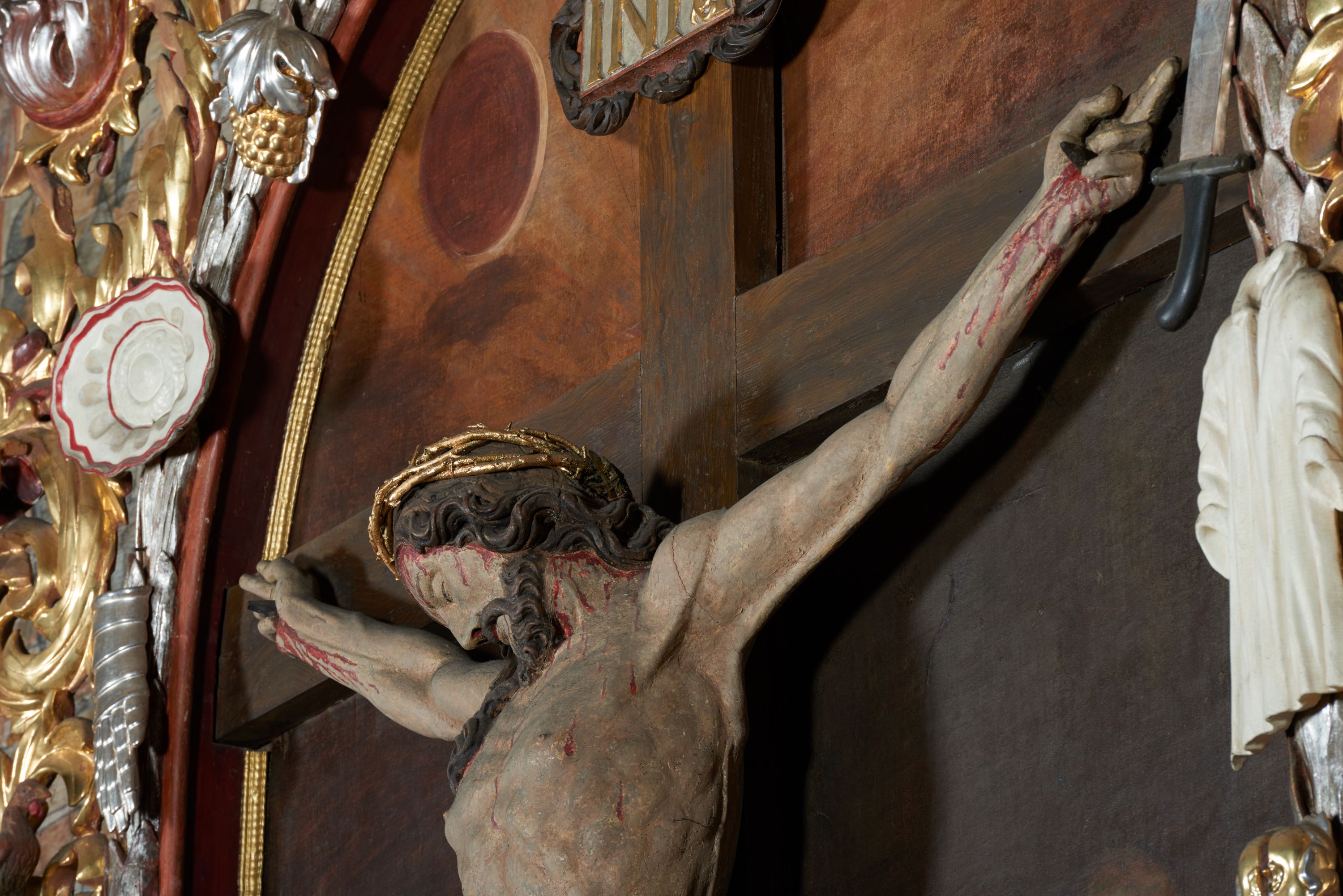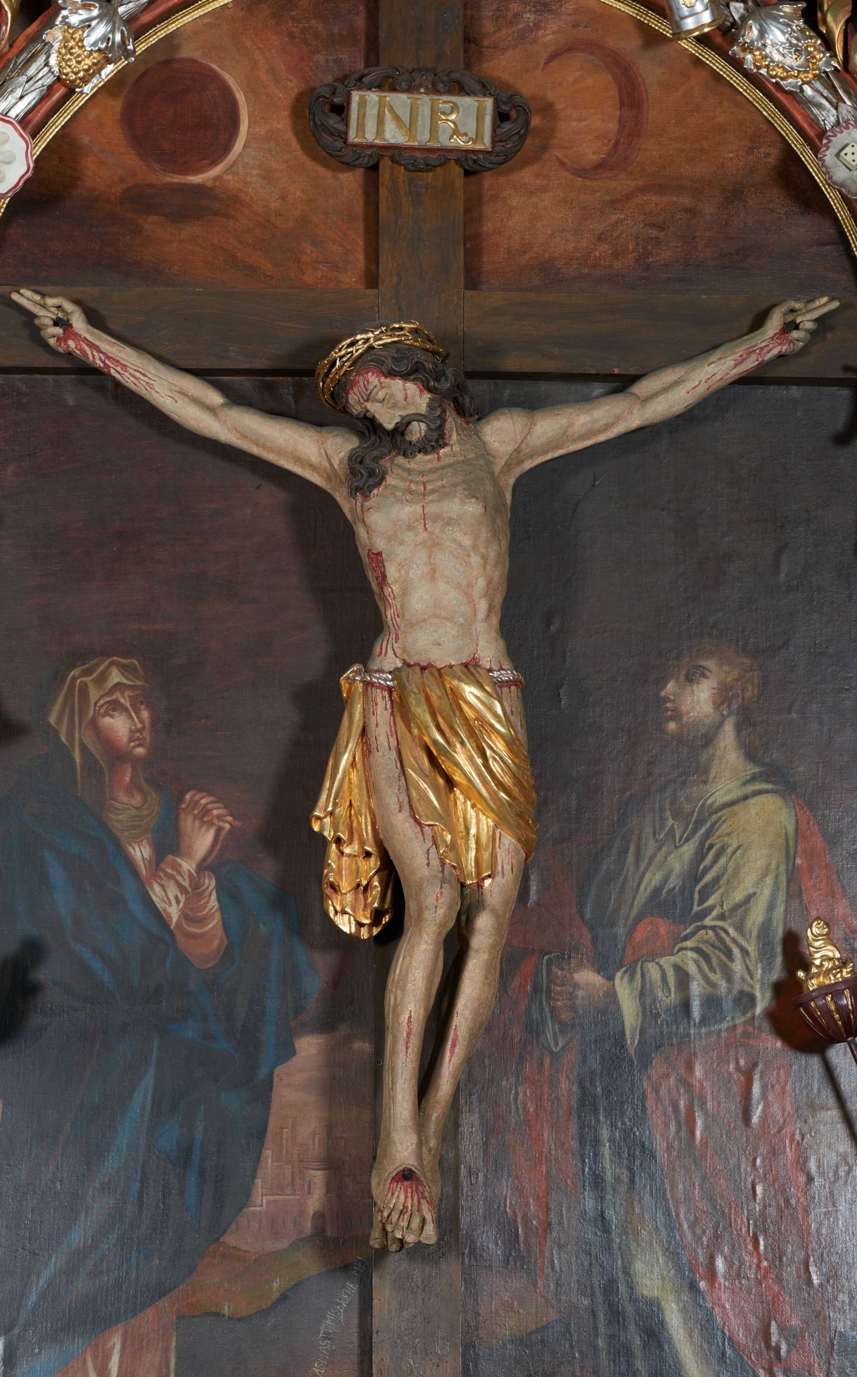 The wooden crucifix dated to 1703, funded by father Andrzej Strzałkowski, the parish priest in Racławice in 1684-1704. The sculpture of unknown attribution characterised by sublime modeling, with clearly underlined anatomy with a perizoma tightened with a rope. A supplementation of the scene is the painting in the background presenting the Group of Crucifixion: Virgin Mary and Saint John the Evangelist.