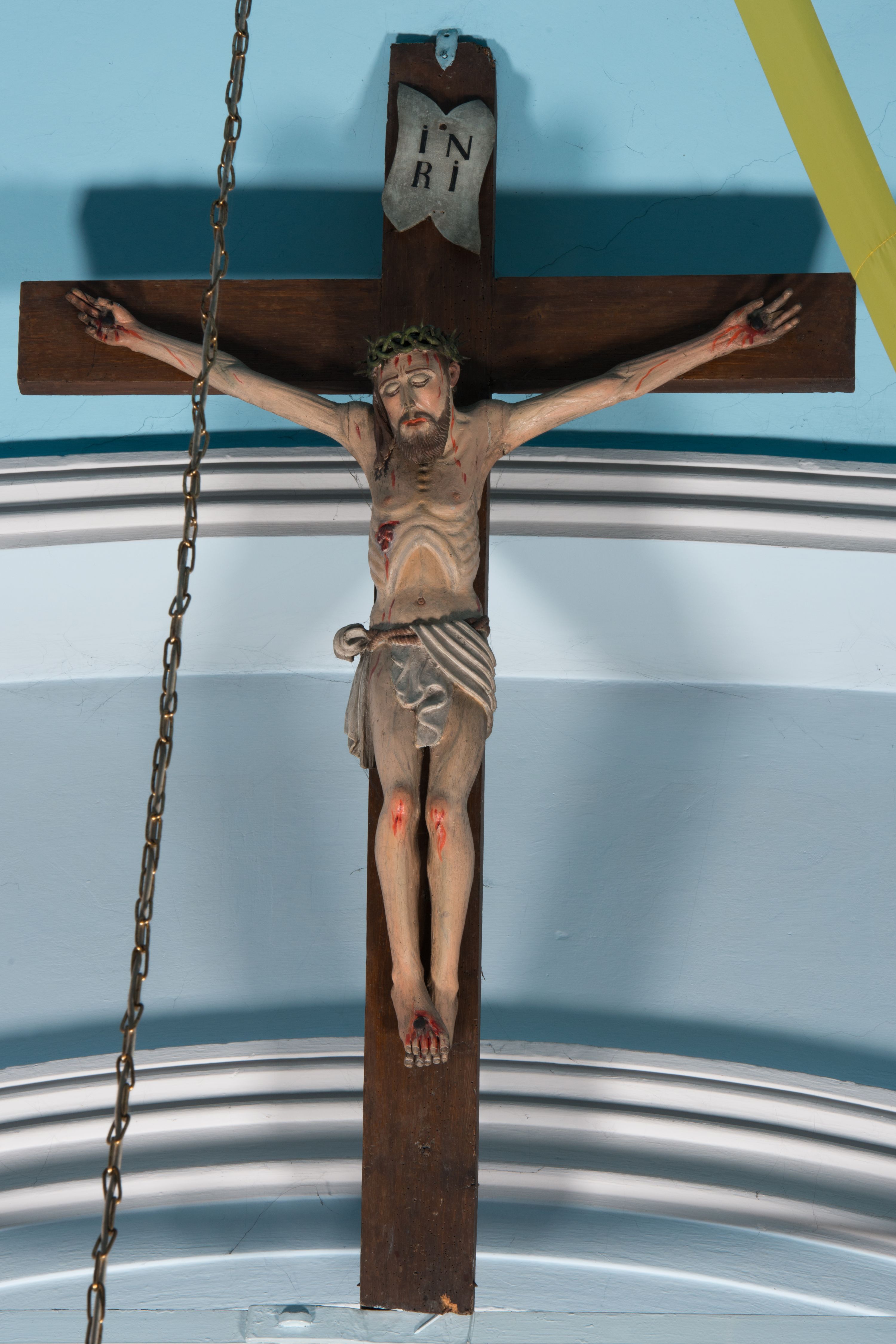 The crucifix was created in the 20th century and has the characteristics of provincial art. Unfortunately, archival sources do not reveal the author of the sculpture. Christ Crucified, in the church in Łękawica, was depicted in the so called type of Cristo morte, which illustartes the deceased on the cross with the inertly lowered head and closed eyes.