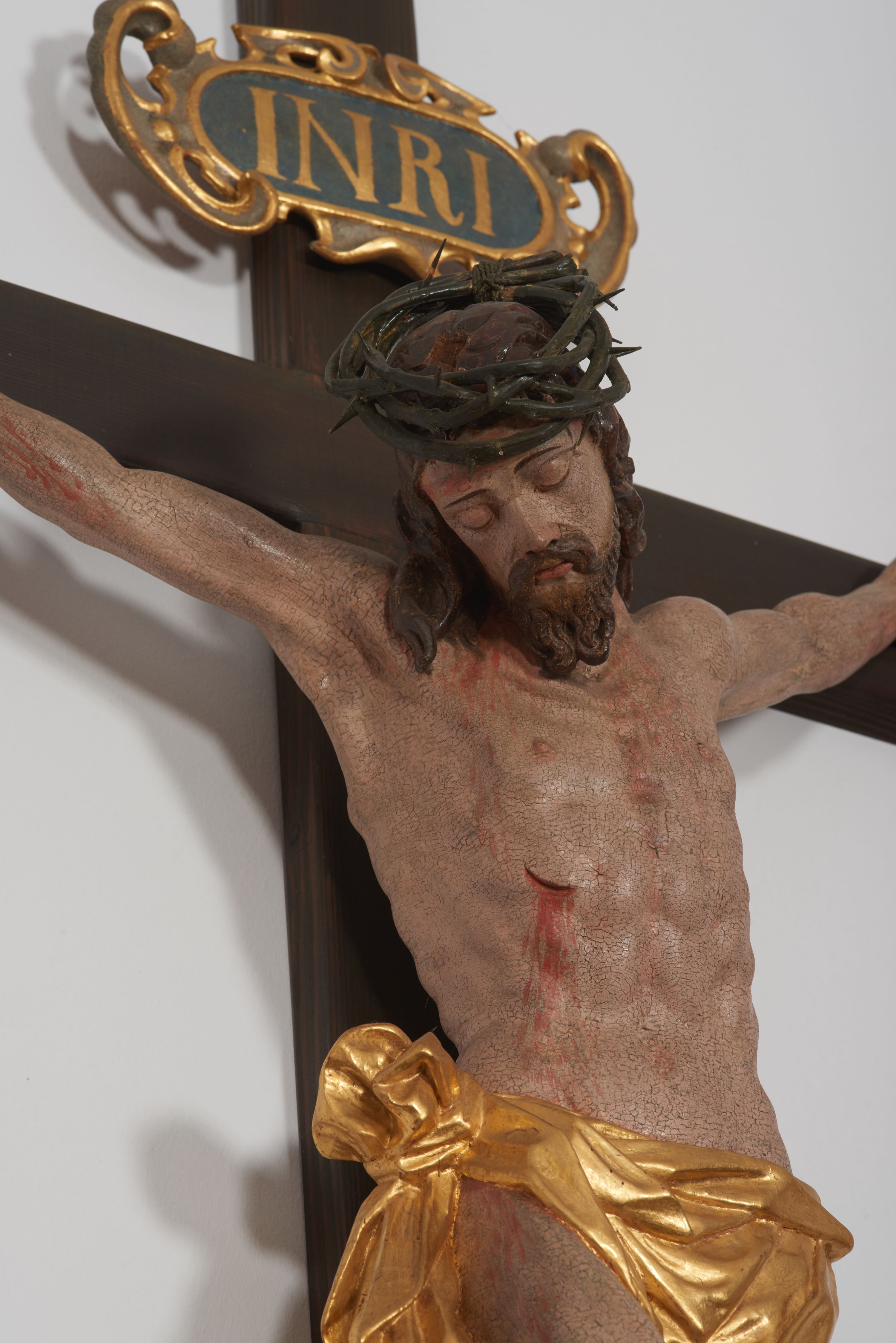 Crucifix with Christ's sculpture in the cristo morto type, with a slightly S-shaped figure. Above Christ's head, there is a cartouche with the inscription "INRI", with an ornament in an auricular style from the middle of the 17th century.