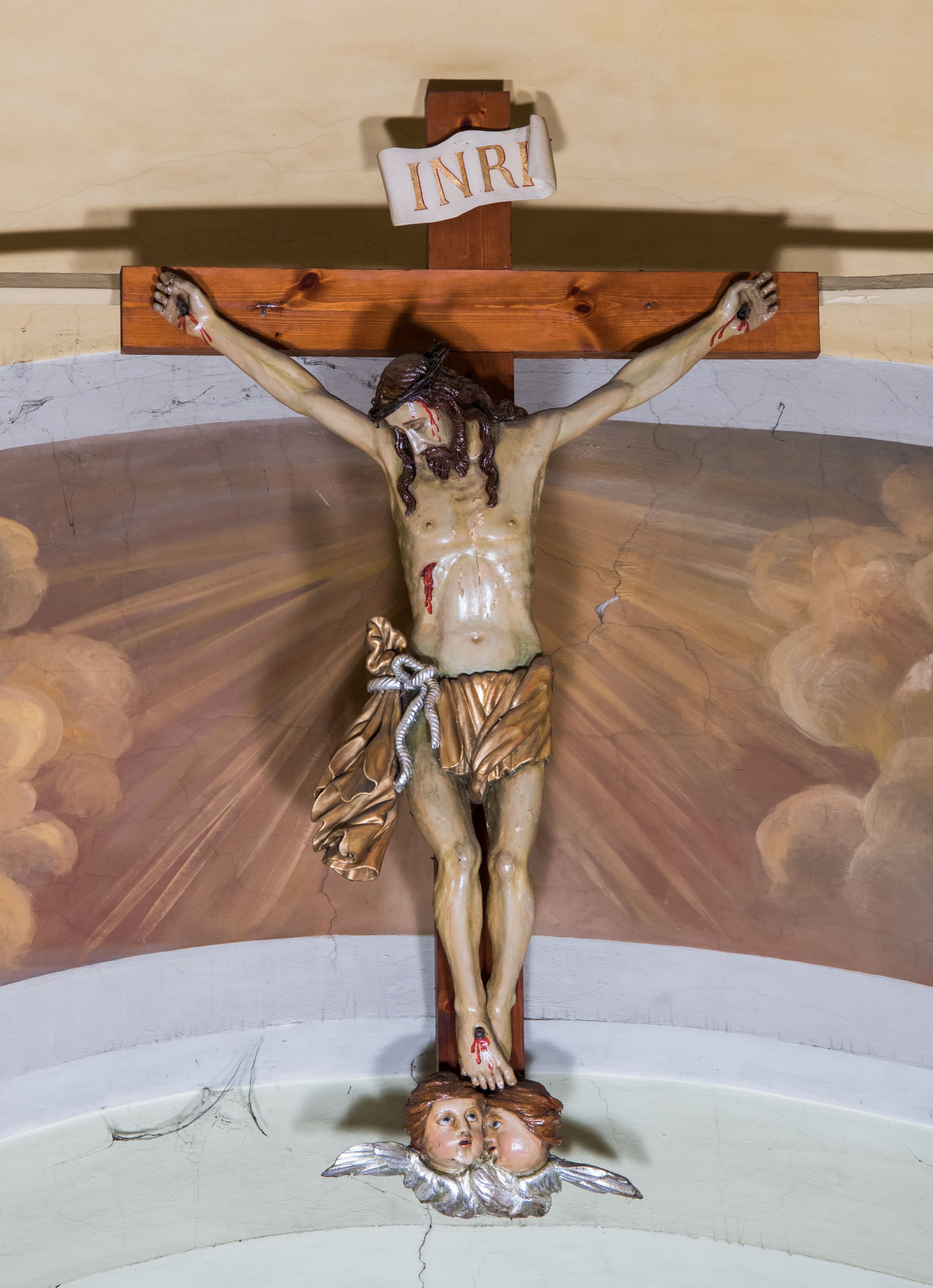 The rood crucifix in St. John Cantius Church in Kęty was most likely made in the first half of the 18th century, similarly to most furnishings of the church. The work presents a set of features that characterise the visual arts of the mature Baroque period, thus constituting an item distinct in terms of its technique from the pair of assistant statues – Virgin Mary and St. John the Evangelist – made in a local, provincial workshop.