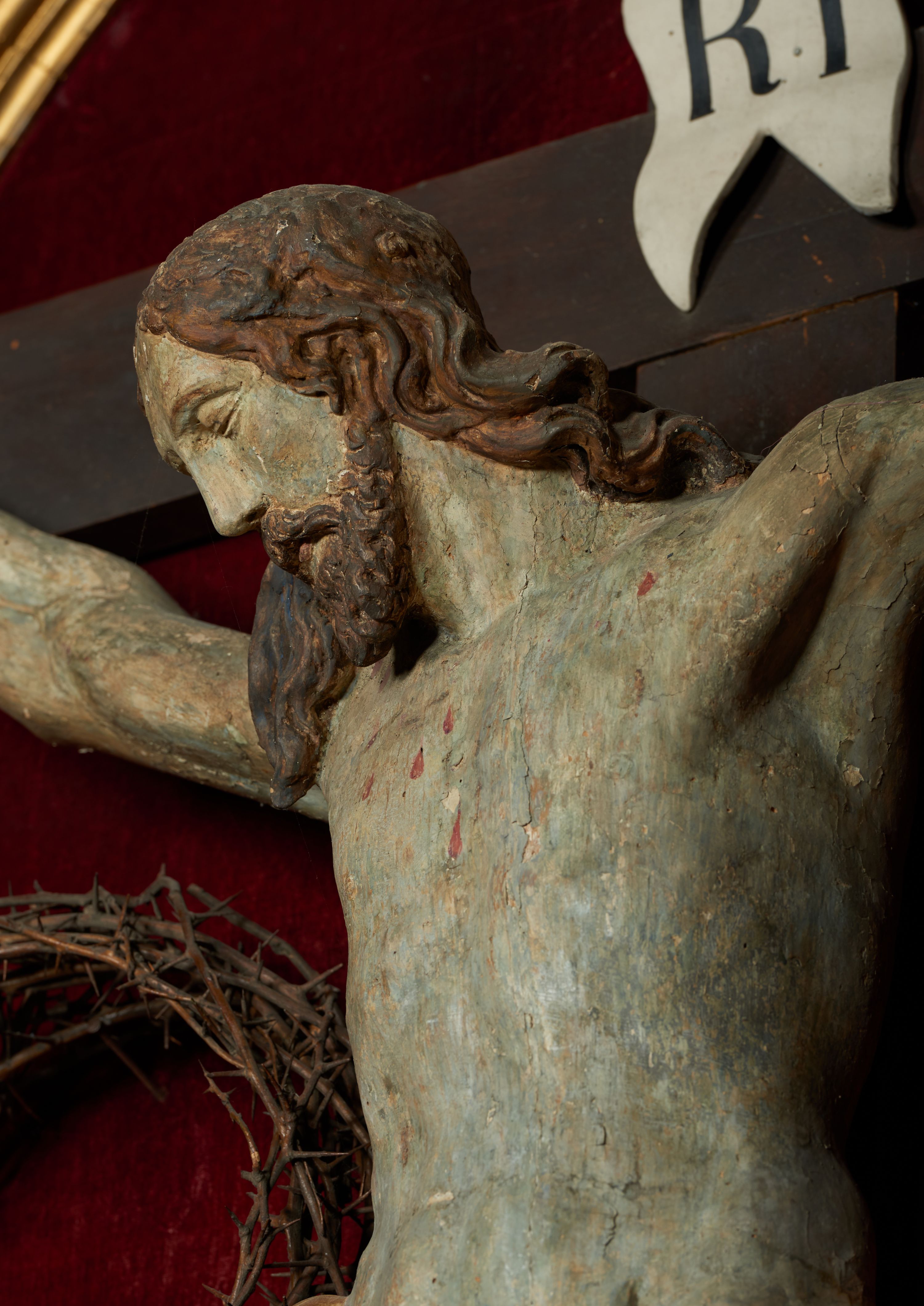 The statue of the Christ Crucified was probably created around the mid-17th century, thus for a new brick church (before 1662). The crucifix was probably located first on the chancel arch of the church, then transferred to the side altar in the fourth quarter of the 18th century, in connection with the favours for which it was famous for. At the end of the 17th and 18th centuries, due to the modernisation of temples, it was common to transfer crucifixes from the original place (i.e. from the chancel arch) and place them in other locations: in altars, on walls, in outdoor gardens, etc.