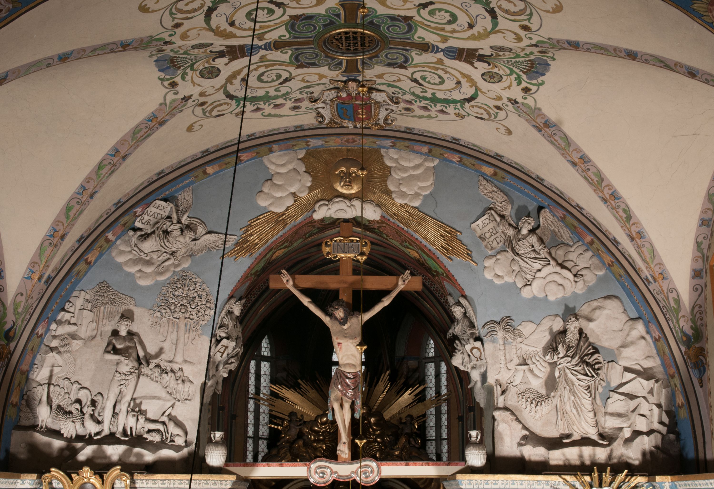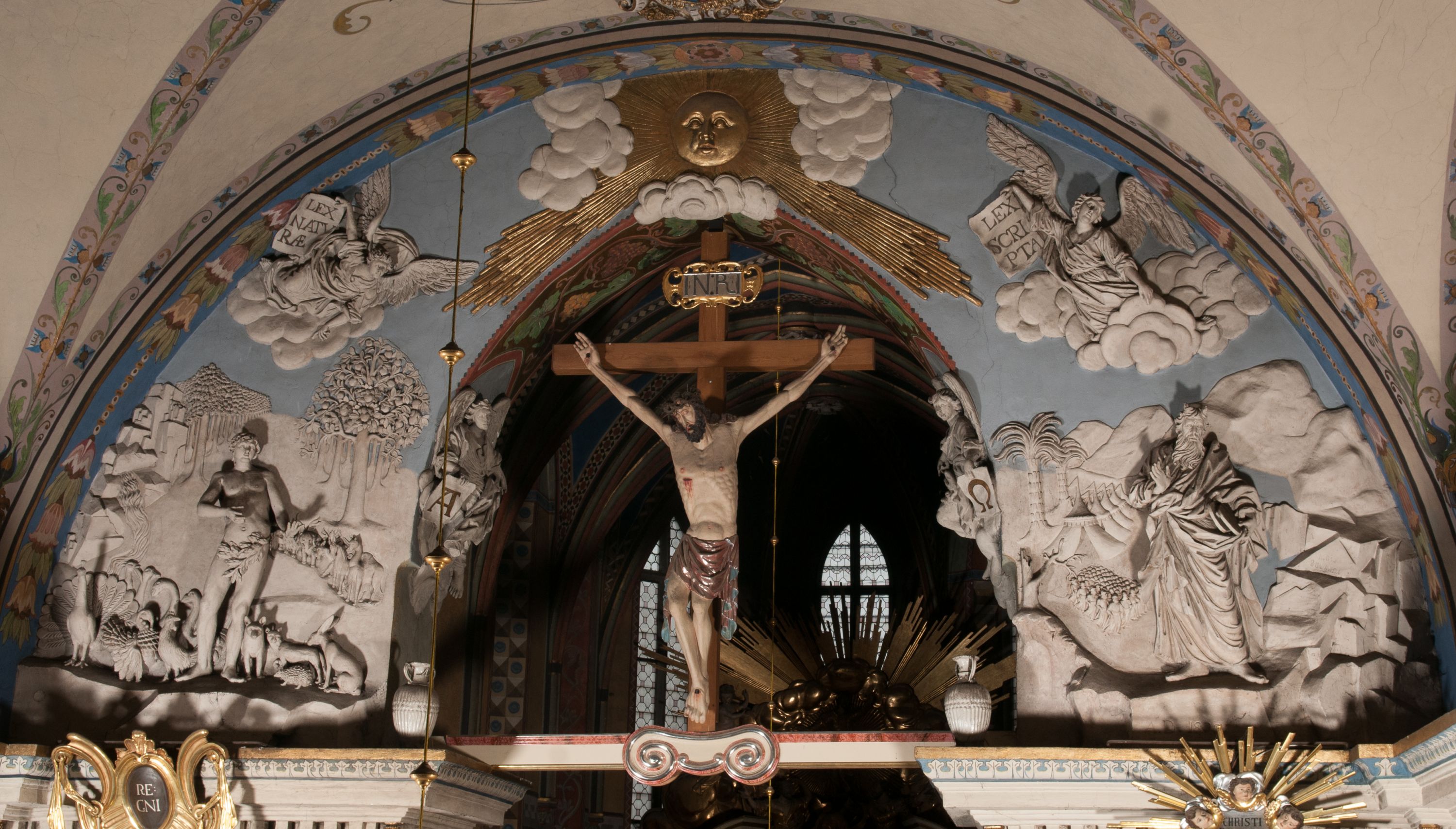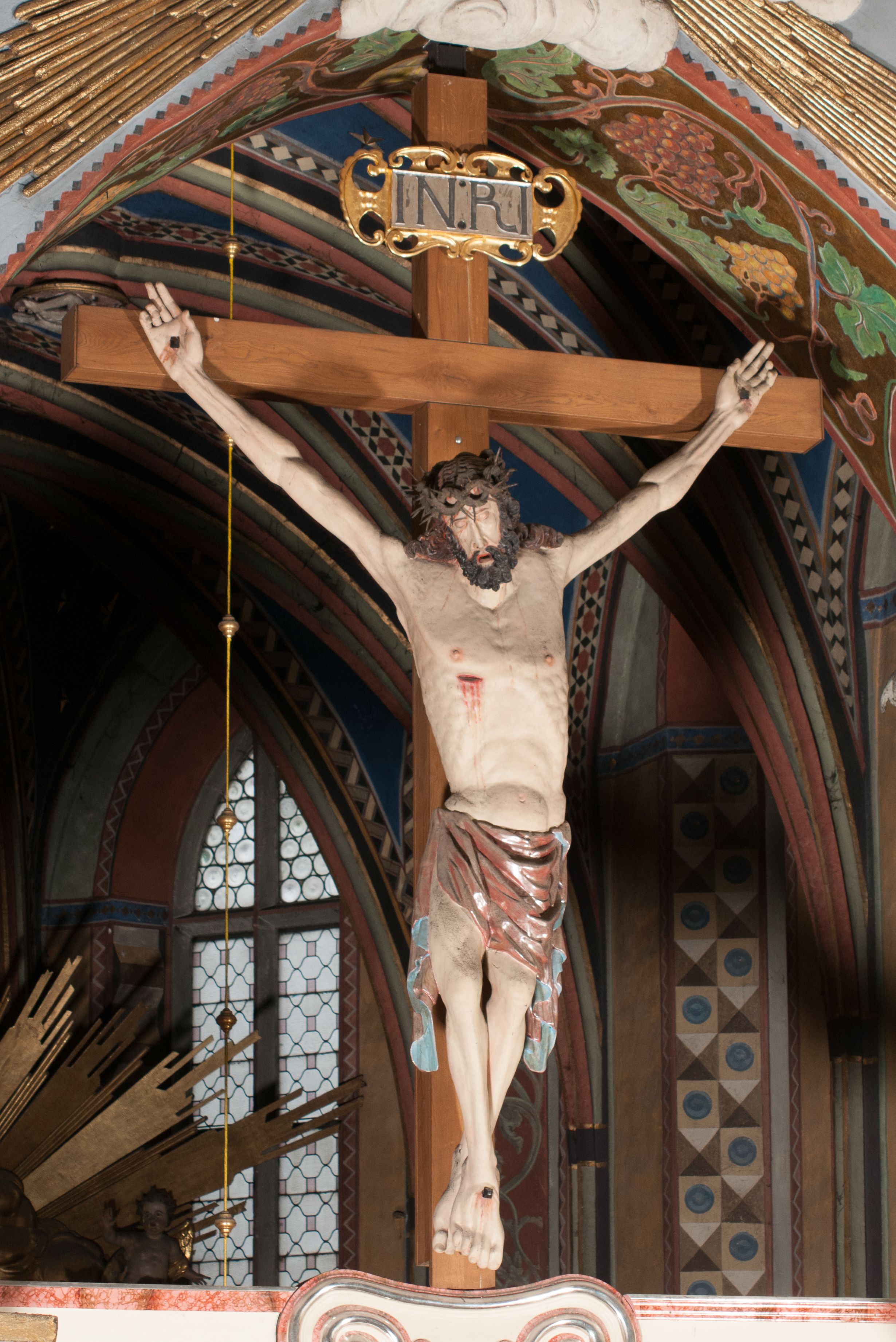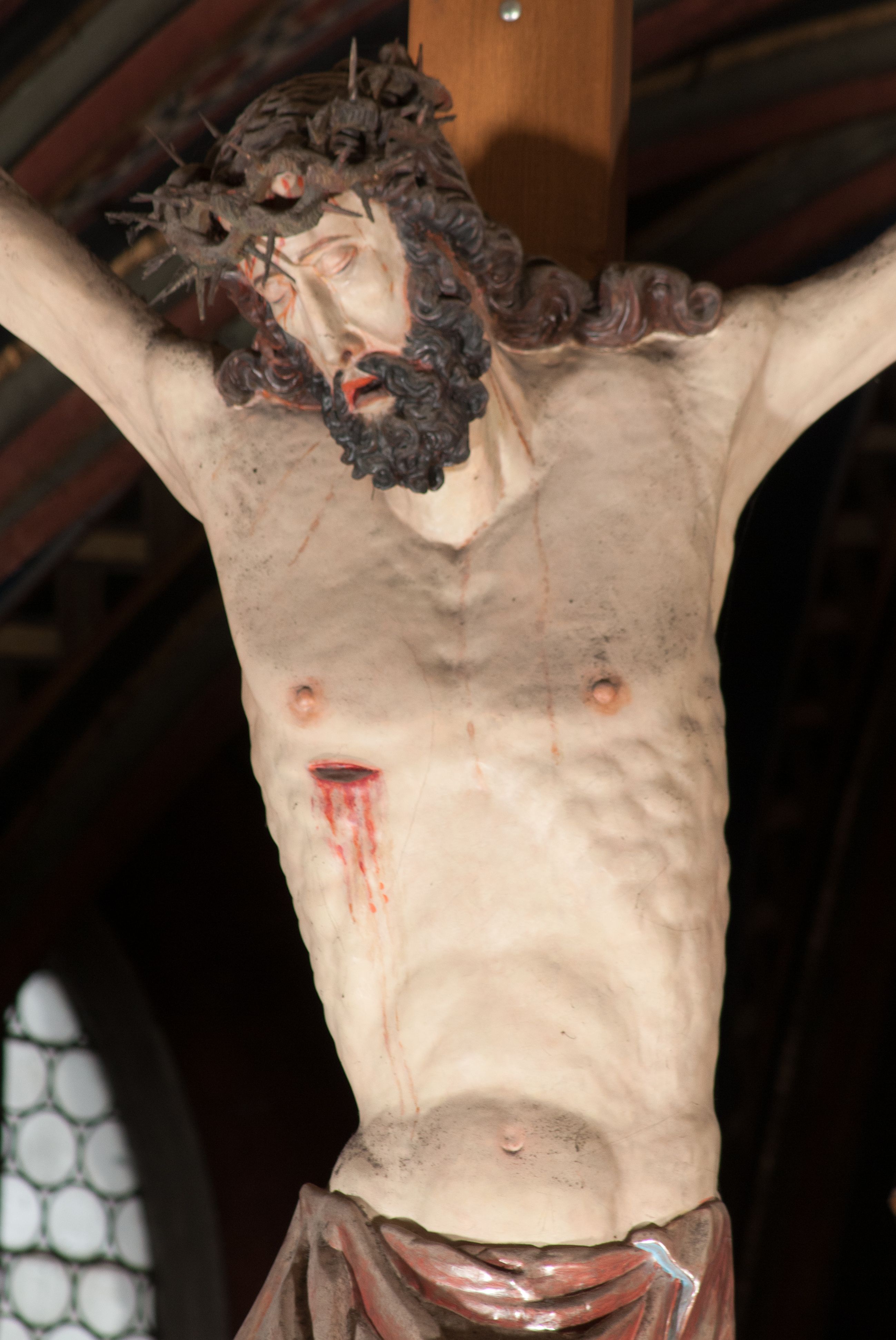 The figure of Christ Crucified was created in the second half of the 16th century, perhaps it was originally located in the former Gethsemane. In 1700, a chapel of Crucifixion, in which a crucifix was placed, was built on the outside wall of the chancel. The figure of Christ Crucified has late gothic characteristics, hence its creation may be dated back to the second half of the 16th century.