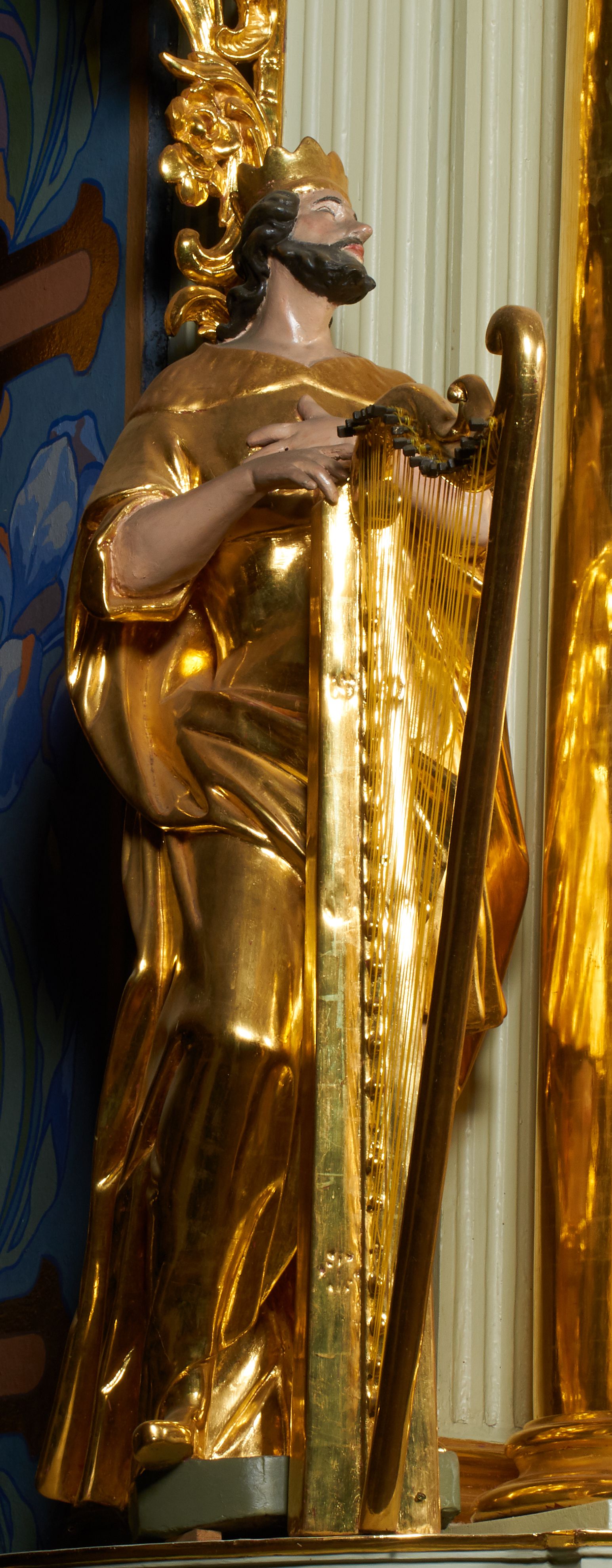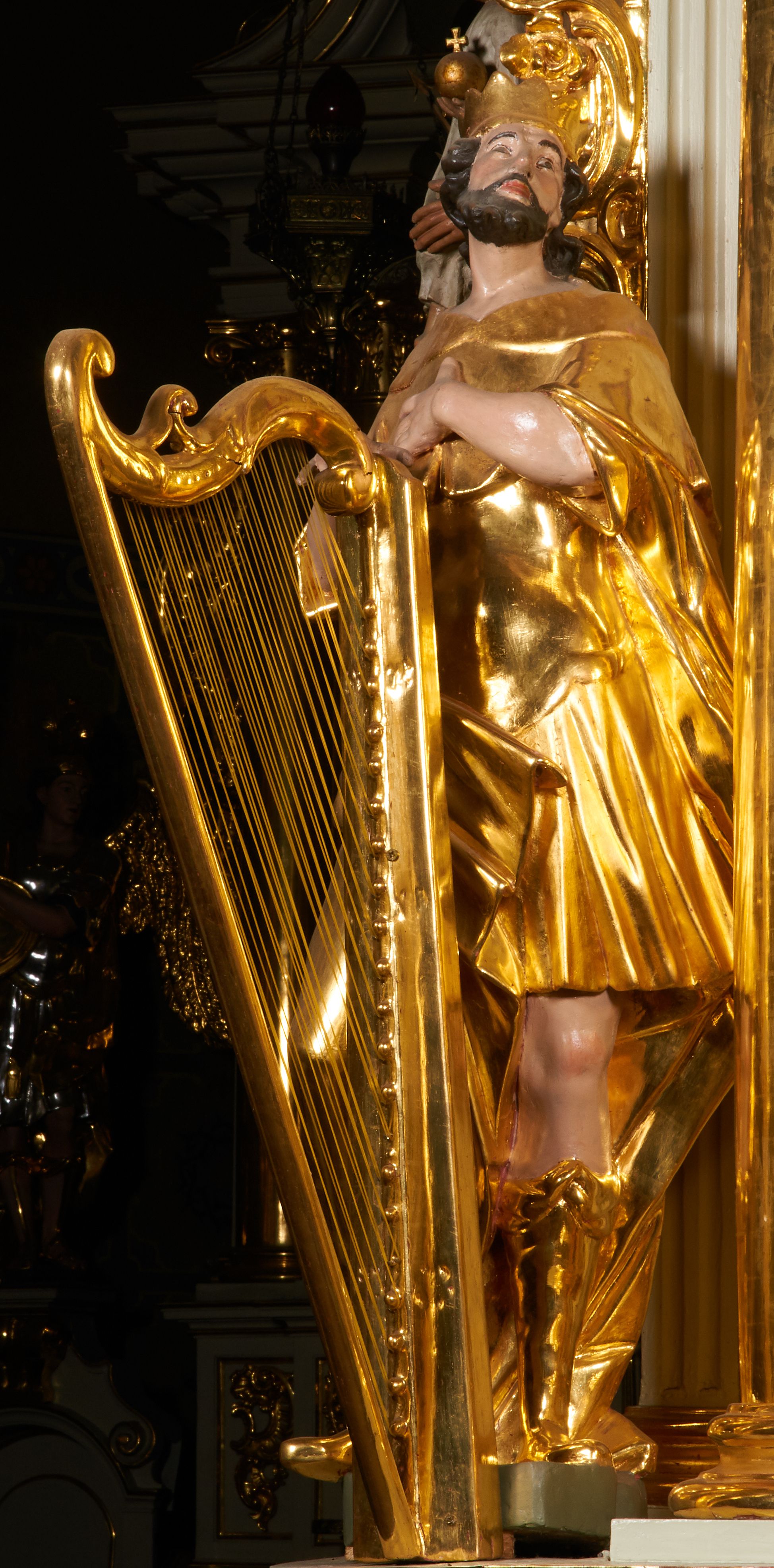 Furnishings of the church, thus 3 altars and sculptures, including the sculpture of David in question, were created in 1766 on the initiative of the then parish priest Andrzej Dominik Lipiewicz. David is a figure in the Old Testament. He was a King of Judah, a zither player and an author of Psalms. In iconography, he is portrayed in royal attire, very often with a harp as an attribute, as in the sculpture in question.