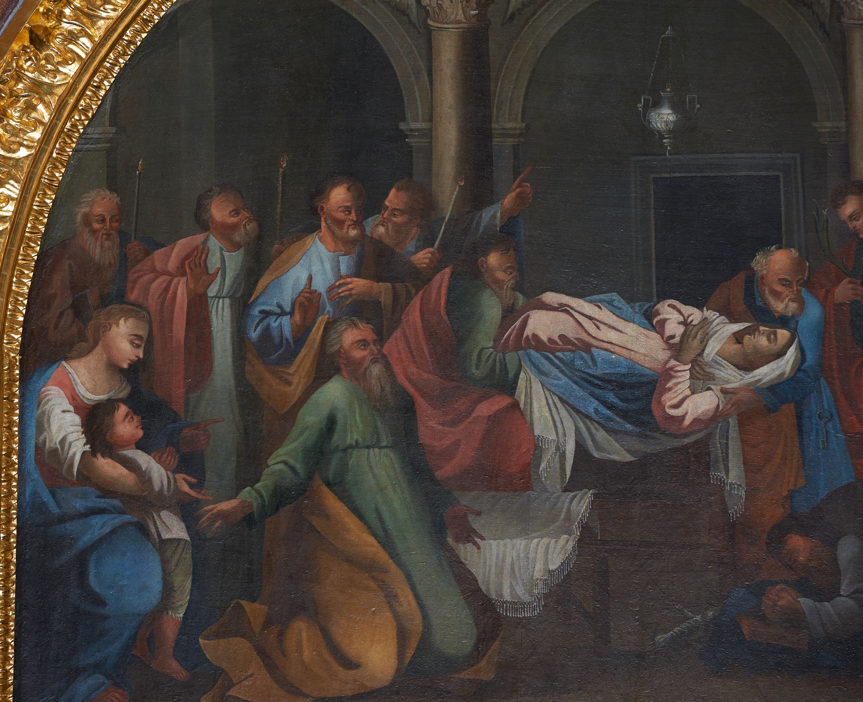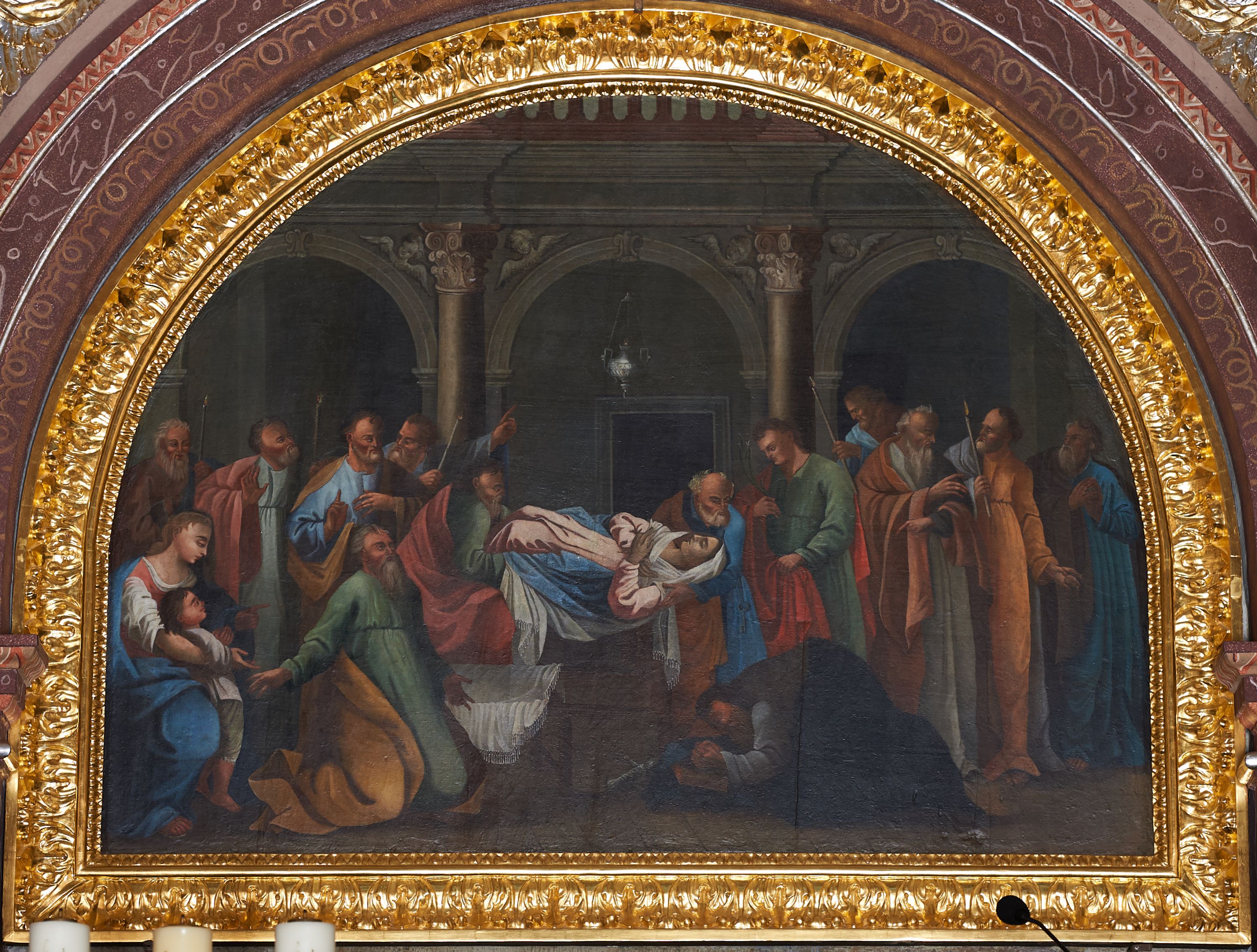 The painting depicts Dormition of the Blessed Virgin Mary. The author of the work is probably Jan Jerzyczek, the creator of a series of paintings in Calvary chapels in the first half of the 19th century.