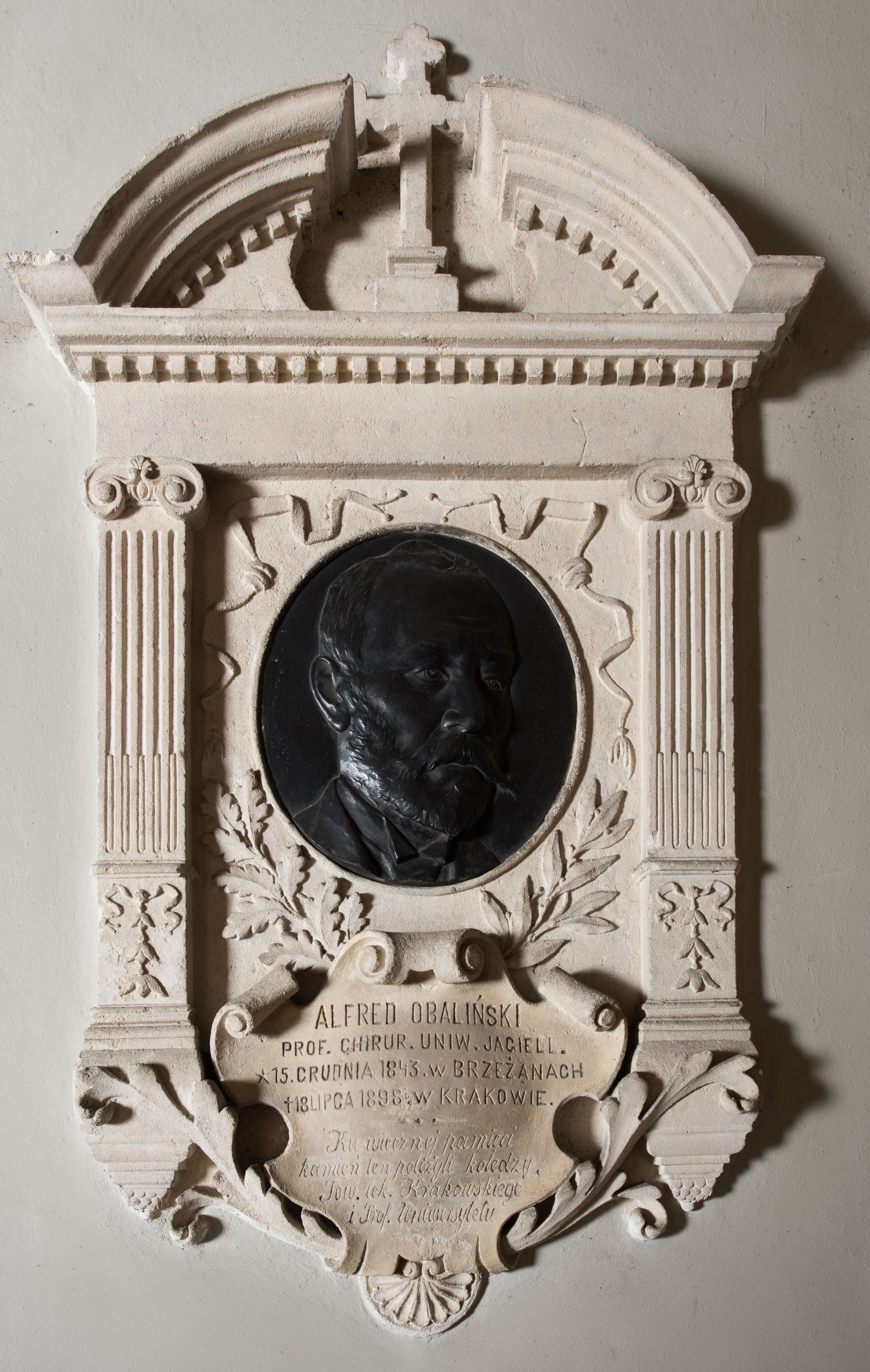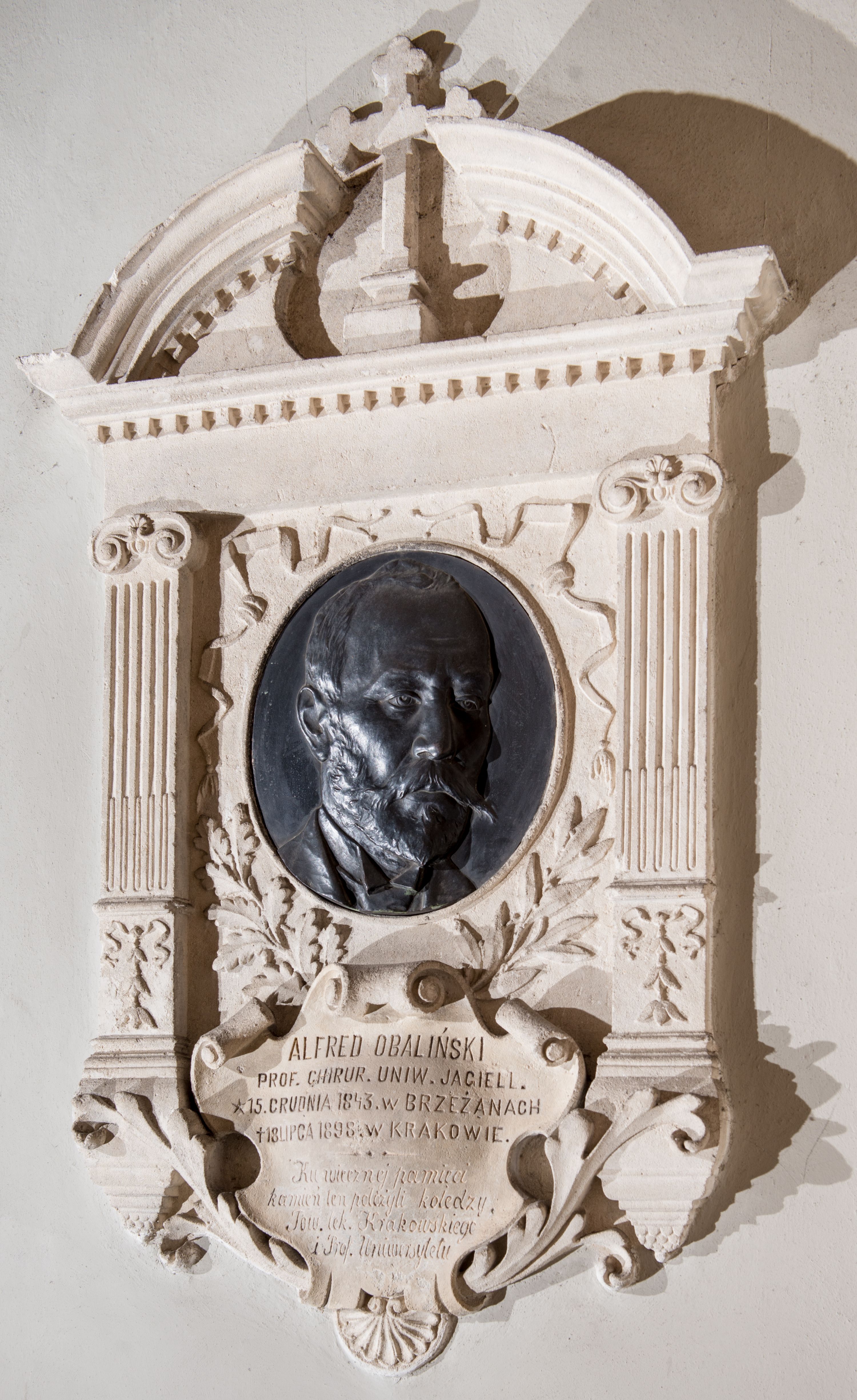 The epitaph plaque of Alfred Obaliński (1843-1898), a distinguished doctor of surgery at the Jagiellonian University, was made by Cracovian sculptor, a professor at the Alfred Daun Academy of Fine Arts. The work is maintained in a traditional, neo-Renaissance stylistic convention, referring both in its structure and material (Pińczów limestone) to works from the 16th century.