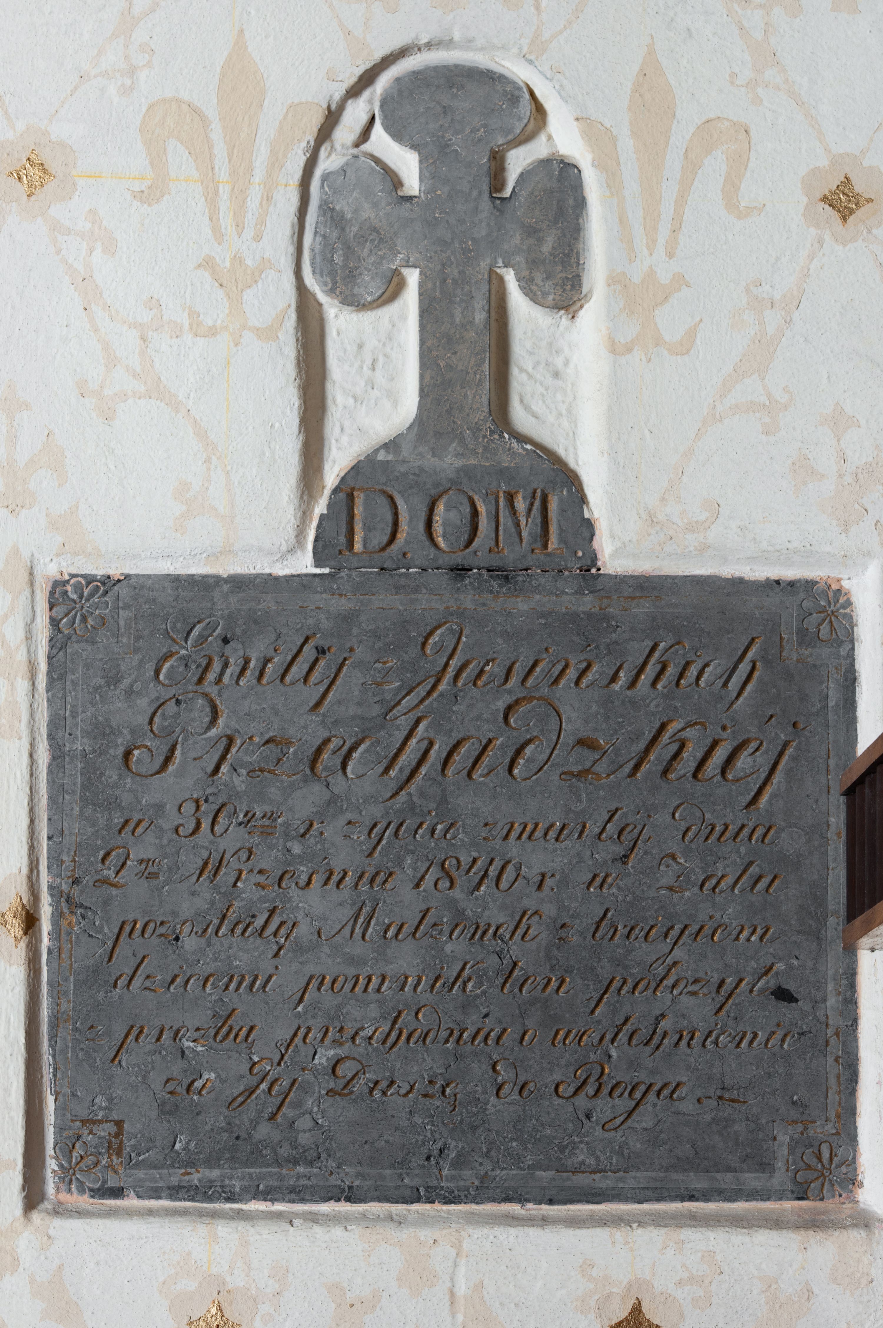 Epitaph plaque created in 1840, dedicated to Emilia (née Jasińska) Przechadzka. The work is characterised by simplicity of form and sparingly used means of expression. The content of the epitaph plaque expresses the sorrow and sadness of the family left by the deceased, which refers to a number of similar commemorative plaques.