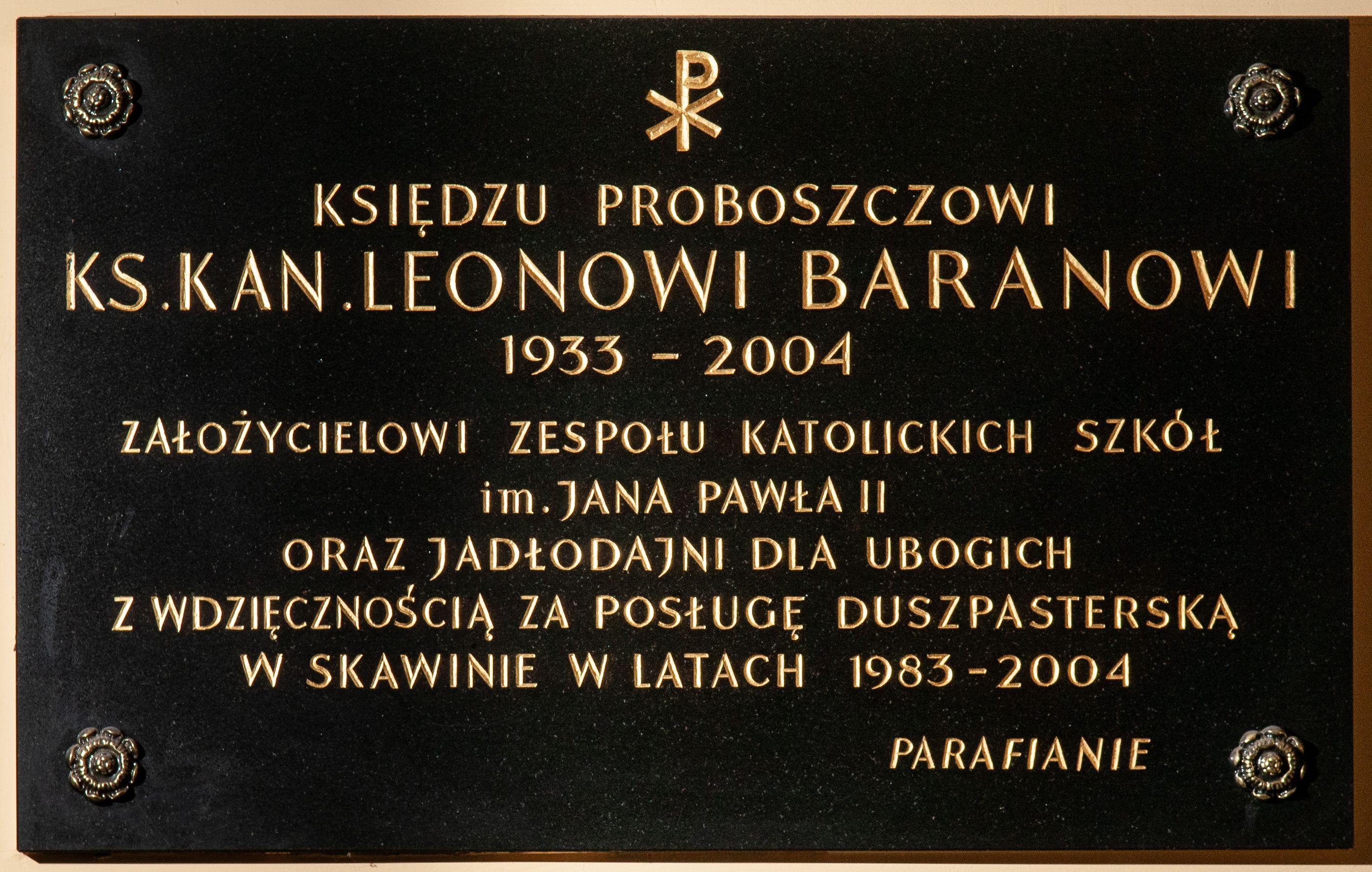 The epitaph plaque commemorates father Leon Baran who founded a complex of Catholic schools, eating place, as well as he contributed to improvement of condition of the church dedicated to the Presentation of the Blessed Virgin Mary and regularly celebrated the mass for his country.